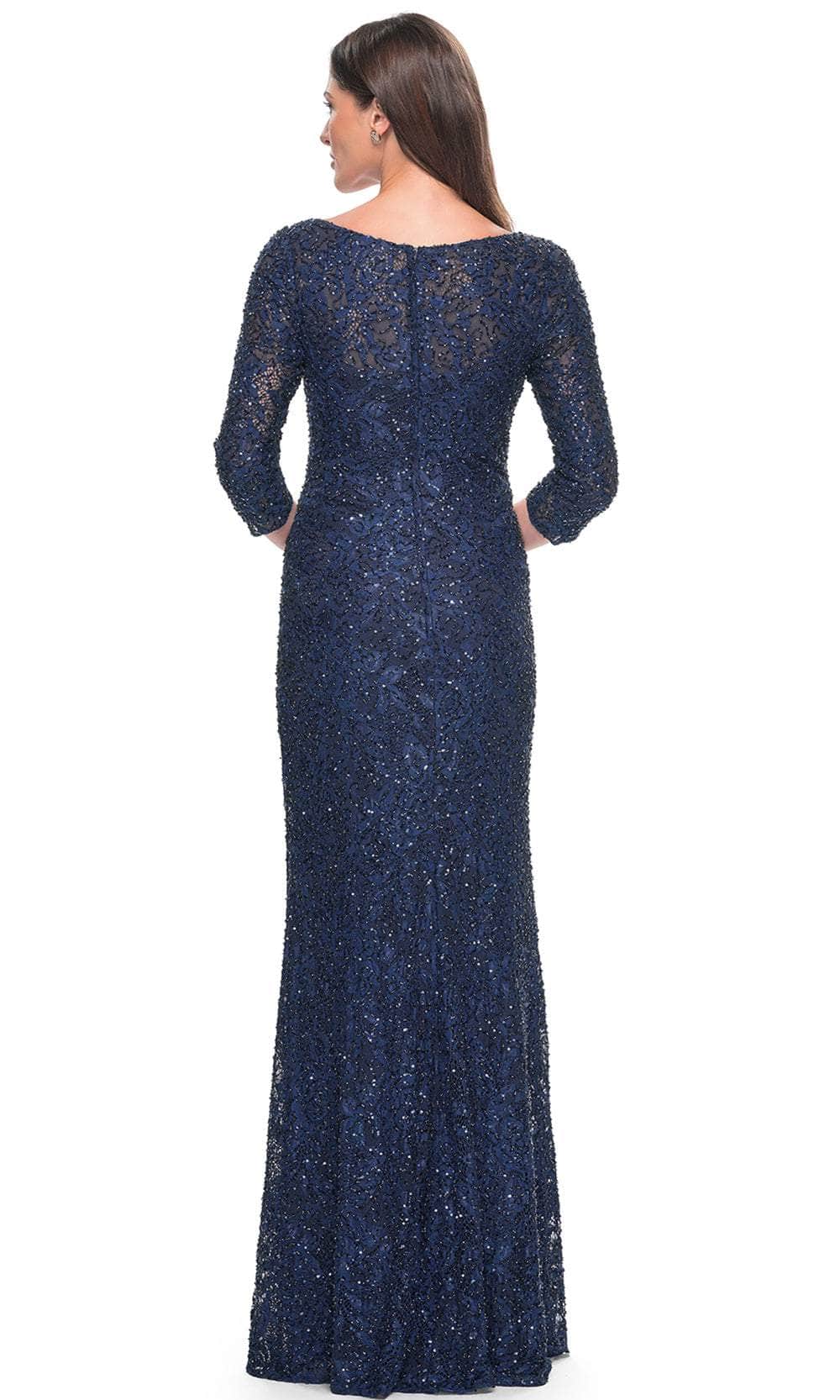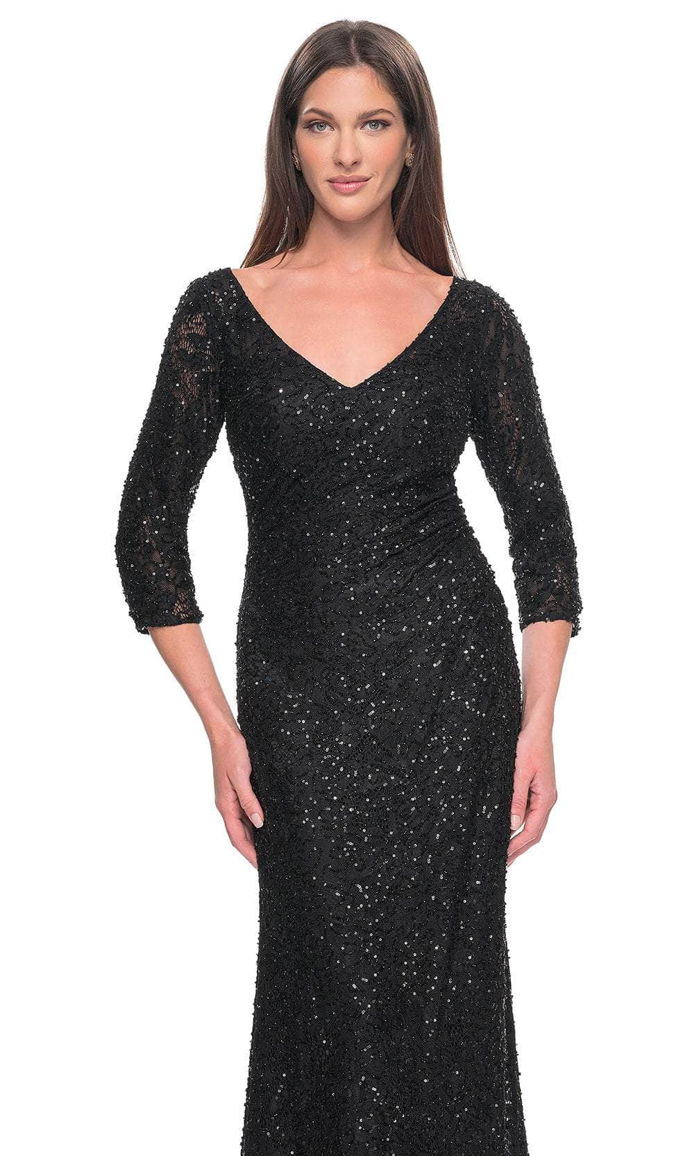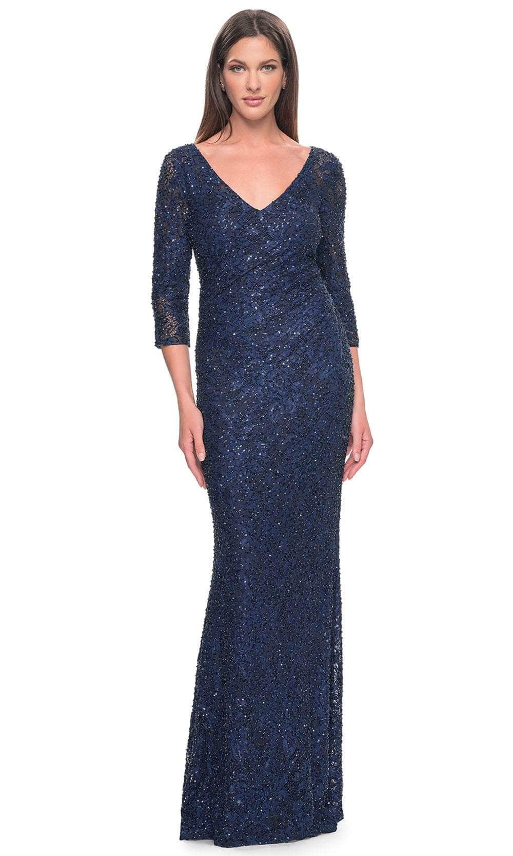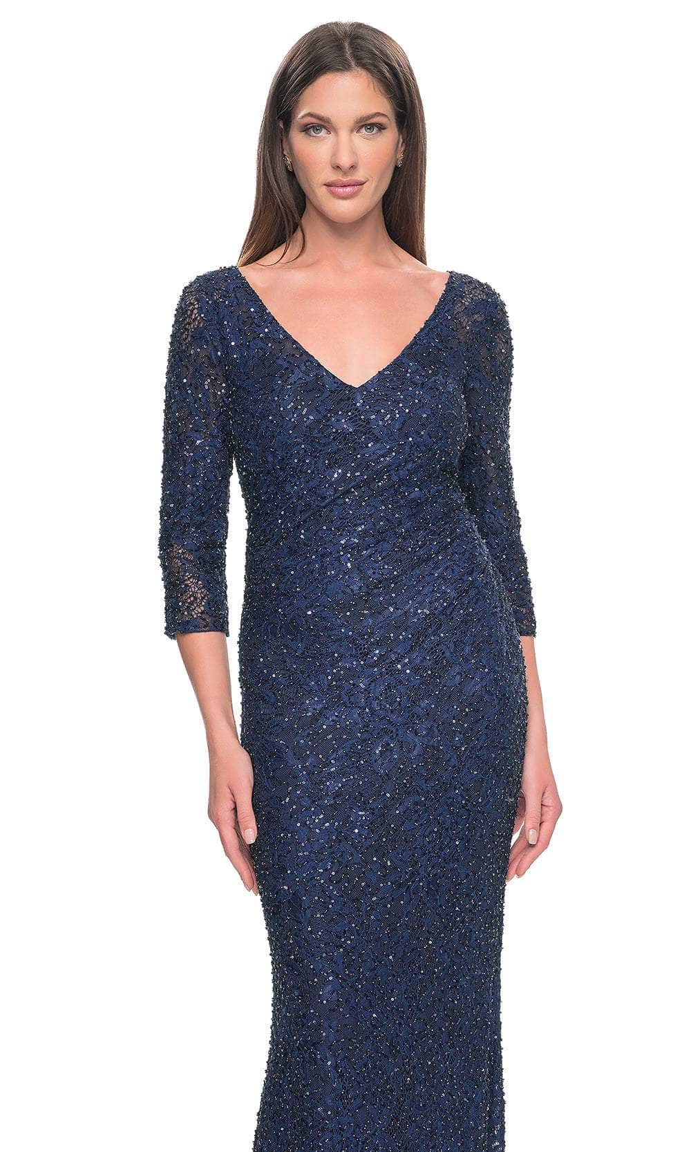 Dazzle like you have never done before in this La Femme 31721 creation. The gown is carefully crafted to enhance the feminine silhouette, showcasing a fitted stretch beaded lace with tailoring details on a fitted silhouette. Adorned with drape details and rhinestone details, the evening gown features flattering side ruching, complemented by a v-neckline and quarter sleeves. The back reveals a full design with a concealed zipper closure, while the sheath skirt gracefully flows into a floor-length hemline. Delight in the elegance of this La Femme 31721 masterpiece. Models are wearing the Black, Gunmetal, and Navy colors.