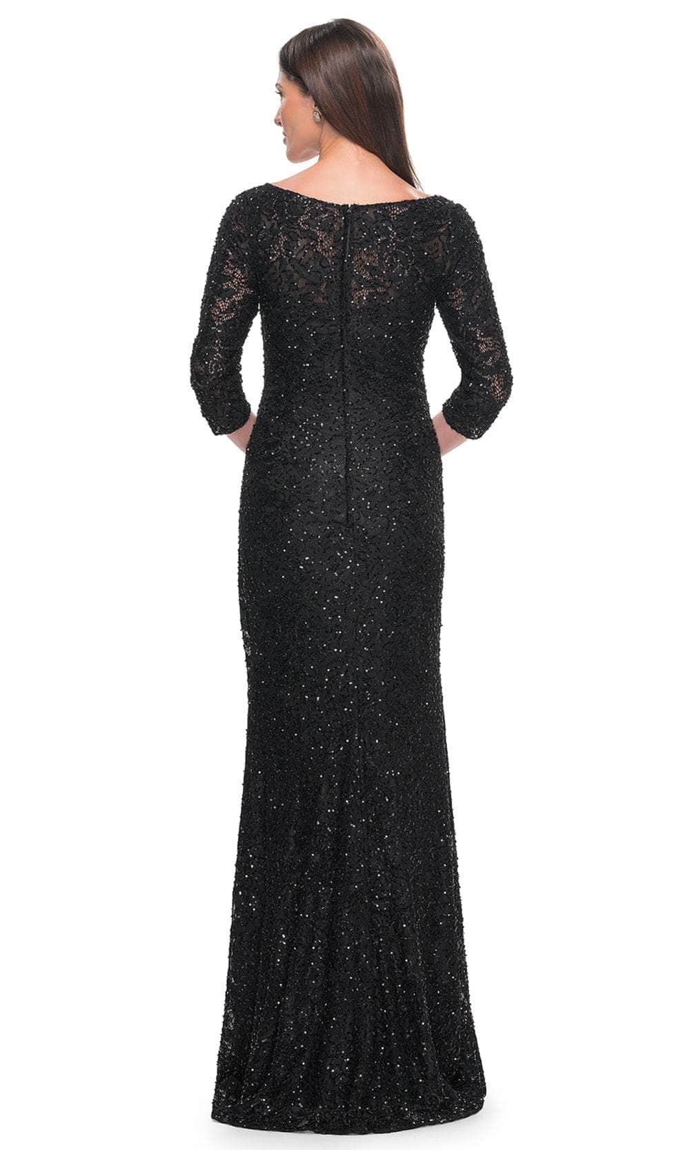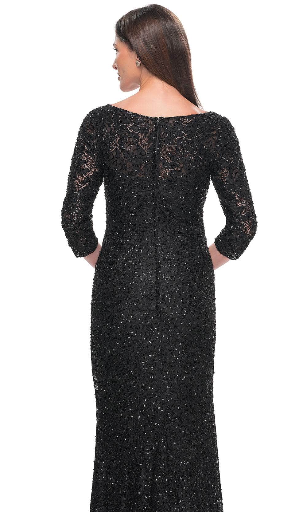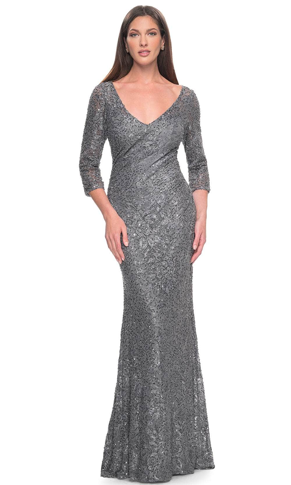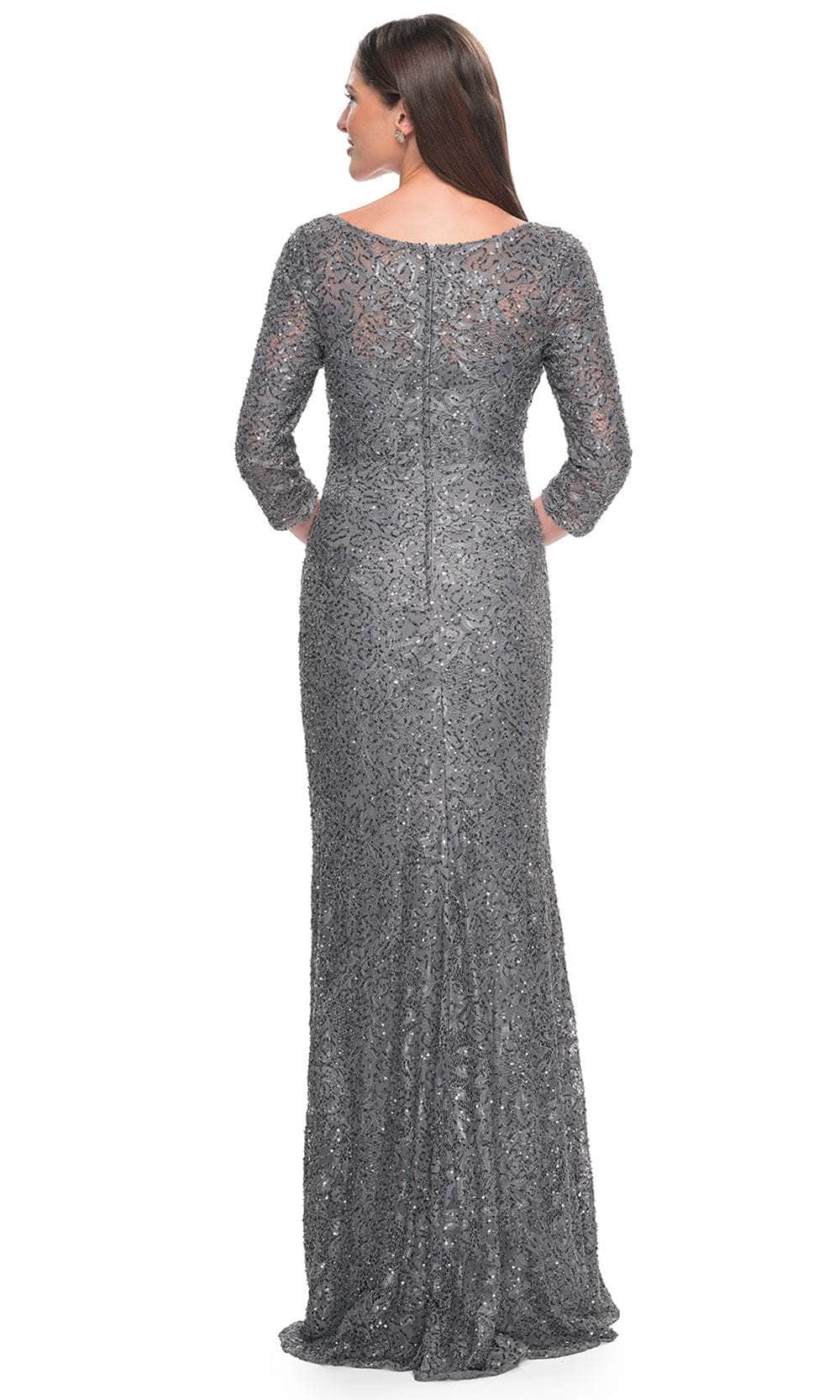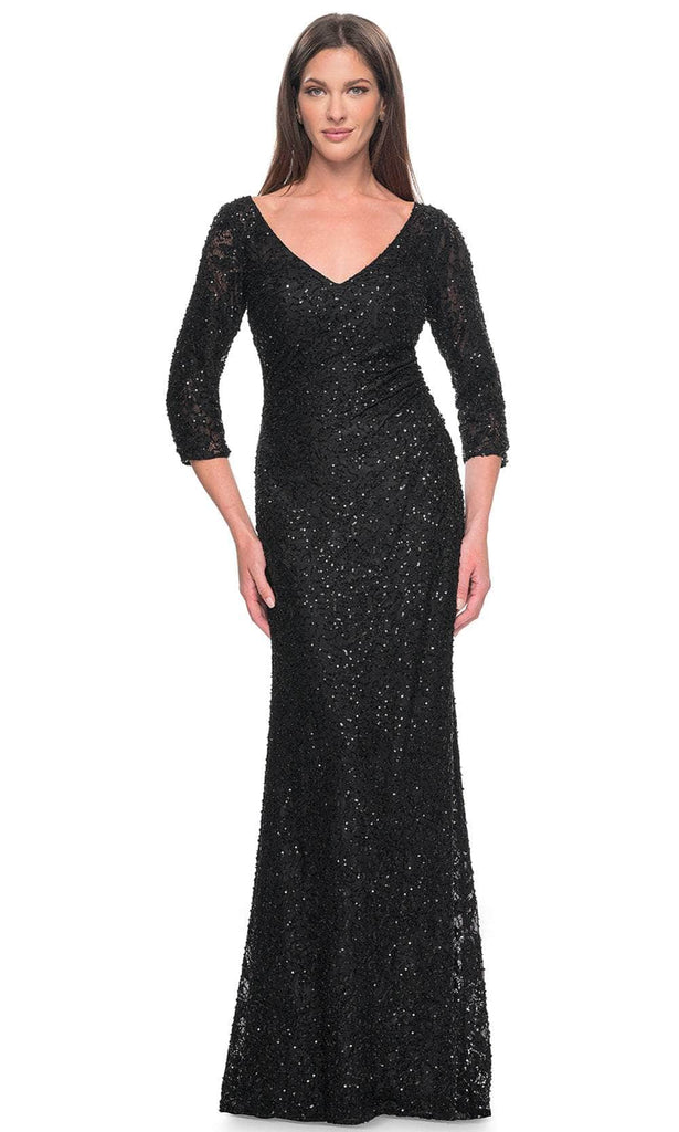 Dazzle like you have never done before in this La Femme 31721 creation. The gown is carefully crafted to enhance the feminine silhouette, showcasing a fitted stretch beaded lace with tailoring details on a fitted silhouette. Adorned with drape details and rhinestone details, the evening gown features flattering side ruching, complemented by a v-neckline and quarter sleeves. The back reveals a full design with a concealed zipper closure, while the sheath skirt gracefully flows into a floor-length hemline. Delight in the elegance of this La Femme 31721 masterpiece. Models are wearing the Black, Gunmetal, and Navy colors.