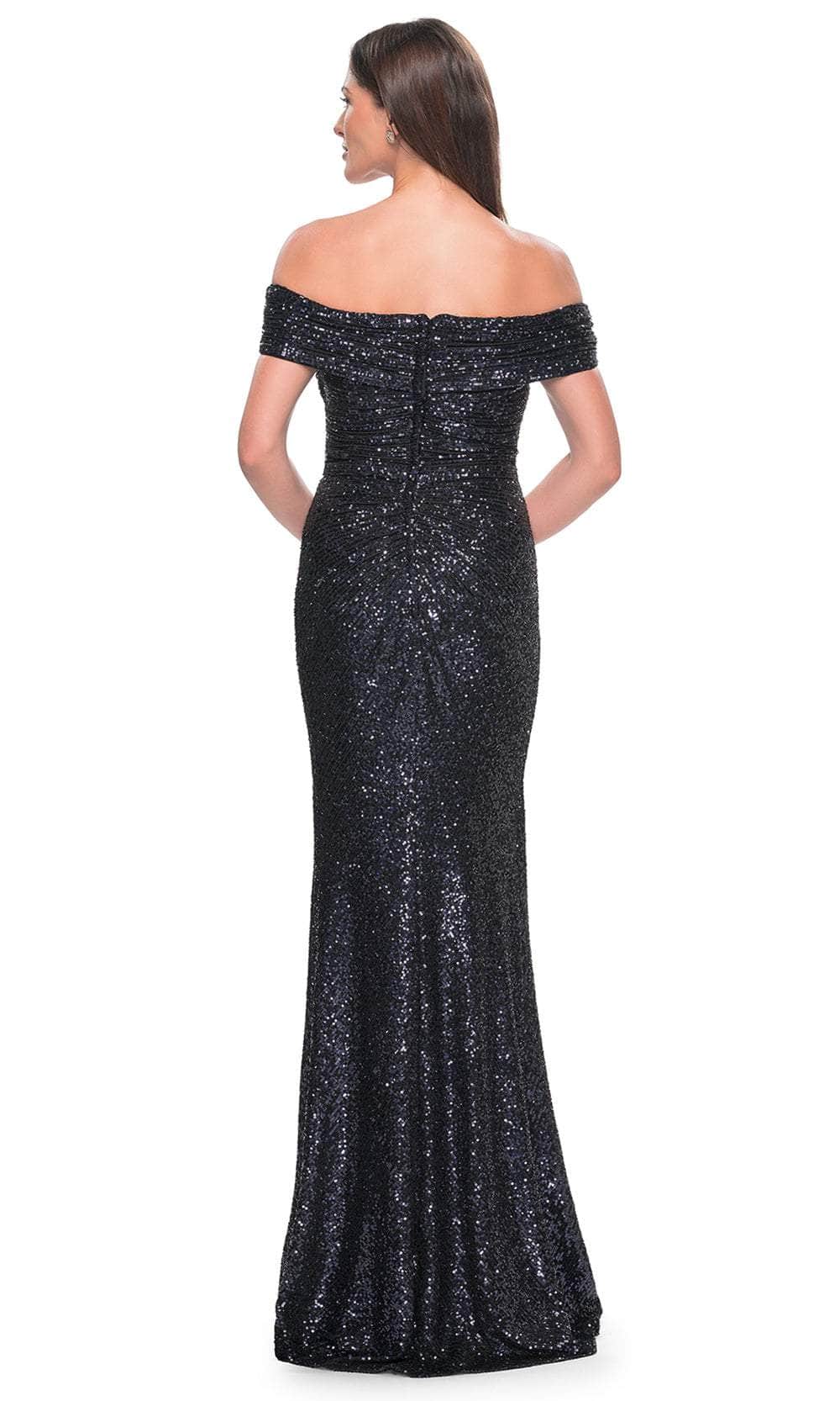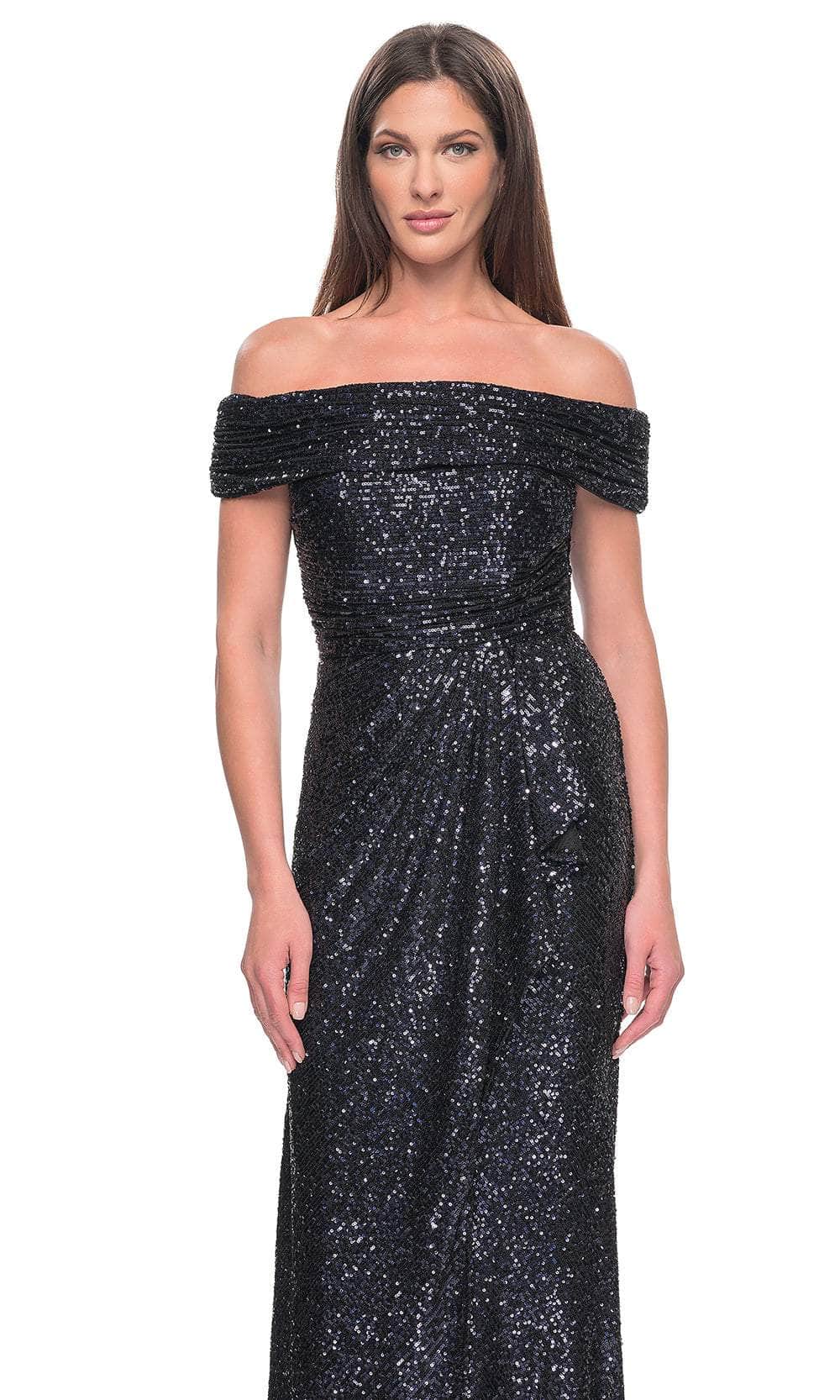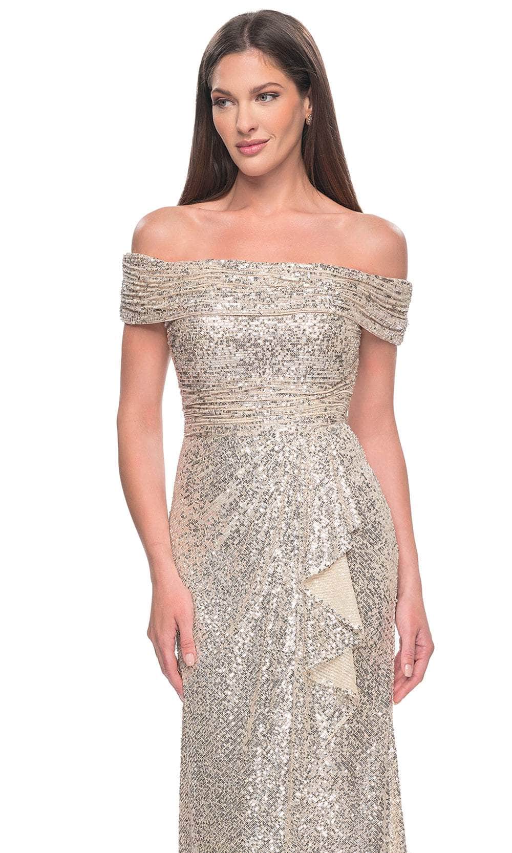 Radiate a captivating charm destined to enchant the elite in the stunning La Femme 31772 evening gown. Featuring an enchanting off-shoulder neckline atop a figure-flattering bodice, it accentuates your already remarkable figure. The full back, enclosed by a zipper, showcases elegant ruching detail, complementing the natural waistline. Additionally, a ruffle effect adorns the full-length sheath skirt, amplifying the overall allure. Adorned entirely with sequins, this dress ensures you will shine throughout the night. Prepare to unveil your glamorous side in this masterpiece, La Femme 31772. Models are wearing Navy, and Silver colors.