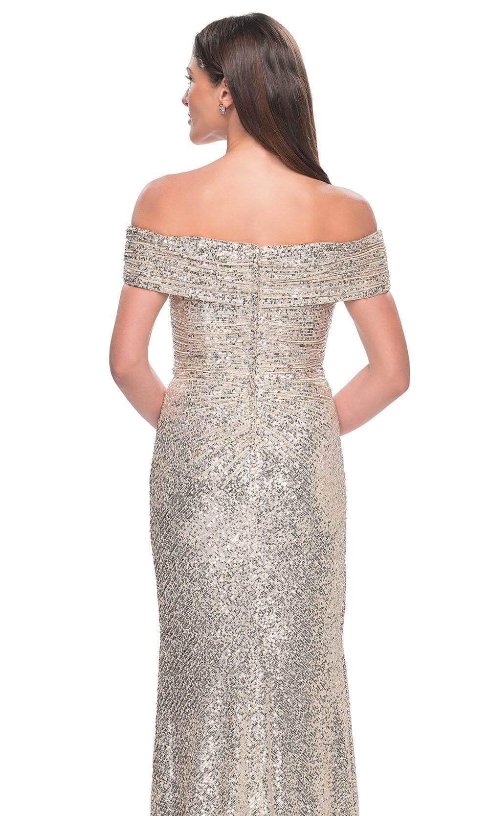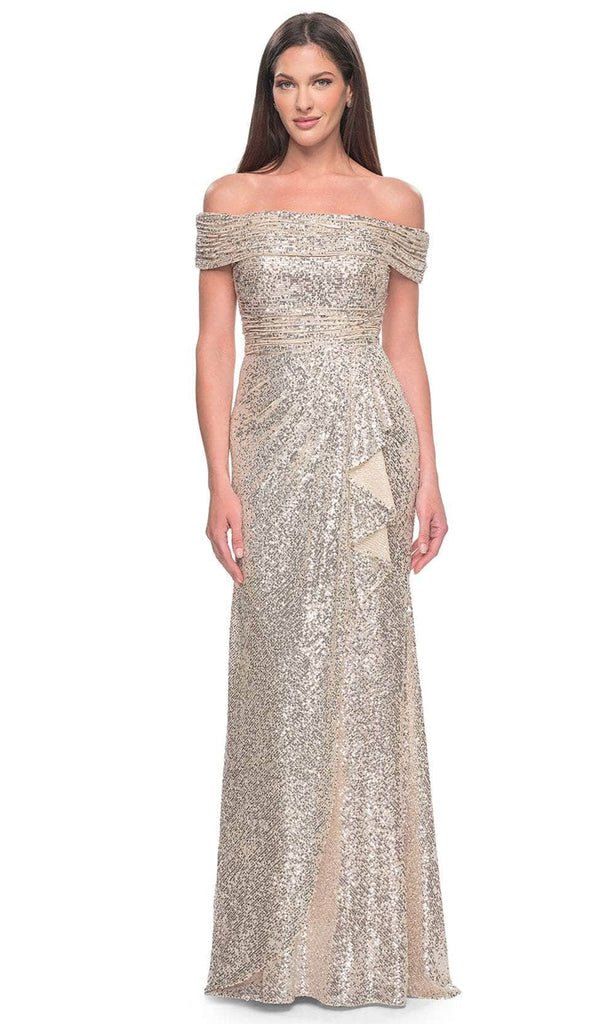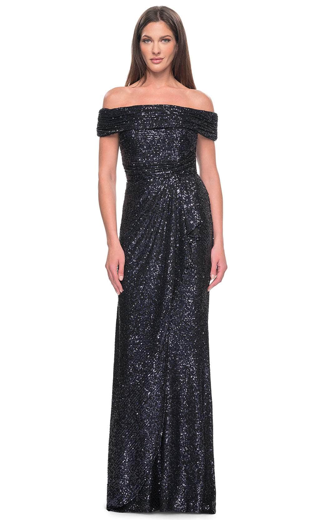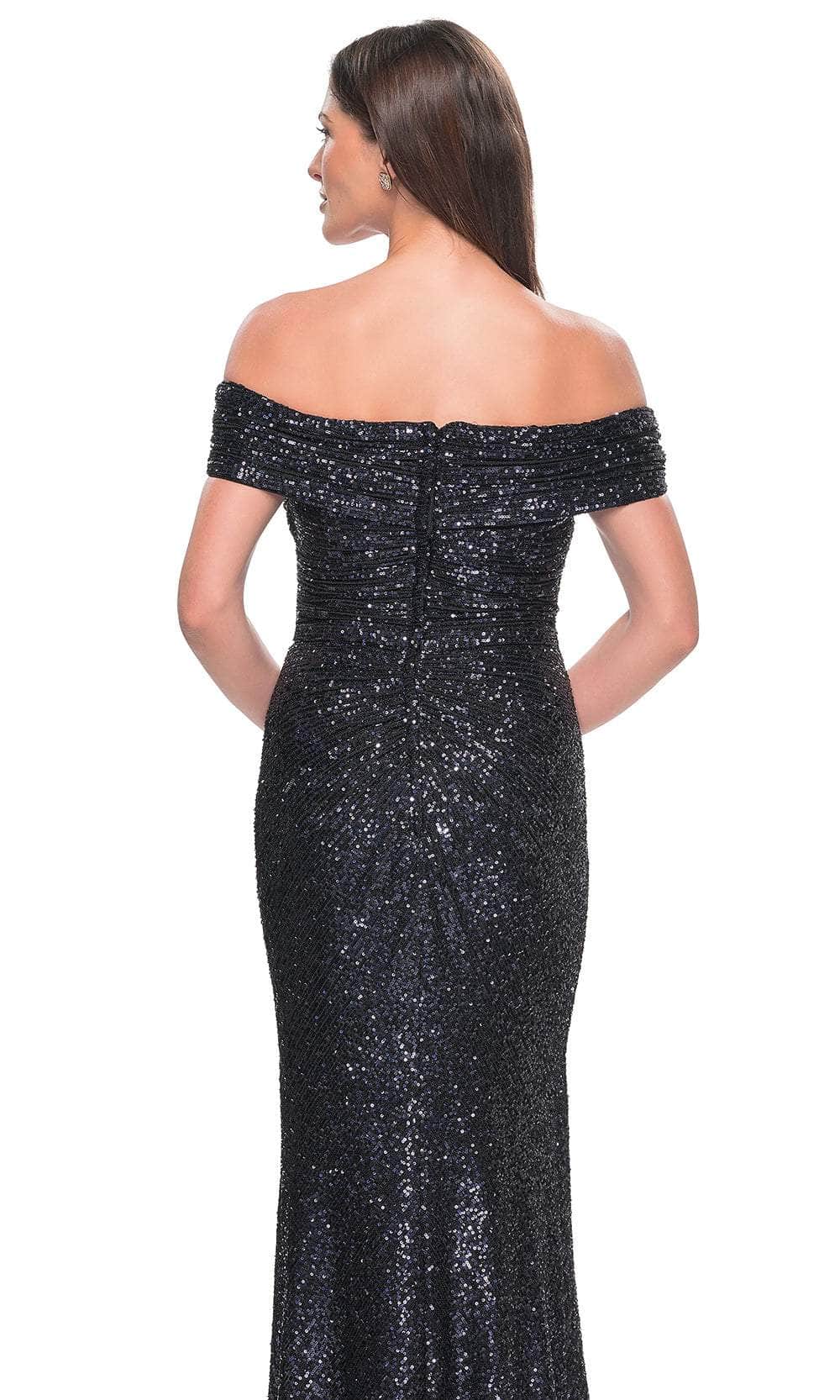 Radiate a captivating charm destined to enchant the elite in the stunning La Femme 31772 evening gown. Featuring an enchanting off-shoulder neckline atop a figure-flattering bodice, it accentuates your already remarkable figure. The full back, enclosed by a zipper, showcases elegant ruching detail, complementing the natural waistline. Additionally, a ruffle effect adorns the full-length sheath skirt, amplifying the overall allure. Adorned entirely with sequins, this dress ensures you will shine throughout the night. Prepare to unveil your glamorous side in this masterpiece, La Femme 31772. Models are wearing Navy, and Silver colors.