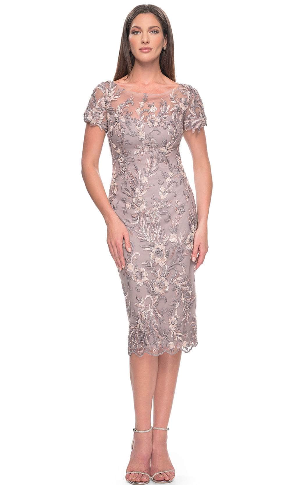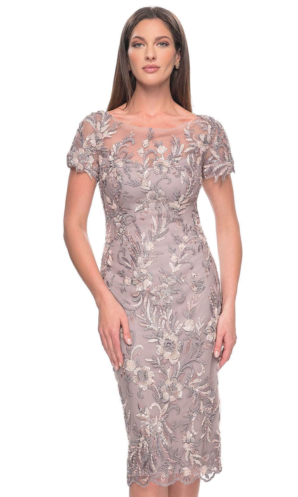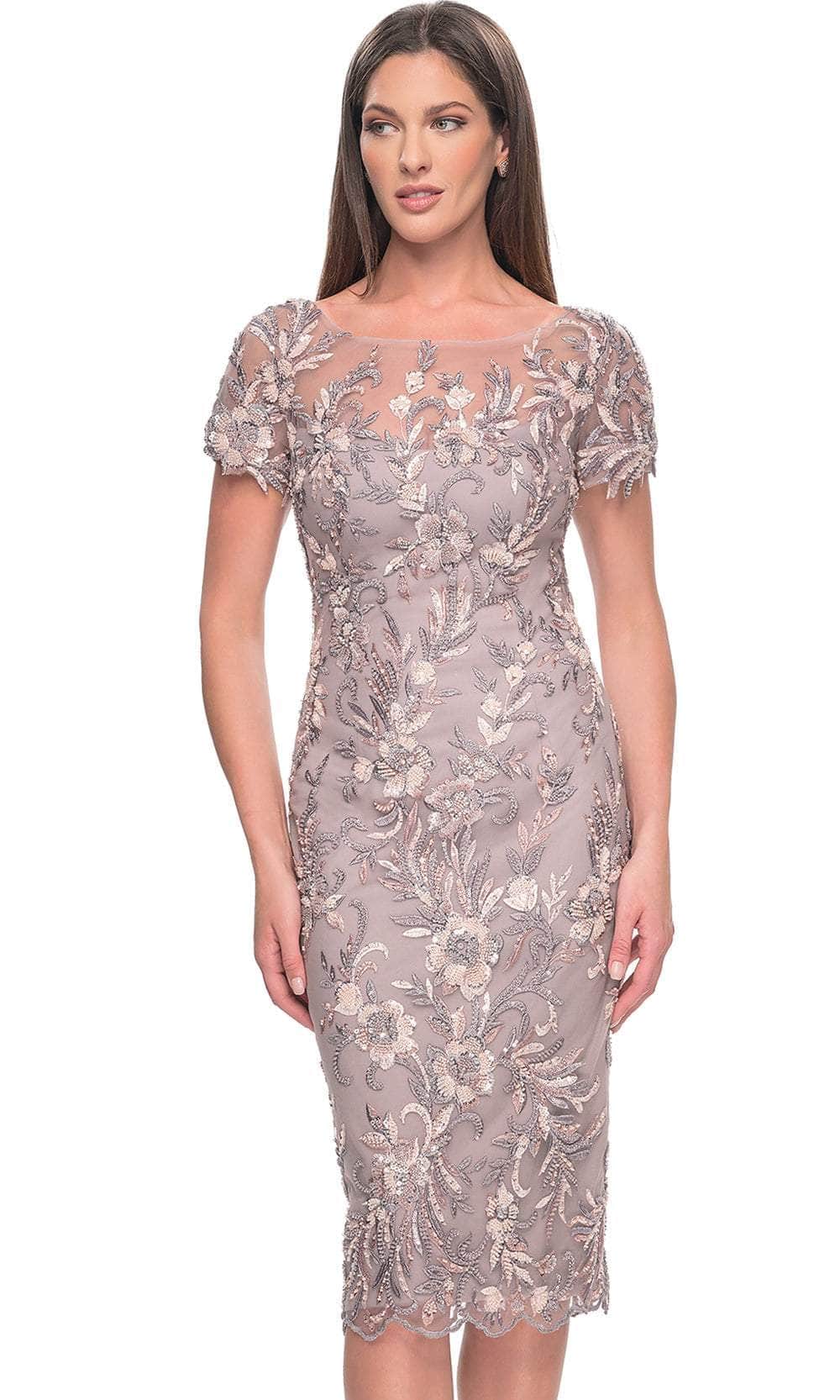 Radiate elegance in La Femme 31775, a knee-length dress adorned with a beautiful and intricate beaded lace design. The top boasts an illusion bateau neckline and charming short sleeves, adding an enchanting touch. Secured with a back zipper closure, the dress ensures a flawless fit. The knee-length skirt gracefully parades in a sheath silhouette, completing the ensemble with timeless sophistication. La Femme 31775 is a perfect choice for those who appreciate refined details and desire a chic presence at any special occasion.