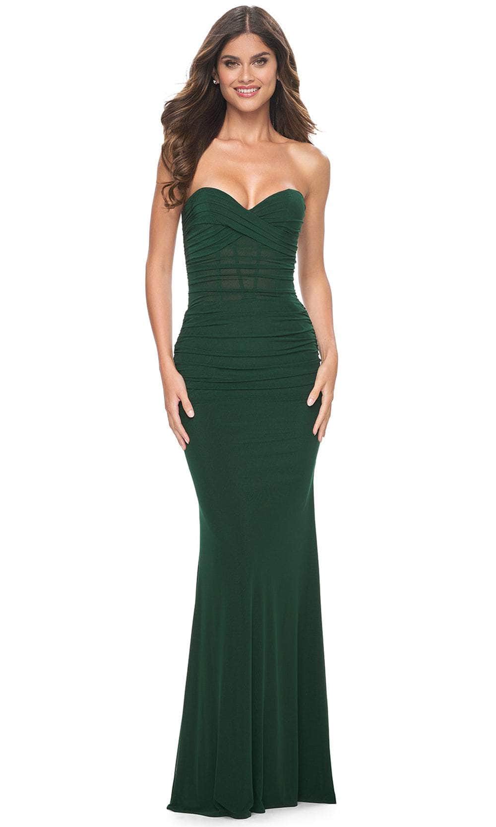 Grace every party with classic sophistication with our breathtaking La Femme 31899 creation. Crafted to perfection, this mesmerizing gown features an allover design with tailoring lines, boasting a net jersey silhouette embellished with delicate ruching for a refined finish. The strapless bodice showcases a sweetheart neckline, complemented by a crisscross bust design and a sheer midriff, adding a hint of allure. The waist is elegantly nipped to accentuate your curves, while the midrise back features a concealed zipper closure for a seamless look. The skirt flows into a stunning mermaid silhouette and a sweeping train that exudes elegance with every step. Elevate your style and captivate attention at any event with the exquisite La Femme 31899 masterpiece. Models are wearing the Black, Dark Berry, and Emerald colors.