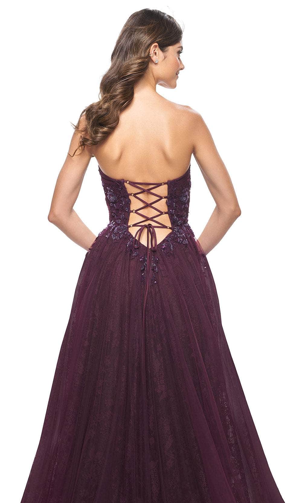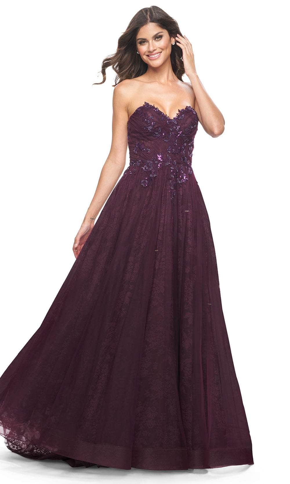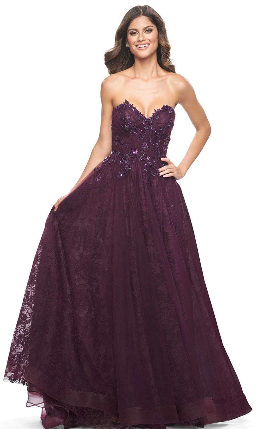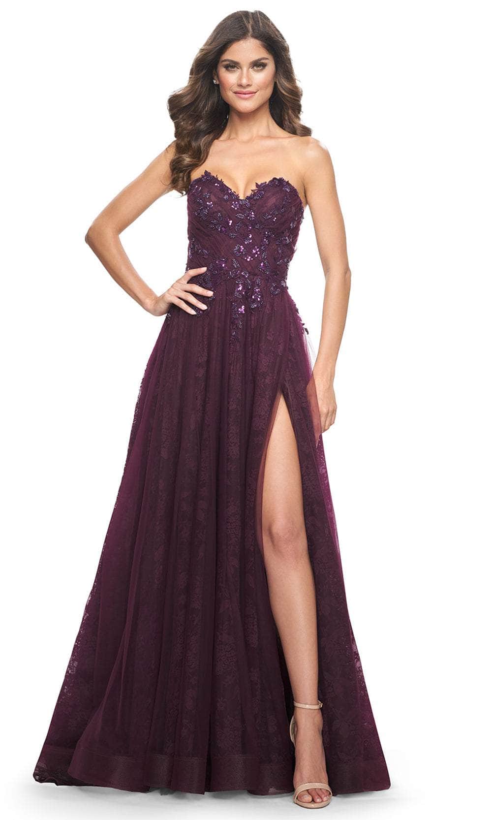 Impress the crowd with your beauty as you don this La Femme 31954 creation. Made from luxurious lace and tulle fabric, this strapless beauty is decorated with eye-catching floral lace appliques and sparkling beaded sequins. The sweetheart neckline draws attention to your collarbones, while the corset lace-up back provides a flattering fit. The front high slit and horsehair hem add a touch of drama to the classic A-line silhouette. It ends in a sweeping train that trails from behind. This La Femme 31954 dress will make your special event unforgettable. Models are wearing Black, and Dark Berry colors.