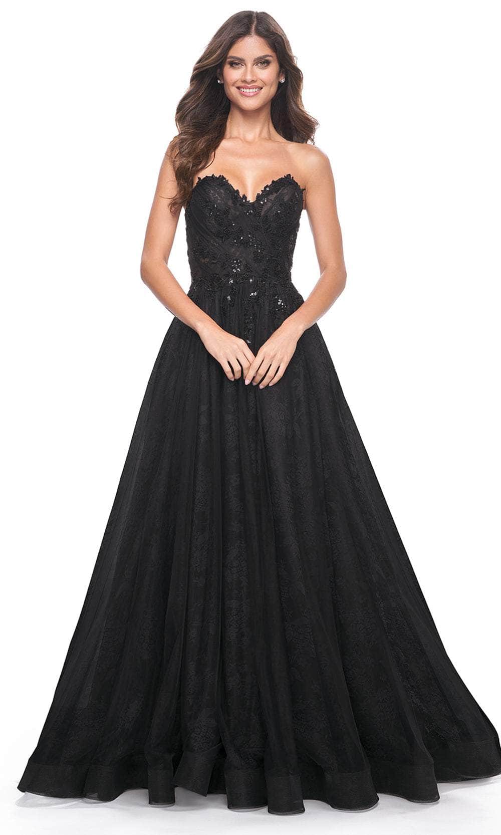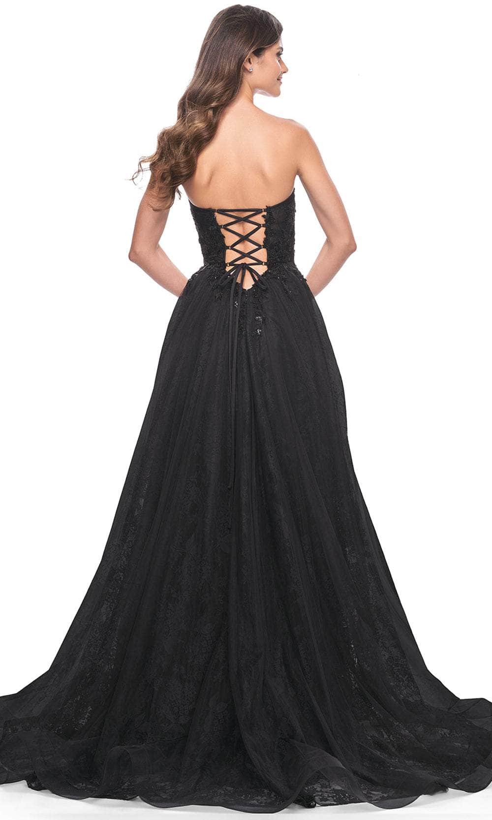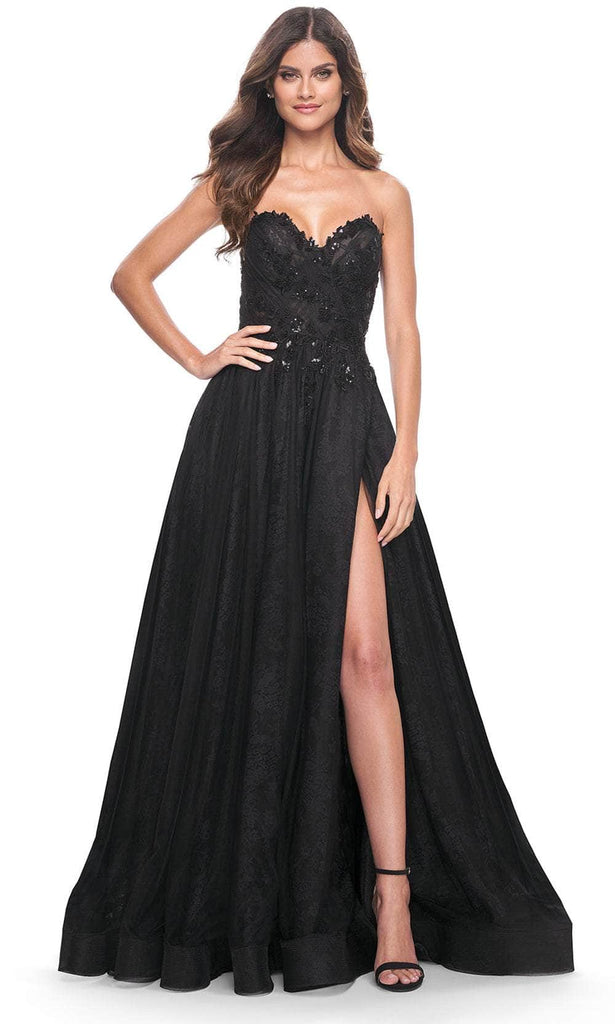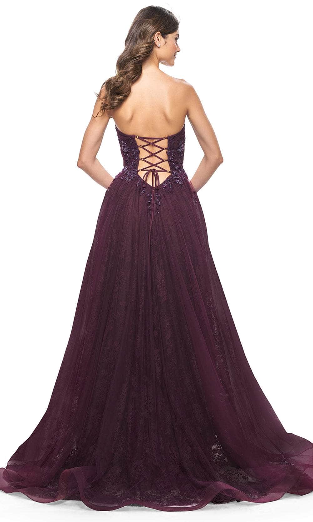 Impress the crowd with your beauty as you don this La Femme 31954 creation. Made from luxurious lace and tulle fabric, this strapless beauty is decorated with eye-catching floral lace appliques and sparkling beaded sequins. The sweetheart neckline draws attention to your collarbones, while the corset lace-up back provides a flattering fit. The front high slit and horsehair hem add a touch of drama to the classic A-line silhouette. It ends in a sweeping train that trails from behind. This La Femme 31954 dress will make your special event unforgettable. Models are wearing Black, and Dark Berry colors.