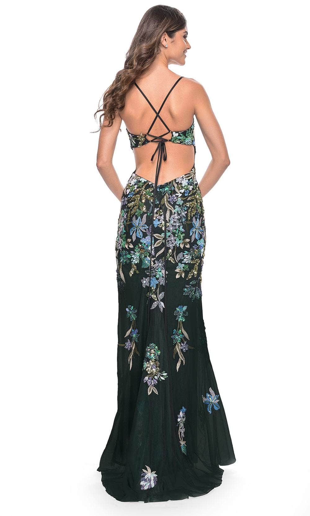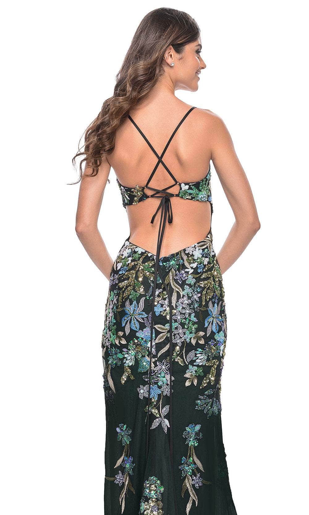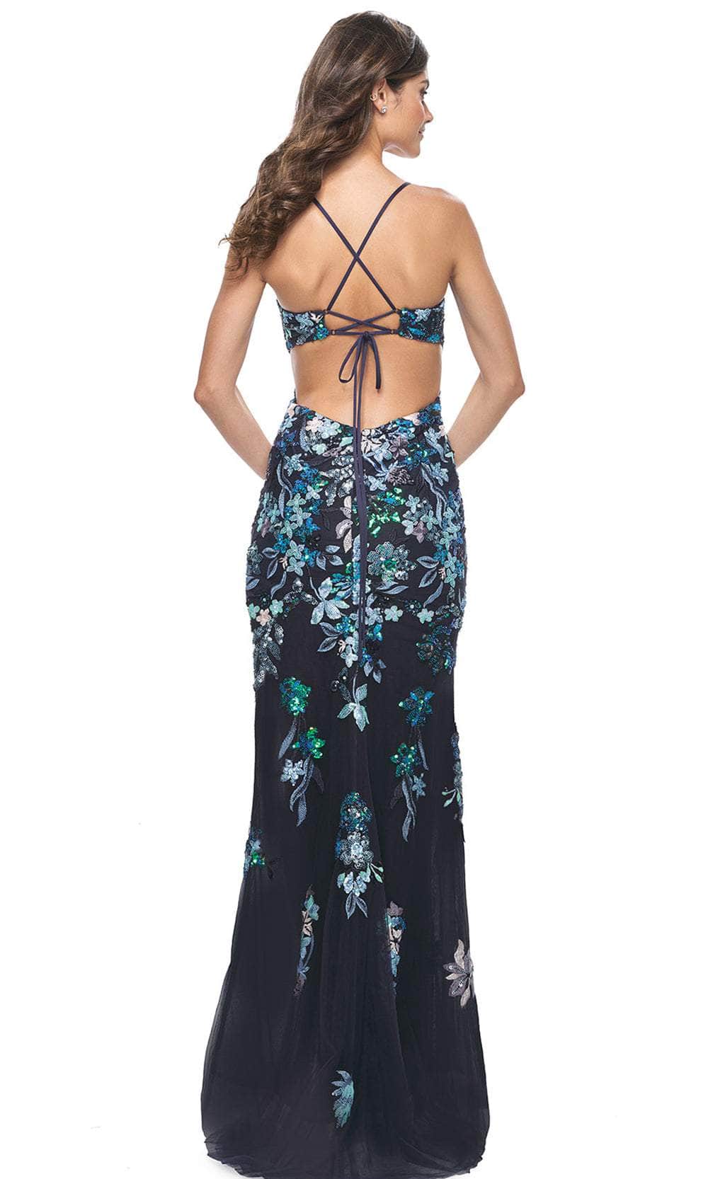 As you enthrall everyone in this La Femme 31992 masterpiece, flaunt your best assets. Adorned with multi-color embroidery and sequins arranged in a floral pattern, this sleeveless style will have you shining all night. Displayed are the appealing deep v-neckline, spaghetti straps and bandeau lace-up back. A high slit on the side adds a touch of sexiness and allows you to exhibit your legs. The skirt is styled in a flattering sheath silhouette that touches the floor and train denouement. This La Femme 31992 creation is truly a definition of glamour. Models are wearing Black, and Navy colors.