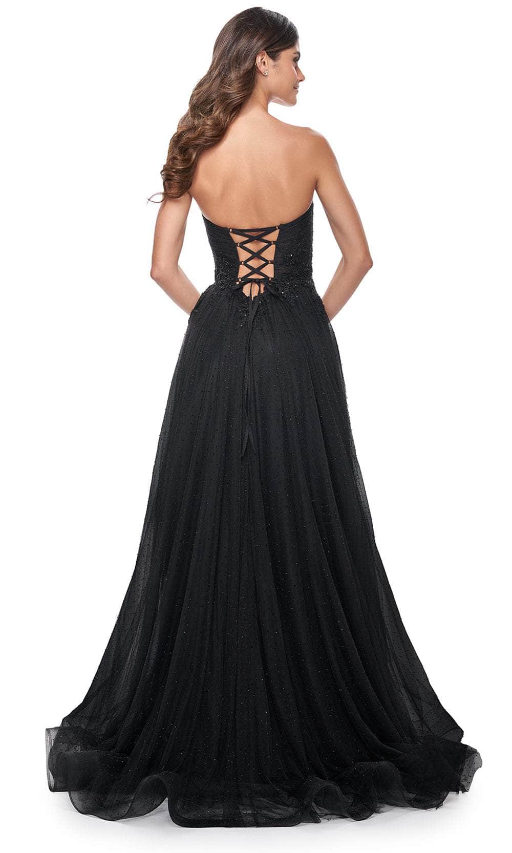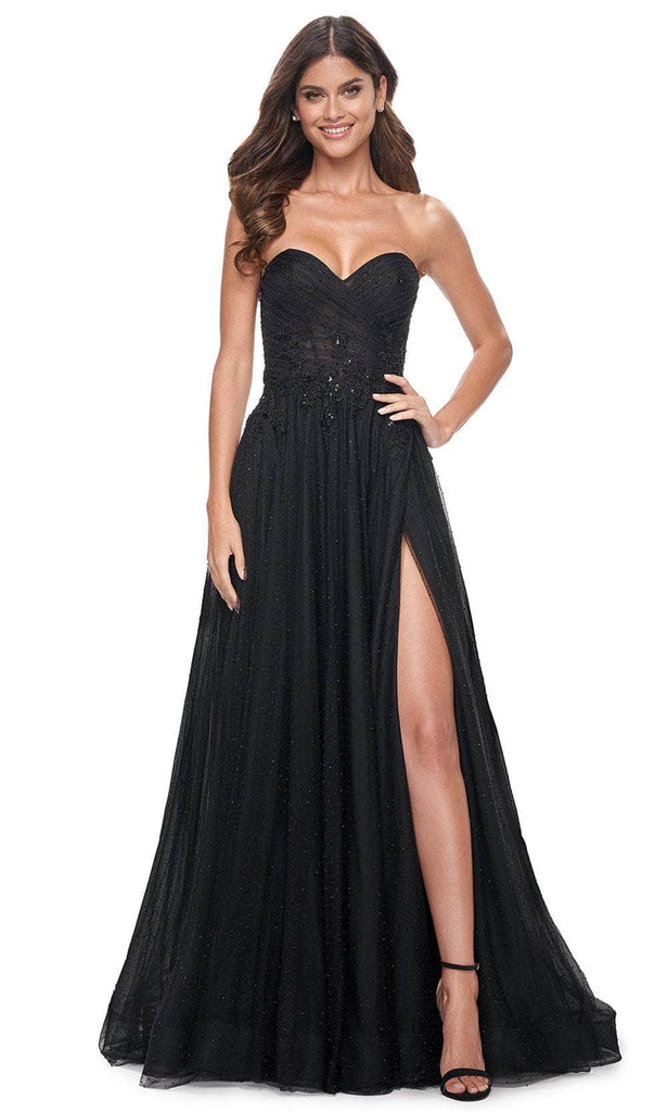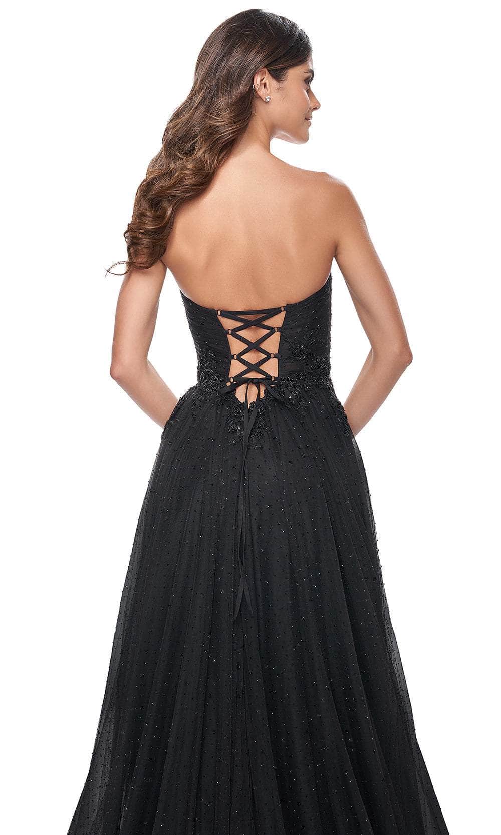 Flatter your best features while captivating the audience in La Femme 32005, a mesmerizing sweetheart strapless A-line gown adorned with rhinestone-embellished tulle. Its ruched illusion bodice features delicate beaded applique detail, complemented by a lace-up tie at the back for added allure. Secured with a back zipper closure, this gown ensures a snug fit. The floor-length skirt, accentuated with a slit, gracefully culminates in a sweeping train, completing the look with elegance and charm for any special occasion. La Femme 32005 evokes timeless allure. Model is wearing Black color.