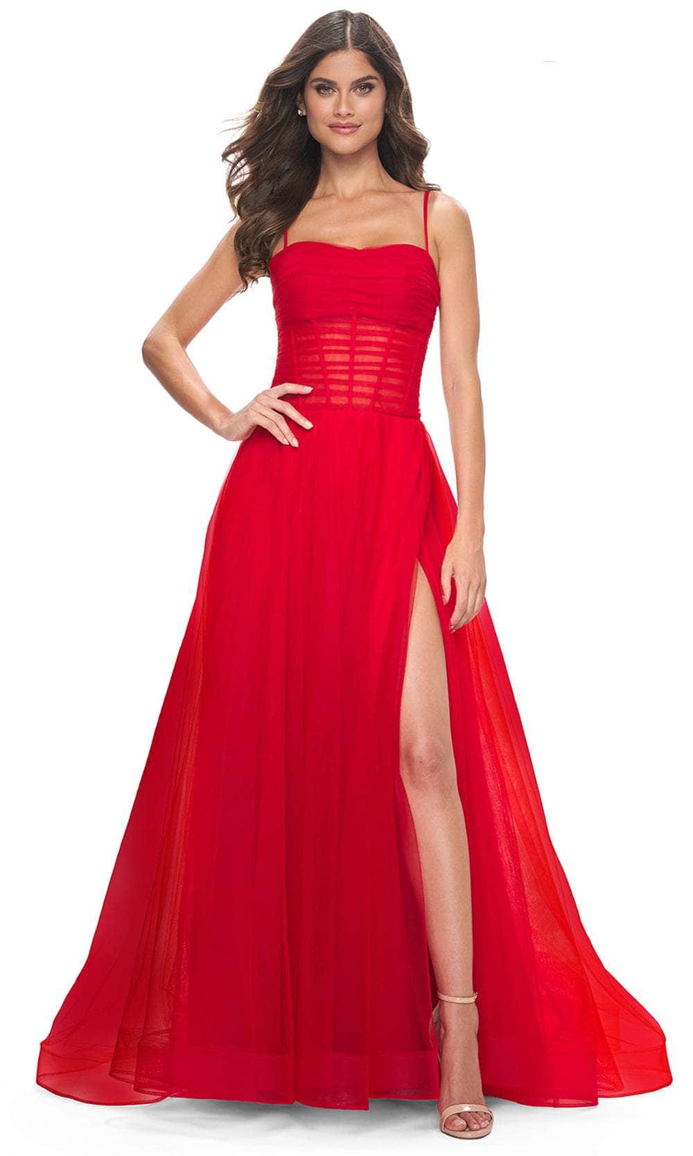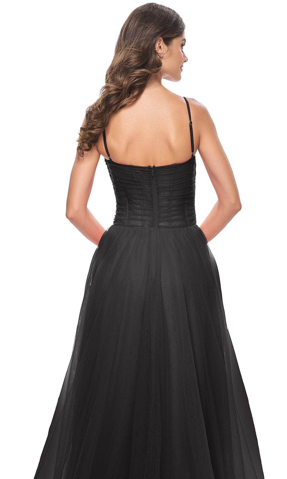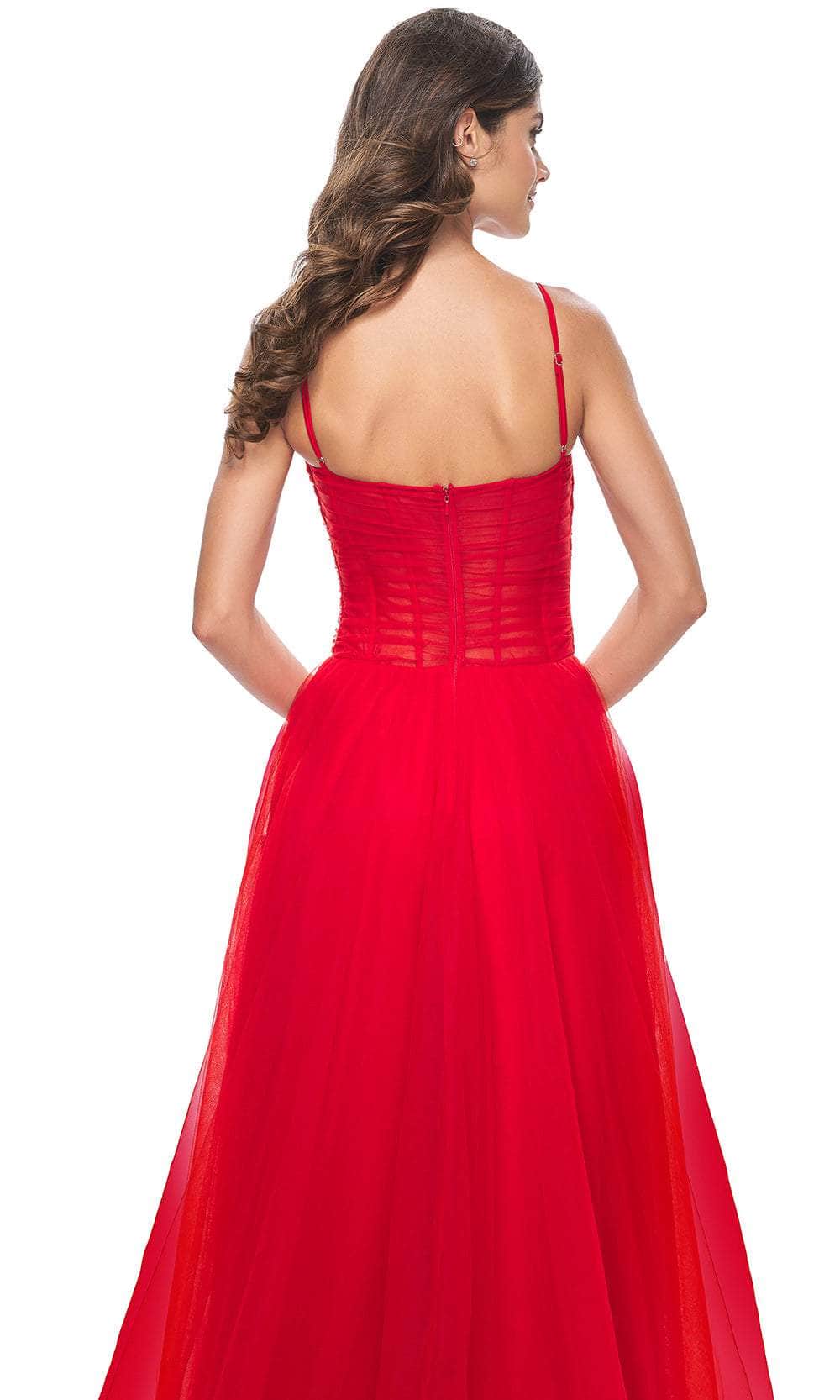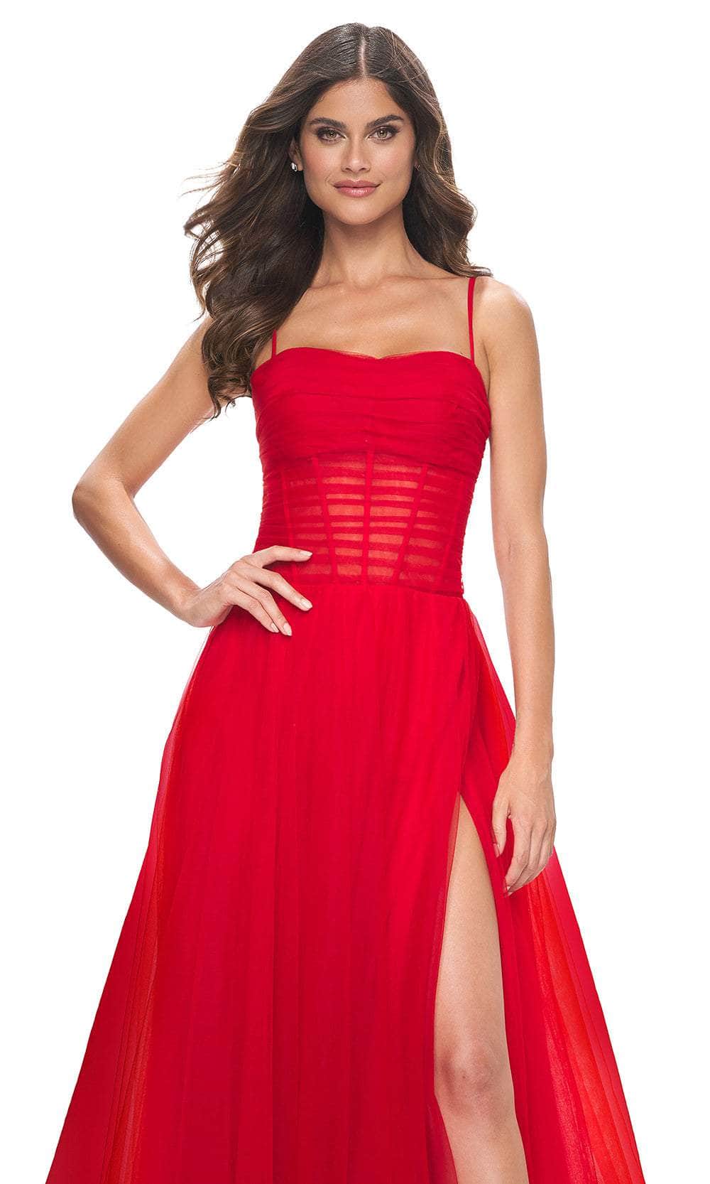 Step into the realm of timeless elegance with our exquisite La Femme 32017 creation. Meticulously crafted, this enchanting gown features an allover ruched tulle fabric design, enhanced by delicate tailoring lines for a mesmerizing aesthetic. The bodice showcases delicate spaghetti straps and a captivating sweetheart neckline, elegantly complemented by a sheer midriff adorned with corset boning, sculpting a flattering silhouette. The defined waistline adds allure, while the back reveals a semi-sheer midrise design with corset boning and a concealed zipper closure, ensuring a seamless fit. The layered skirt unveils an A-line silhouette, accompanied by a daring high slit and a sweeping train, radiating elegance with each step. Elevate your presence and captivate attention at any occasion with the exquisite La Femme 32017 masterpiece. Models are wearing the Black and Red colors.