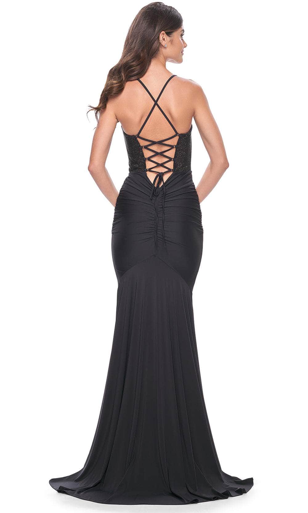 Get ready to draw attention with the height of elegance in this La Femme 32064 creation. This sleeveless outfit exhibits a sheer corset bodice adorned with beaded rhinestones and has boning details for a structured fit. The scoop neckline adds a touch of allure, while being supported by spaghetti straps. A sight of skin is revealed at the back with its open detail, and highlights the strappy lace-up closure for an adjustable fit. The skirt skims into a full-length sheath silhouette, ending with a sweeping train. This La Femme 32064 dress is perfect for making a long-lasting impression on any occasion. Model is wearing Black color.