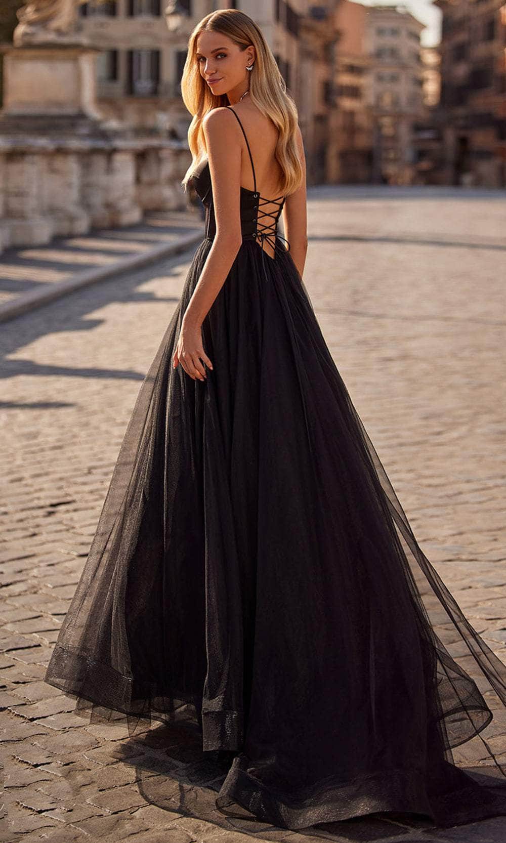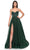 Details: Spaghetti Straps, Bustier Bodice, Lace Up back, High Slit, Sweep Train