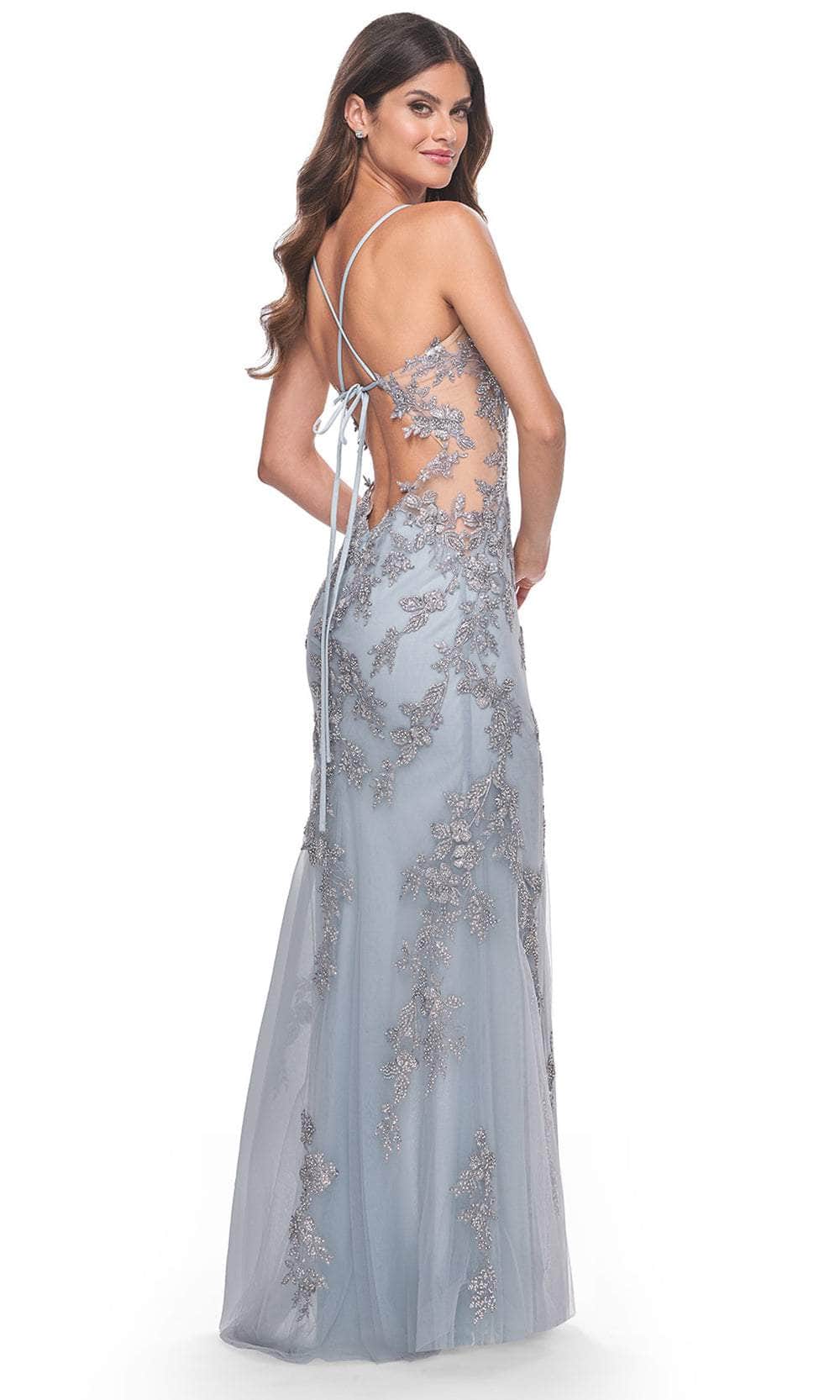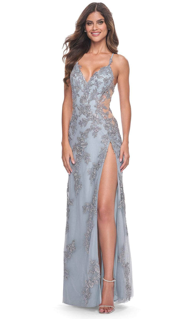 Capture attention in La Femme 32074, an enchanting long dress featuring delicate lace rhinestone applique and enticing sheer illusion sides. Its lace-up open back exudes allure and sophistication, while the snug fit ensured by the back zipper closure enhances comfort. The floor-length skirt drapes gracefully in a sheath silhouette, heightened by a slit for added allure. With its refined charm, this ensemble is ideal for making a statement at any special event. Embrace sophistication with La Femme 32074. Model is wearing Slate Blue color.