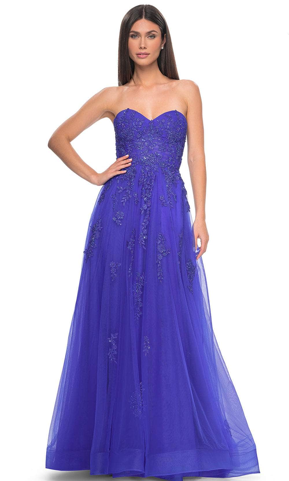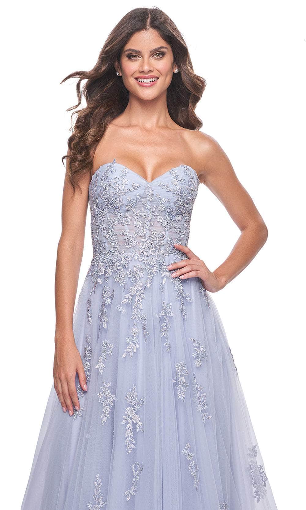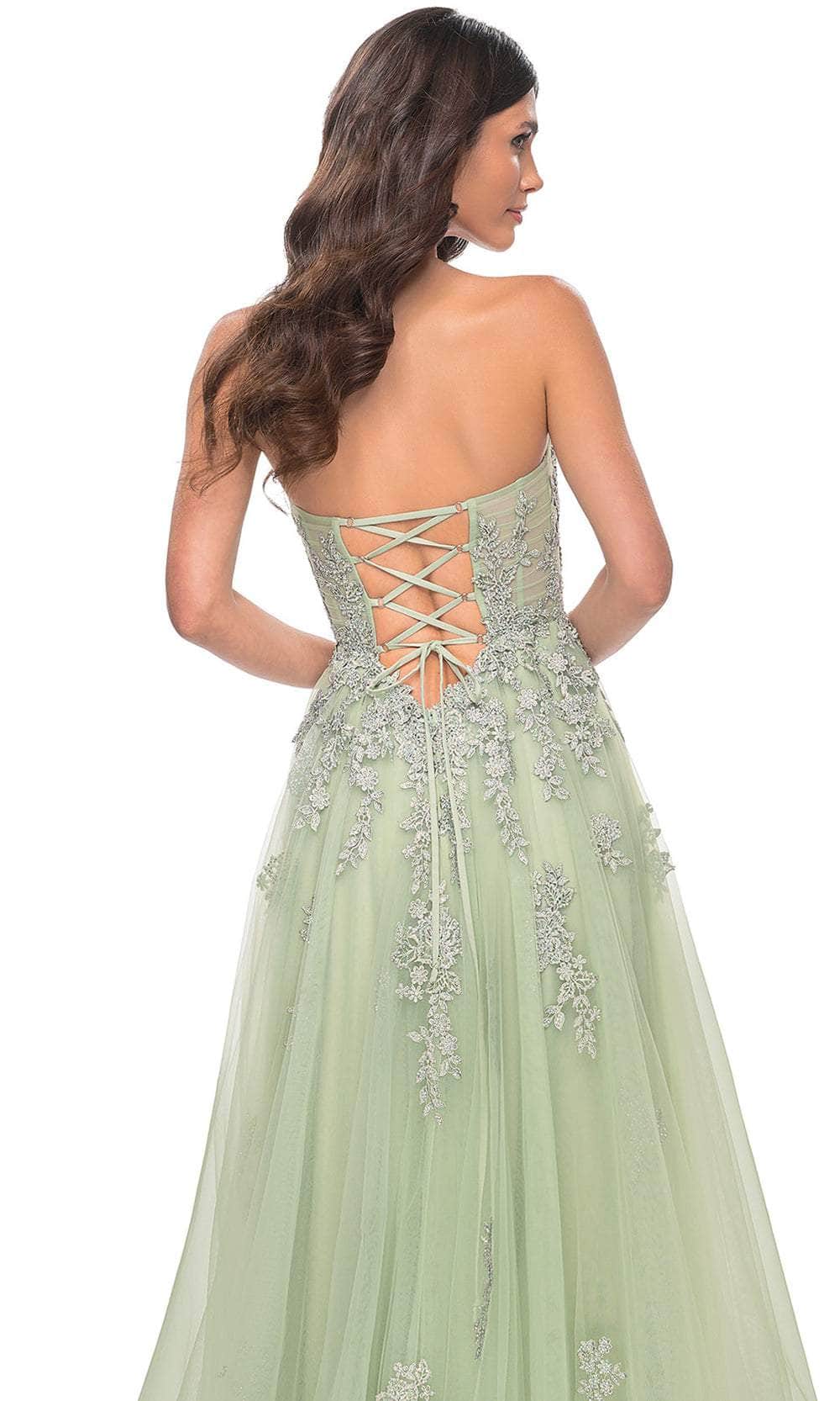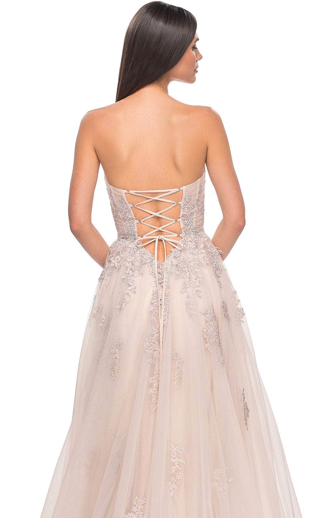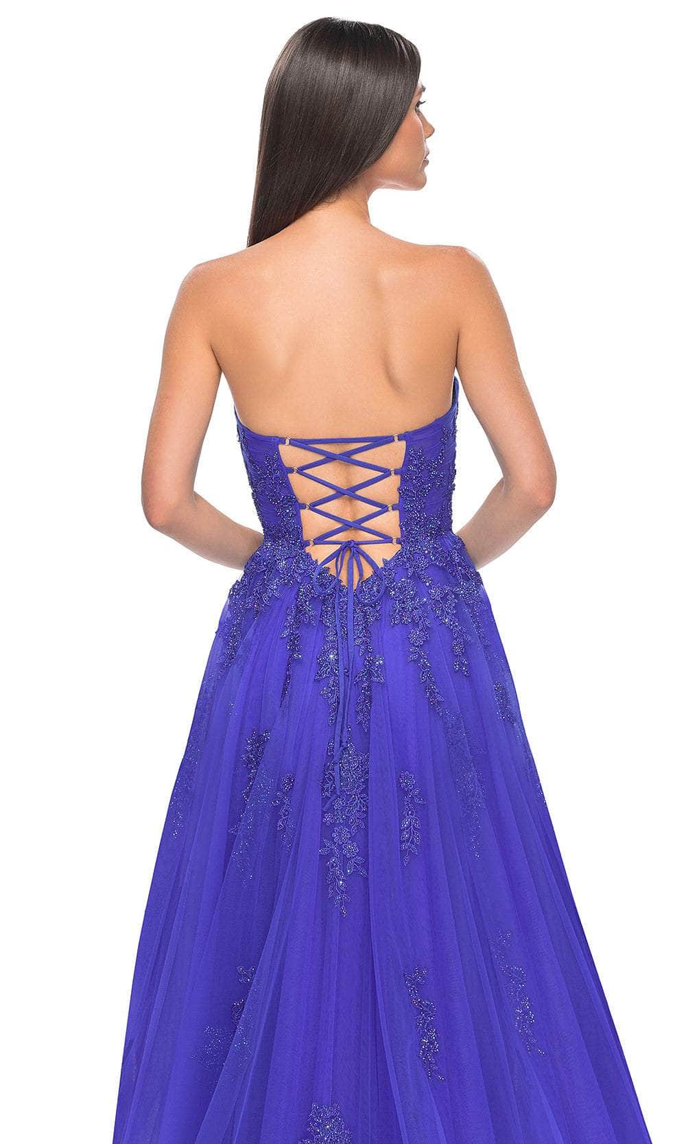Embody elegance and poise in this flawless La Femme 32084 creation. The strapless bodice features a sweetheart neckline, adorned with delicate lace applique intricately embellished with sparkling rhinestones. Structured with corset boning, it accentuates the figure with elegance and grace. Featuring a midrise back with a delicate lace-up design, adding elegance and adjustability, the gown features a lace-detailed silhouette with a natural waist and an A-line design, complemented by a high slit and a graceful sweep train for added elegance. create a charming focal point with this La Femme 32084 masterpiece. Models are wearing the Blush, Light Periwinkle, Royal Blue, and Sage colors.