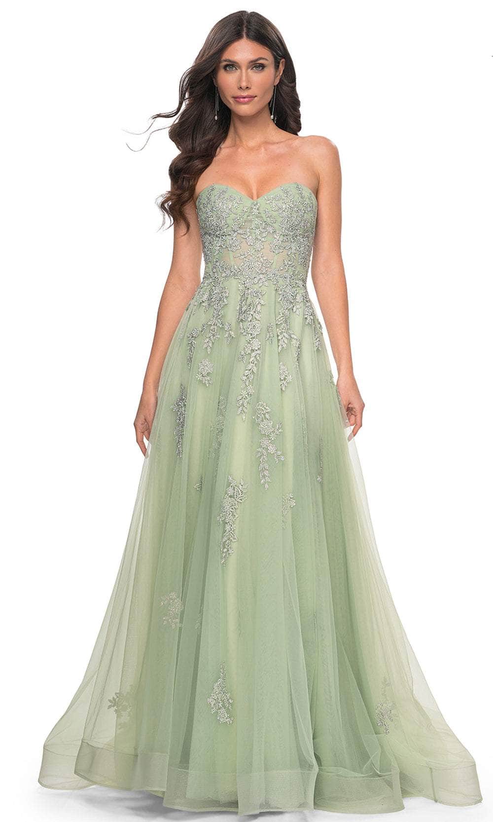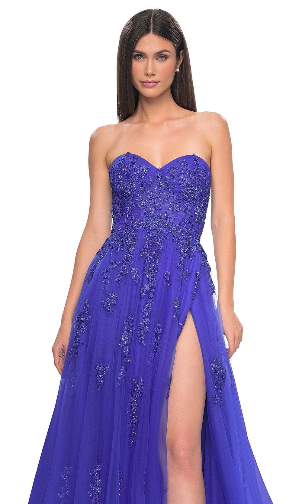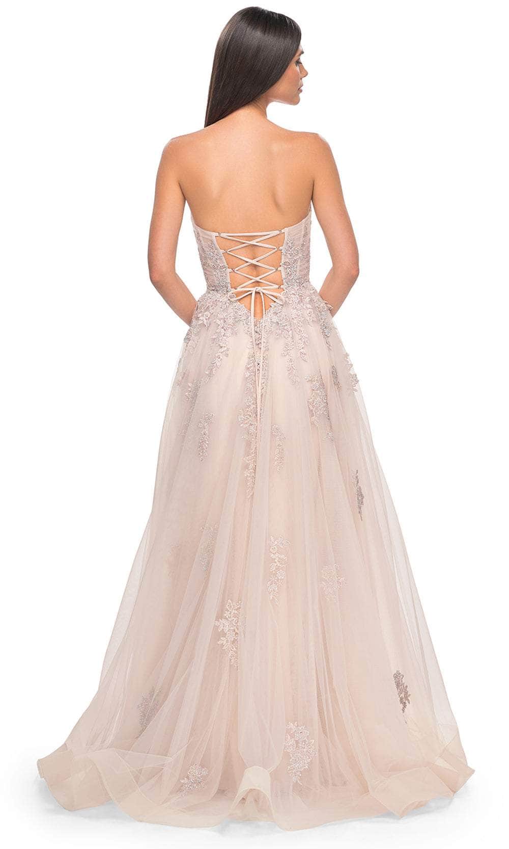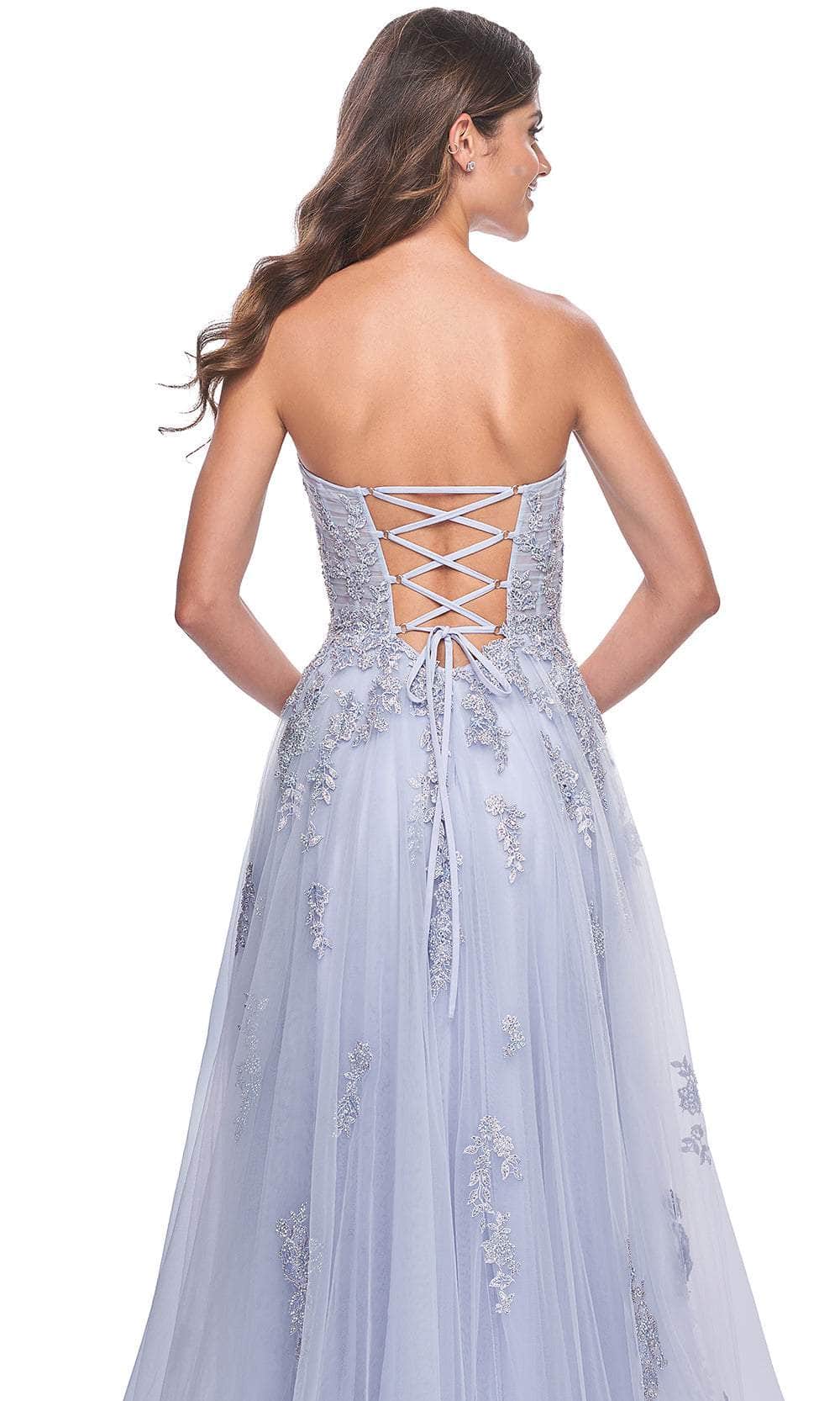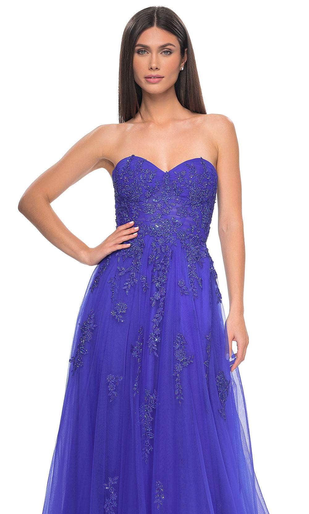 Embody elegance and poise in this flawless La Femme 32084 creation. The strapless bodice features a sweetheart neckline, adorned with delicate lace applique intricately embellished with sparkling rhinestones. Structured with corset boning, it accentuates the figure with elegance and grace. Featuring a midrise back with a delicate lace-up design, adding elegance and adjustability, the gown features a lace-detailed silhouette with a natural waist and an A-line design, complemented by a high slit and a graceful sweep train for added elegance. create a charming focal point with this La Femme 32084 masterpiece. Models are wearing the Blush, Light Periwinkle, Royal Blue, and Sage colors.