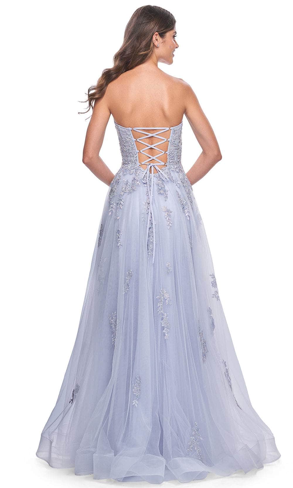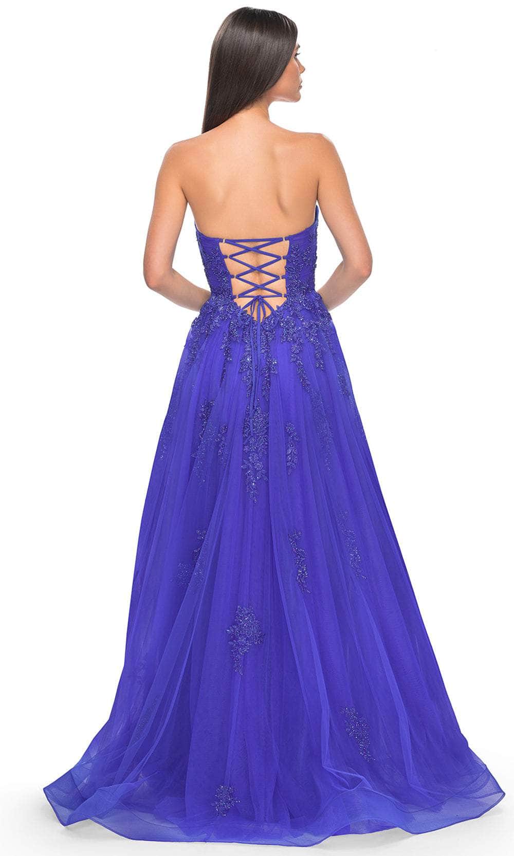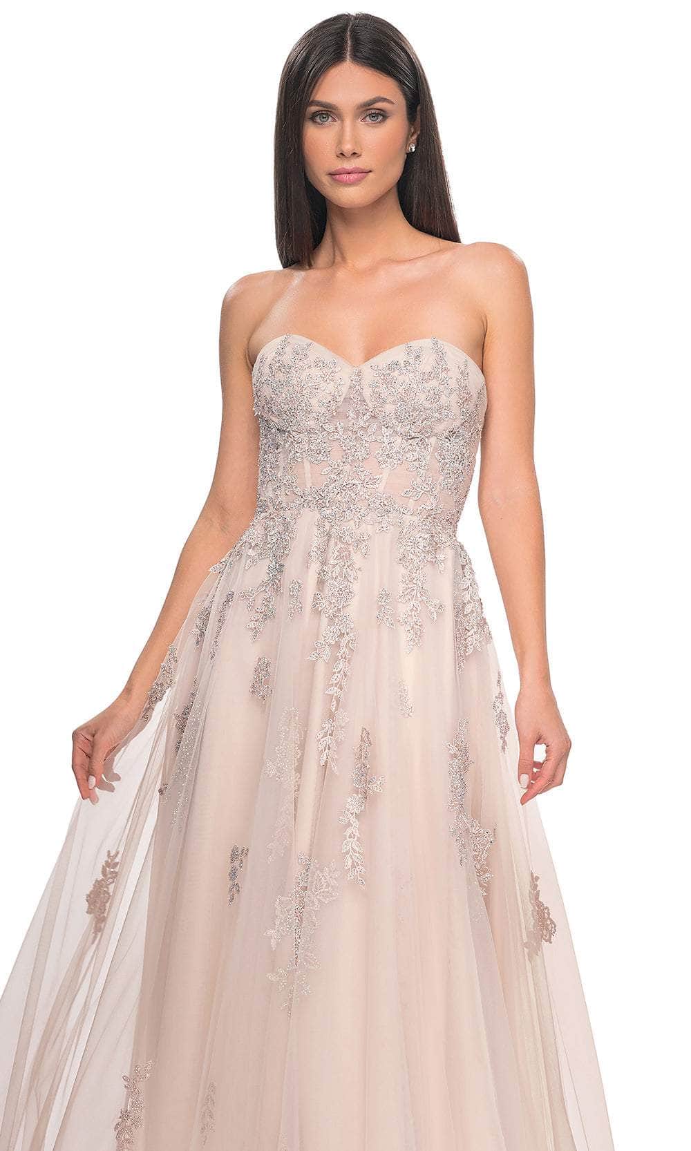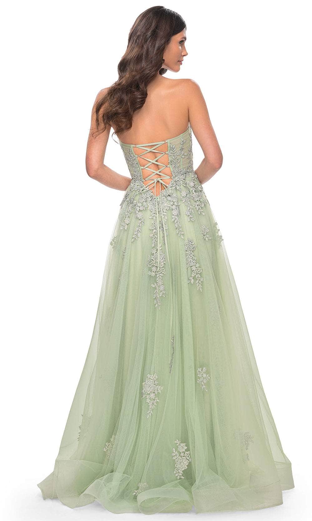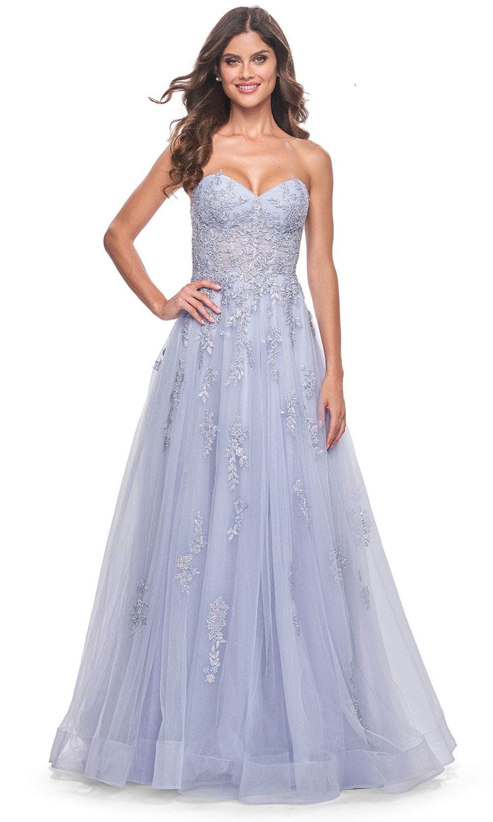 Embody elegance and poise in this flawless La Femme 32084 creation. The strapless bodice features a sweetheart neckline, adorned with delicate lace applique intricately embellished with sparkling rhinestones. Structured with corset boning, it accentuates the figure with elegance and grace. Featuring a midrise back with a delicate lace-up design, adding elegance and adjustability, the gown features a lace-detailed silhouette with a natural waist and an A-line design, complemented by a high slit and a graceful sweep train for added elegance. create a charming focal point with this La Femme 32084 masterpiece. Models are wearing the Blush, Light Periwinkle, Royal Blue, and Sage colors.