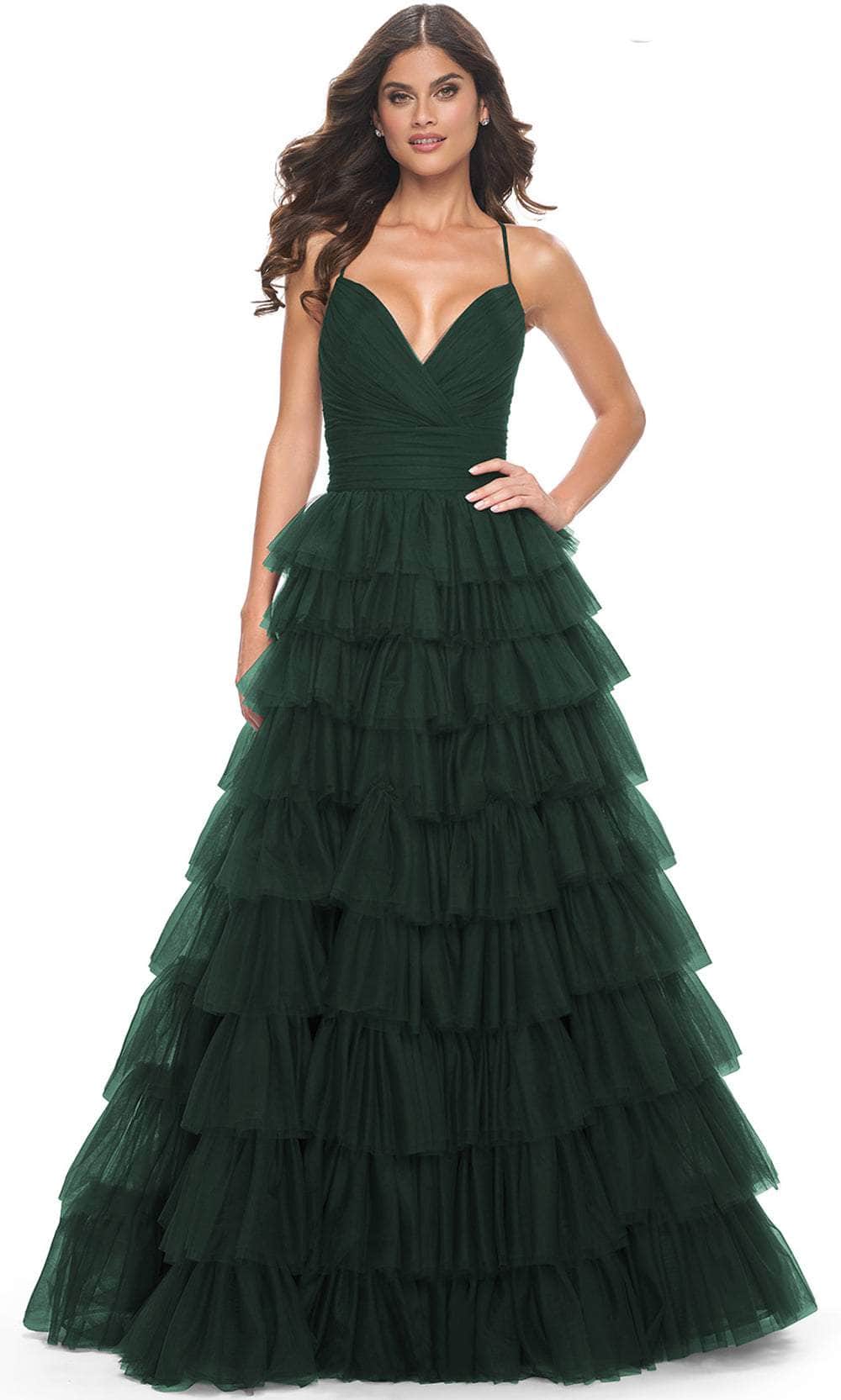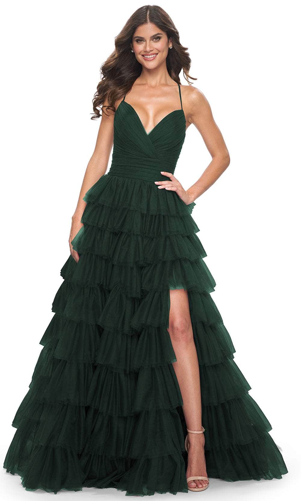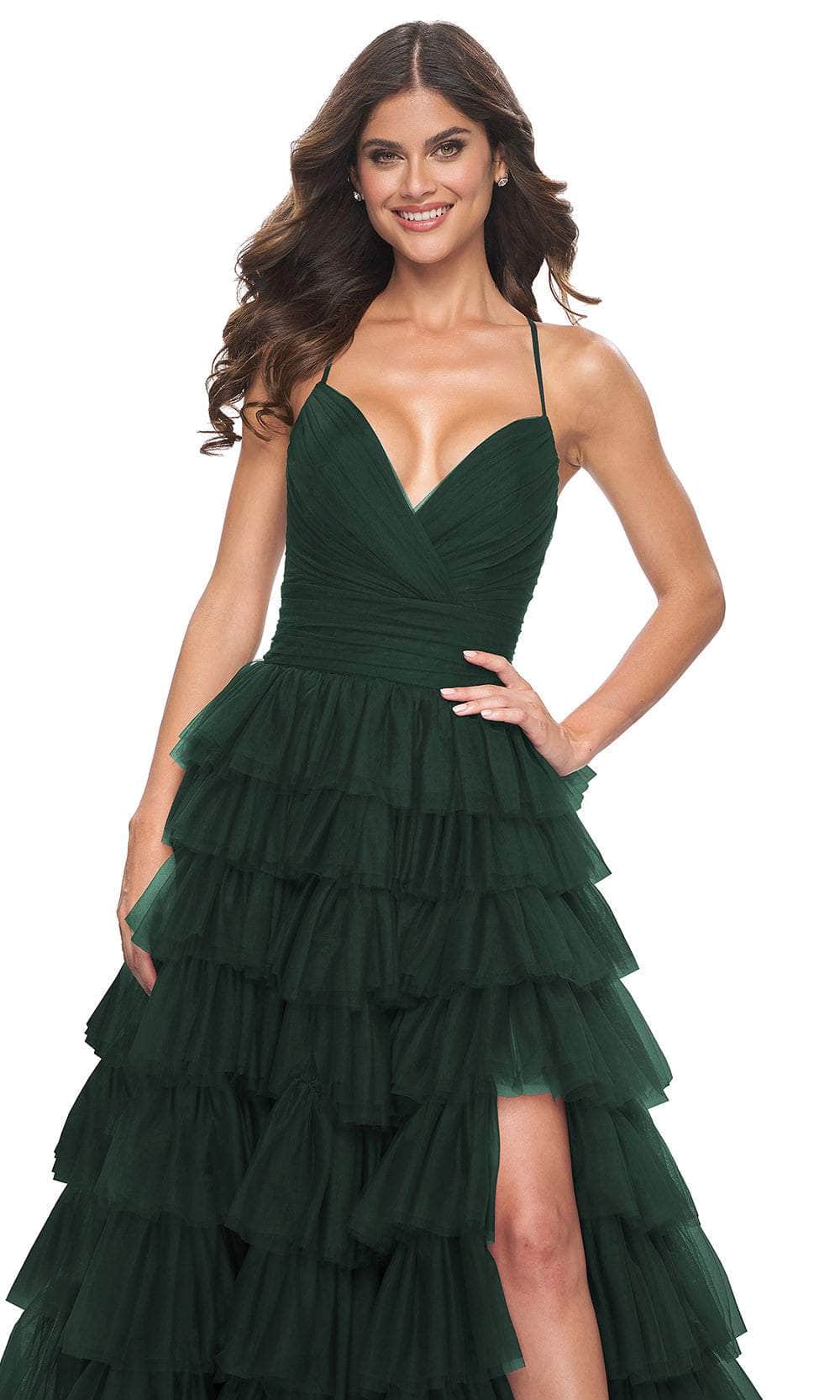 Make an unforgettable impression in this masterpiece from La Femme 32086. Flattering in every figure, this sleeveless dress displays a ruched detail on the top bodice and a surplice deep v-neckline. Spaghetti straps lead to the open back, creating a strappy lace-up closure. The A-line skirt unveils a thigh-high leg slit that offers comfort and ease of movement. Complete with multi-tiered ruffles for added volume and grandeur. This La Femme 32086 dress is awesome for prom or any night occasion! Models are wearing Black, Dark Berry, and Dark Emerald colors.