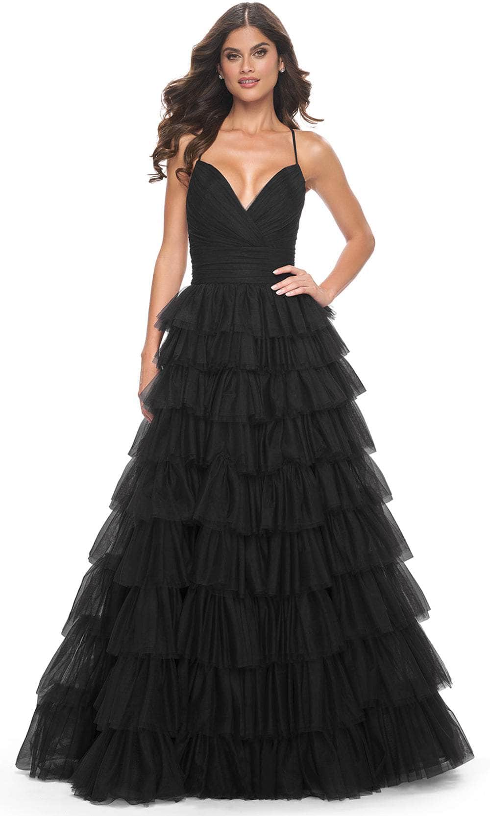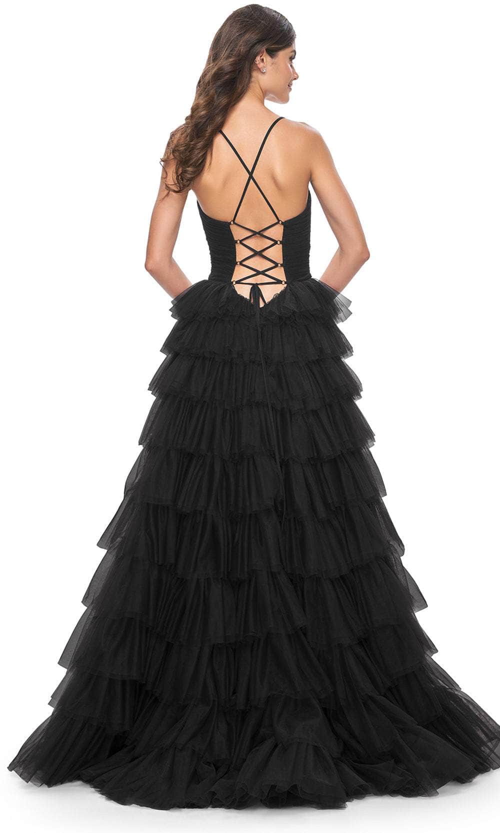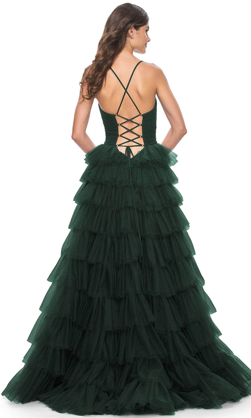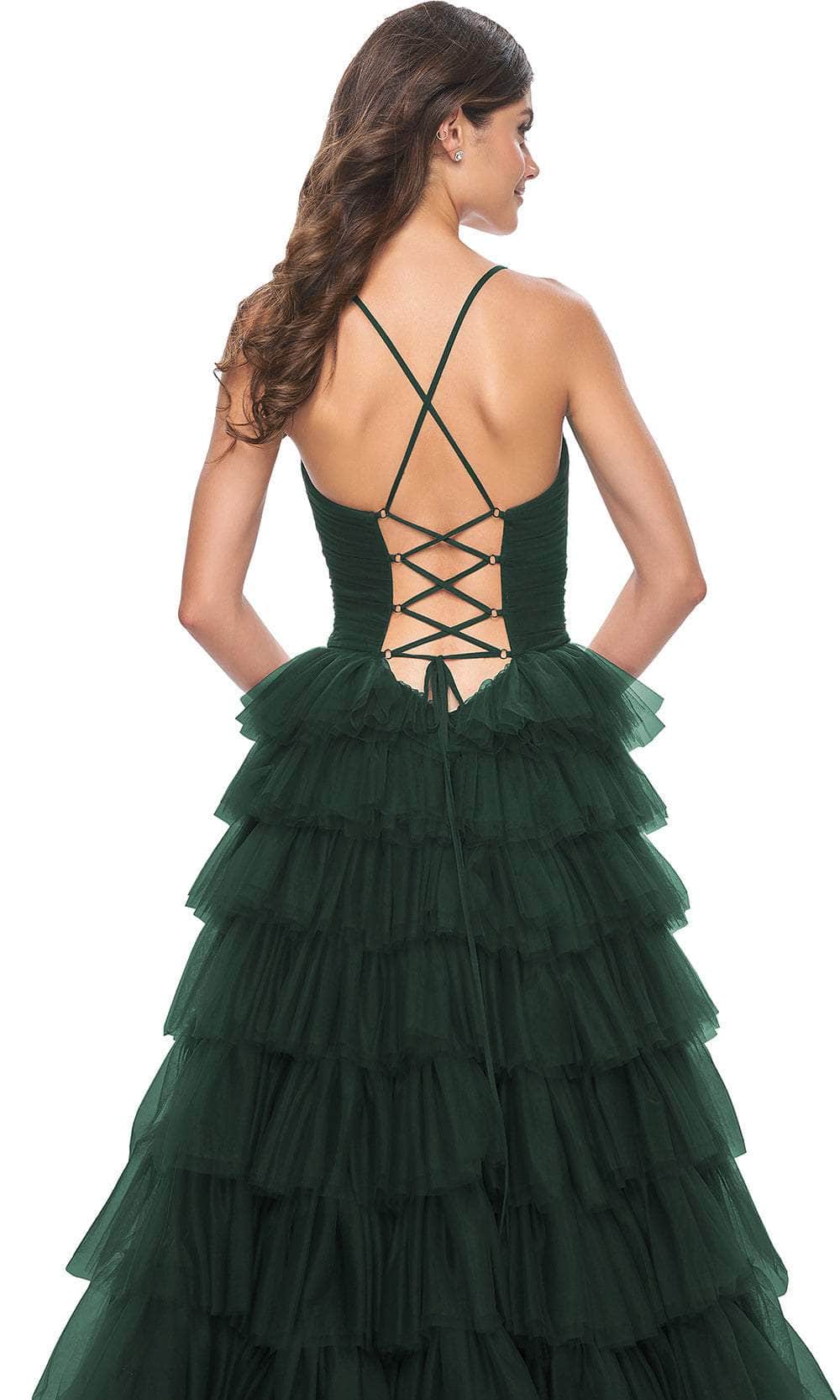 Make an unforgettable impression in this masterpiece from La Femme 32086. Flattering in every figure, this sleeveless dress displays a ruched detail on the top bodice and a surplice deep v-neckline. Spaghetti straps lead to the open back, creating a strappy lace-up closure. The A-line skirt unveils a thigh-high leg slit that offers comfort and ease of movement. Complete with multi-tiered ruffles for added volume and grandeur. This La Femme 32086 dress is awesome for prom or any night occasion! Models are wearing Black, Dark Berry, and Dark Emerald colors.