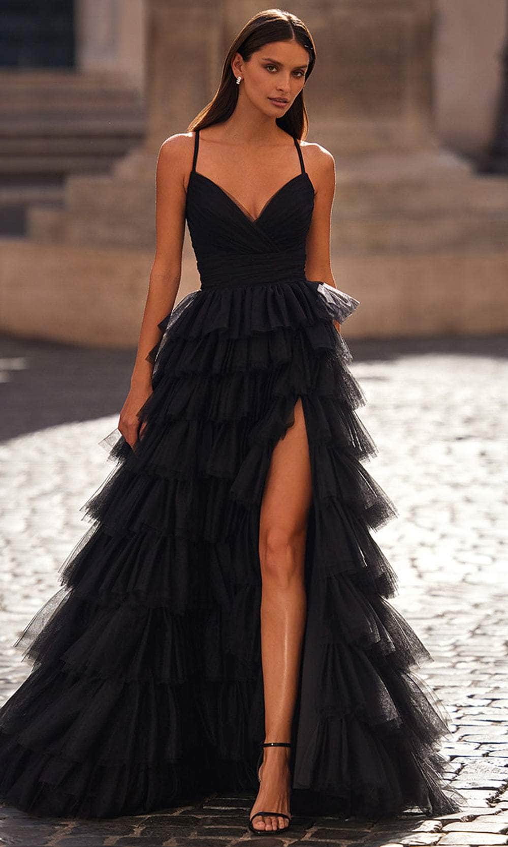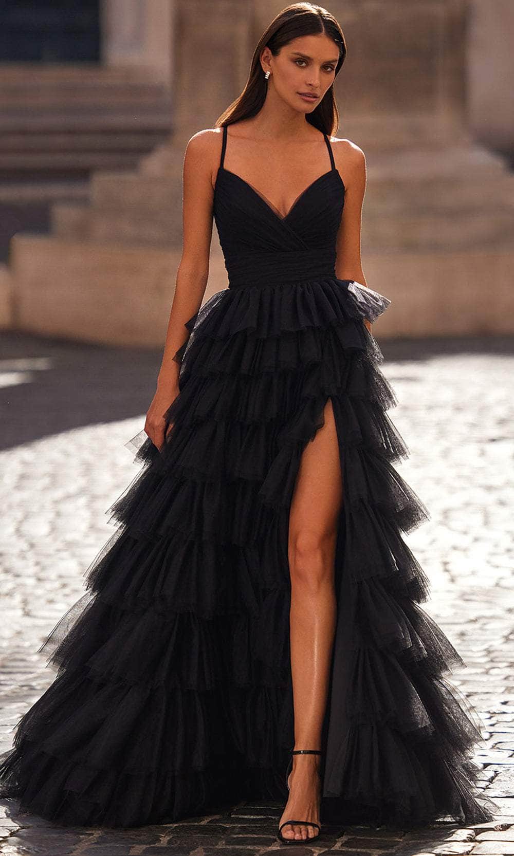 Details: Spaghetti Strap, Surplice Detail, Ruched, Corset Lace-Up Back, Ruffle Tiered, High Slit, Sweep Train