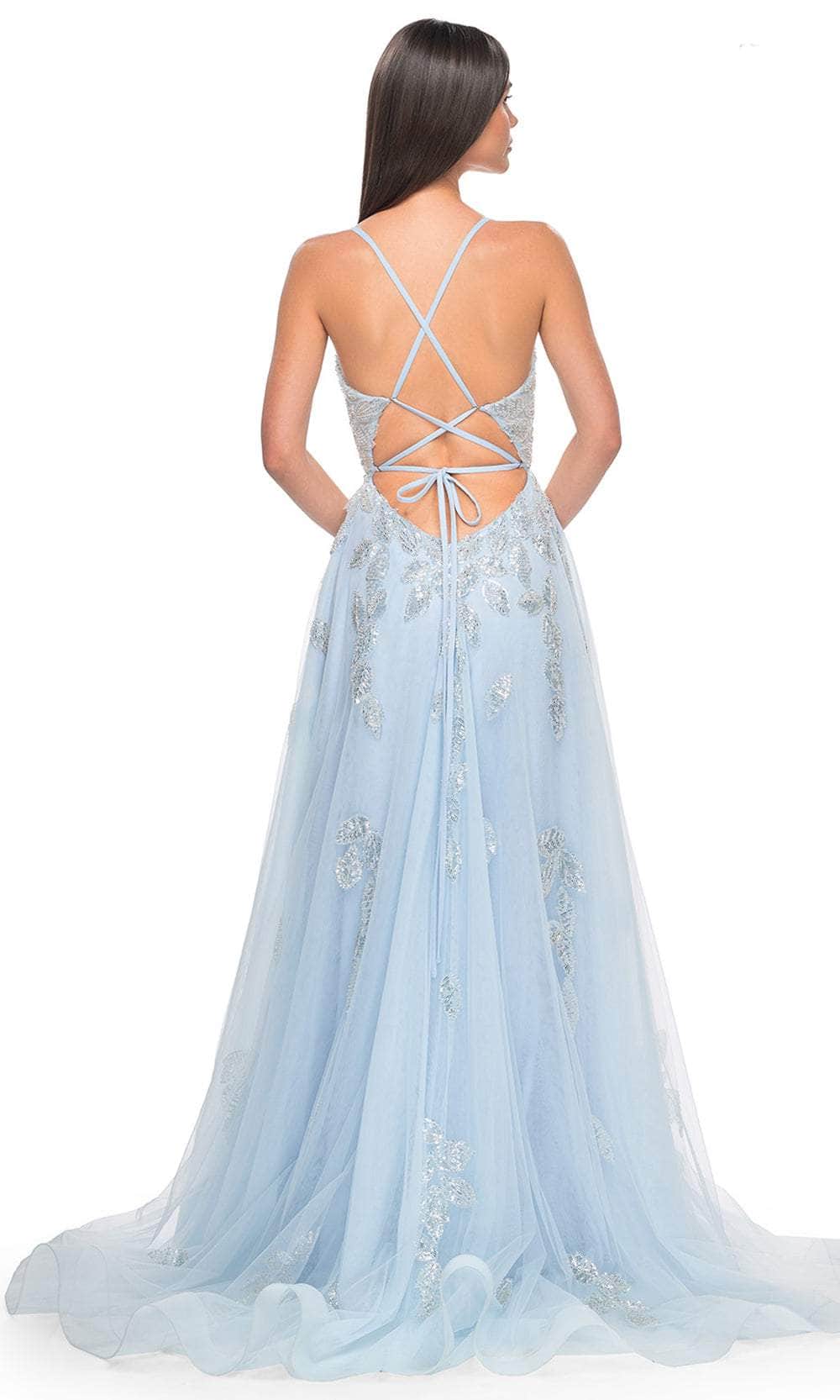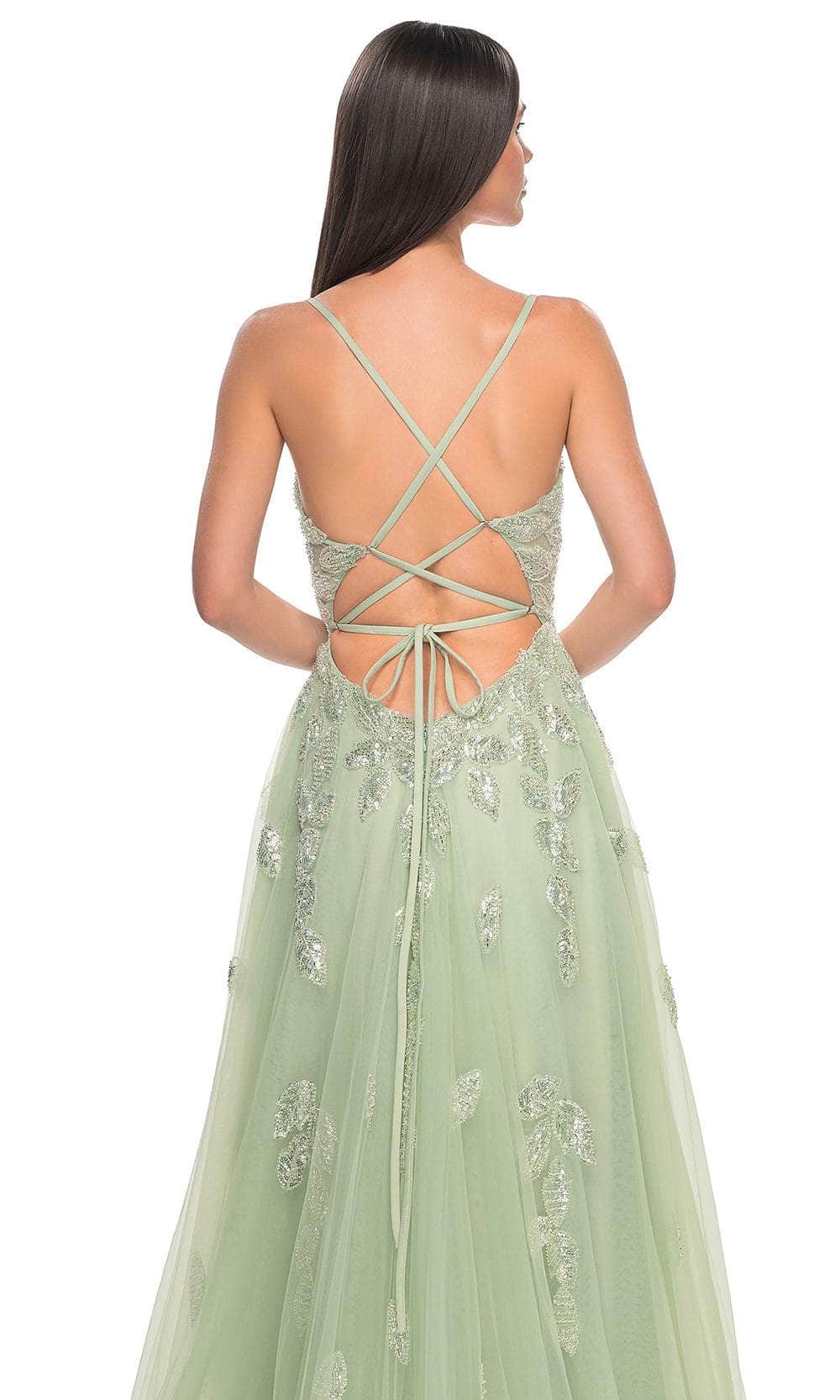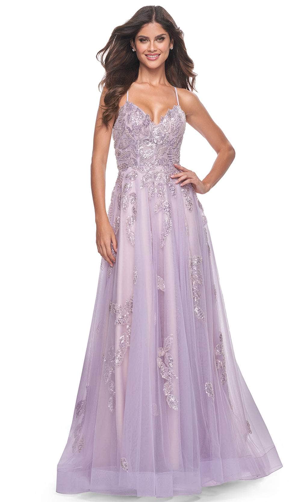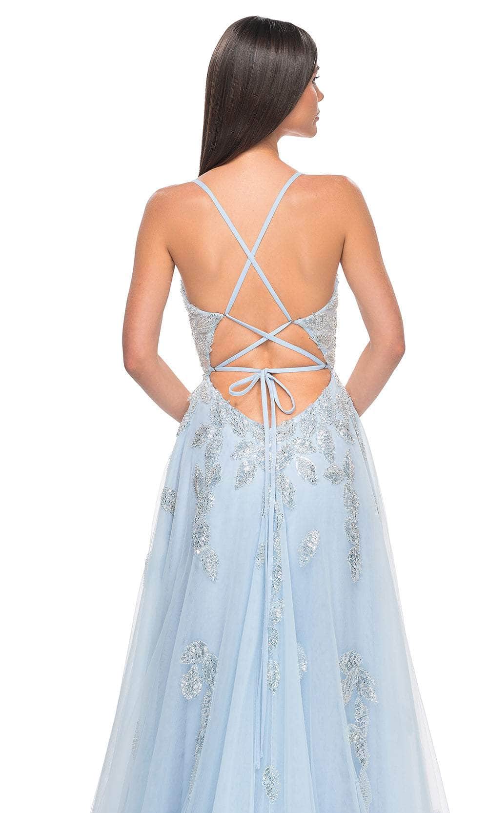 Create a picture-perfect evening wearing this La Femme 32090 masterpiece. This sleeveless tulle gown is a show-stopper, which is ornamented with a foliage pattern of beaded and sequins. The deep v-neckline is held together by spaghetti straps, while the open back has a crisscross lace-up design for a modern twist. Carved in an A-line silhouette to accentuate all body curves, the skirt flows to the floor and sweeping train. A thigh-high leg slit and horsehair hem create a graceful and elegant look. This La Femme 32090 creation is ideal for those seeking to make a memorable entrance. Models are wearing Lavender, Light Blue, and Sage colors.