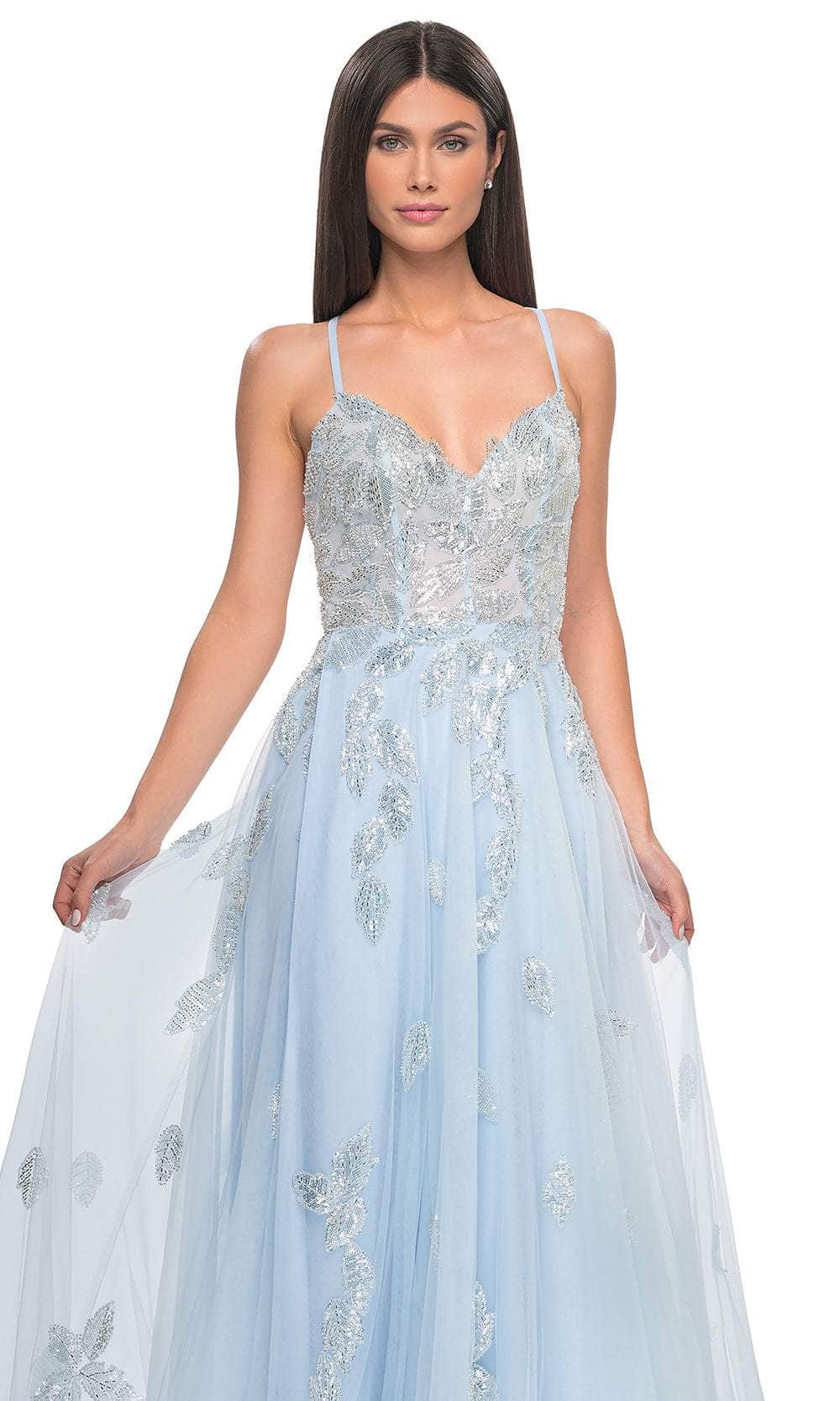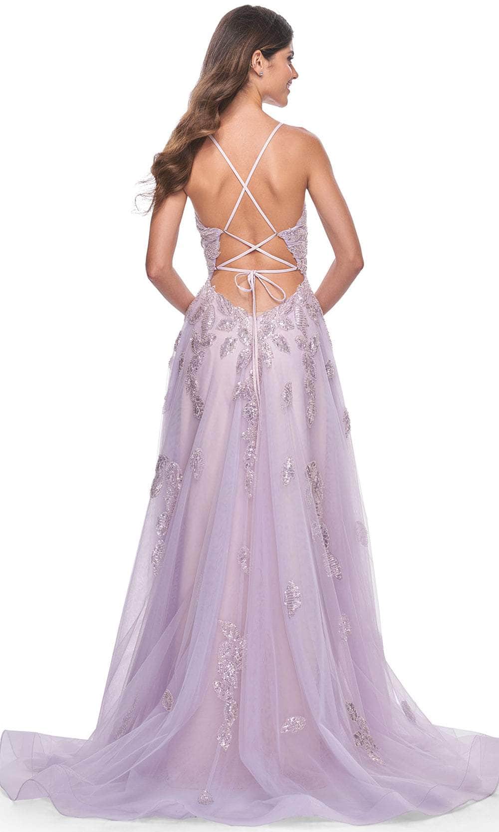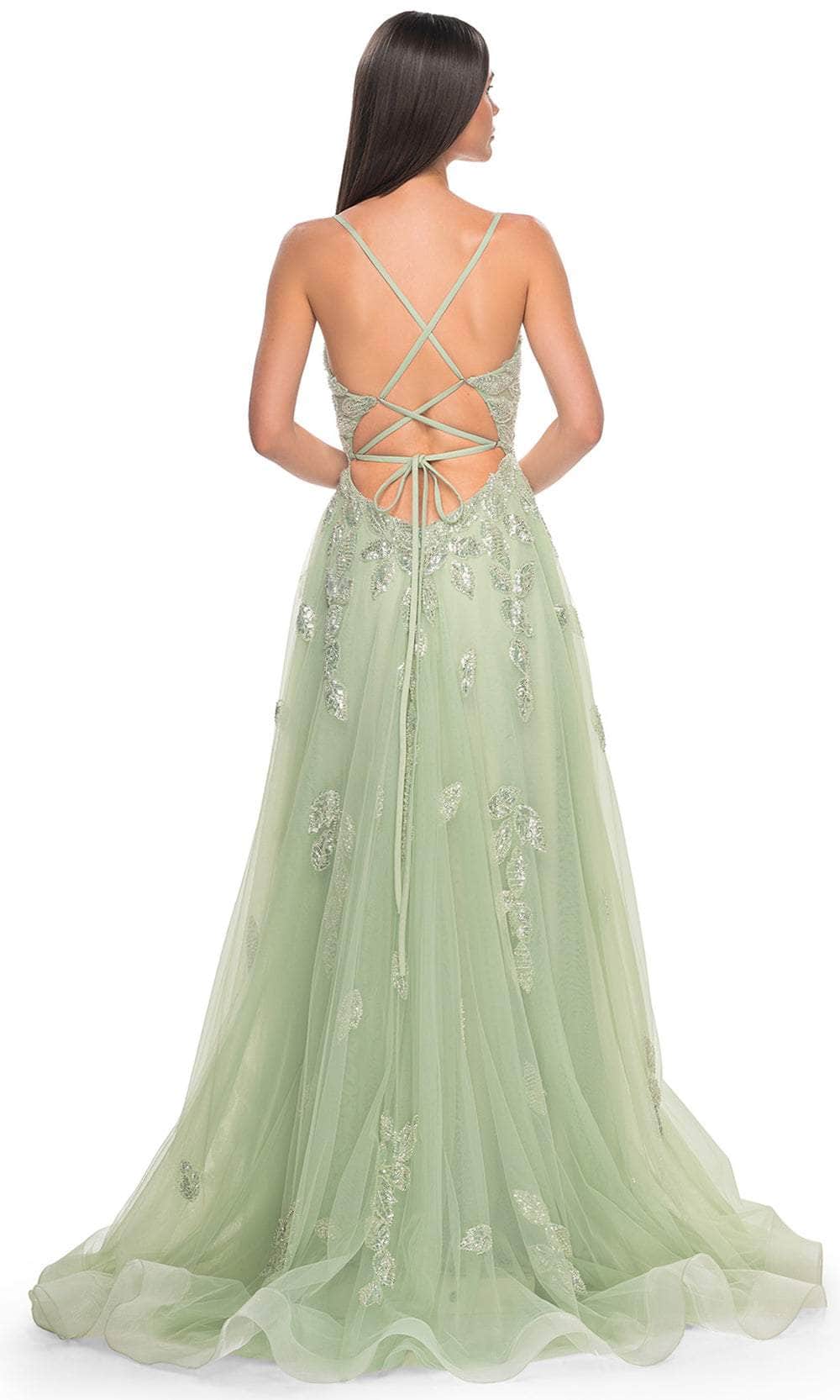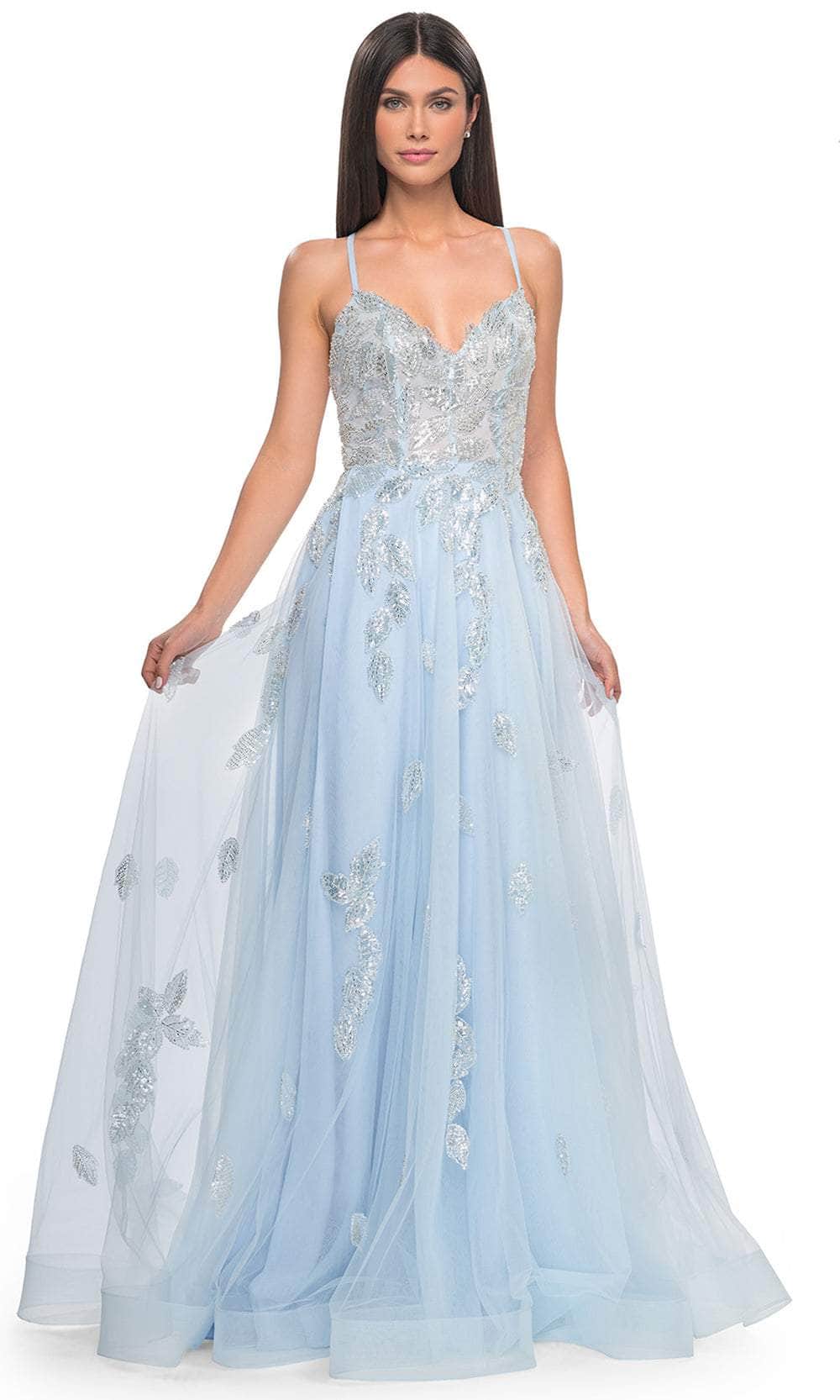 Create a picture-perfect evening wearing this La Femme 32090 masterpiece. This sleeveless tulle gown is a show-stopper, which is ornamented with a foliage pattern of beaded and sequins. The deep v-neckline is held together by spaghetti straps, while the open back has a crisscross lace-up design for a modern twist. Carved in an A-line silhouette to accentuate all body curves, the skirt flows to the floor and sweeping train. A thigh-high leg slit and horsehair hem create a graceful and elegant look. This La Femme 32090 creation is ideal for those seeking to make a memorable entrance. Models are wearing Lavender, Light Blue, and Sage colors.