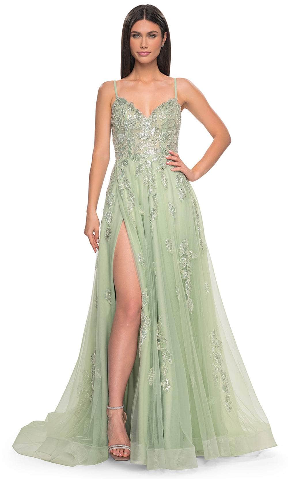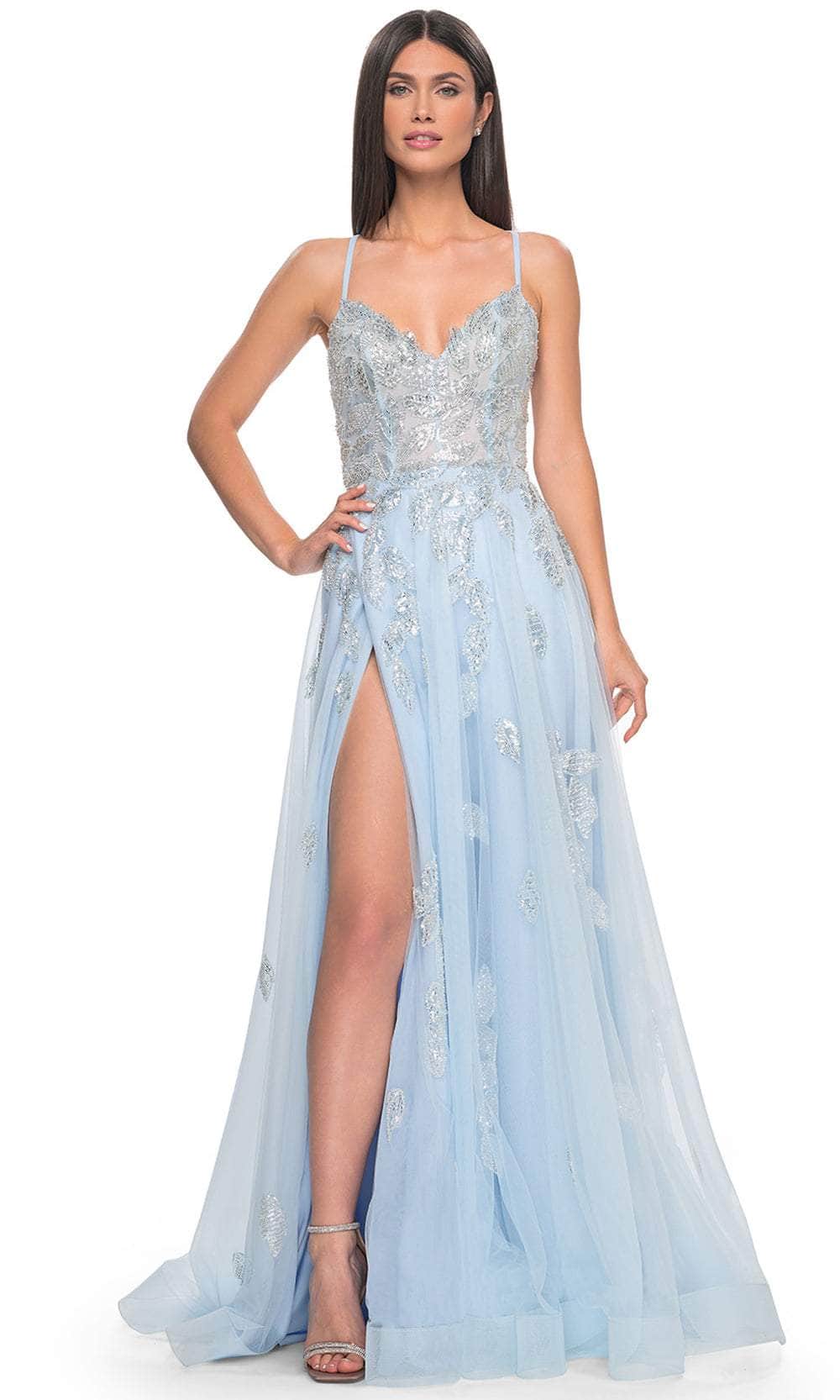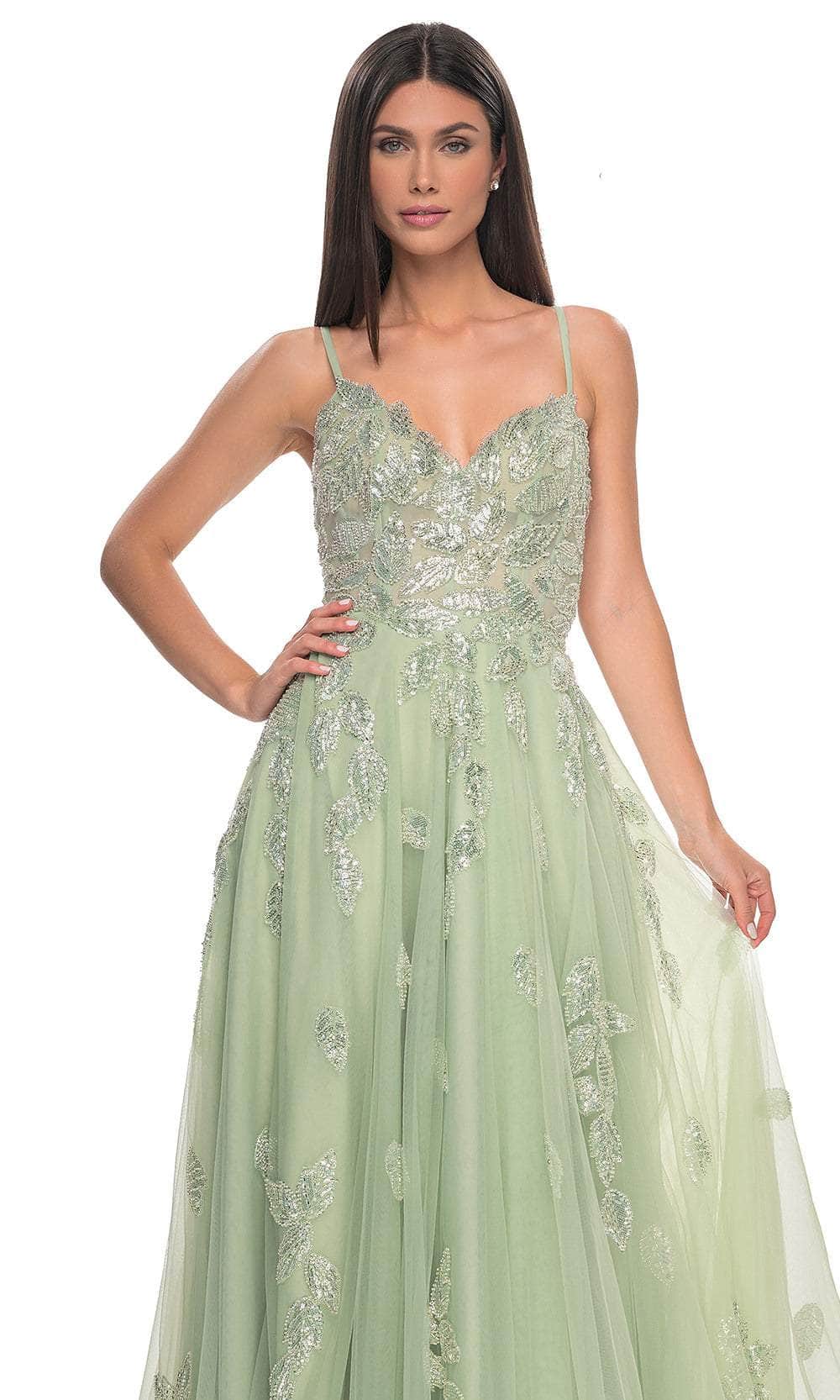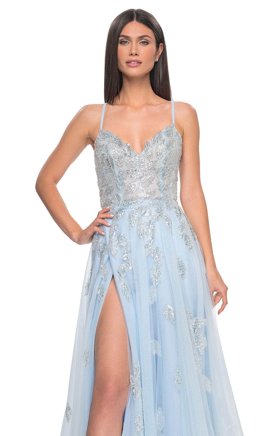 Create a picture-perfect evening wearing this La Femme 32090 masterpiece. This sleeveless tulle gown is a show-stopper, which is ornamented with a foliage pattern of beaded and sequins. The deep v-neckline is held together by spaghetti straps, while the open back has a crisscross lace-up design for a modern twist. Carved in an A-line silhouette to accentuate all body curves, the skirt flows to the floor and sweeping train. A thigh-high leg slit and horsehair hem create a graceful and elegant look. This La Femme 32090 creation is ideal for those seeking to make a memorable entrance. Models are wearing Lavender, Light Blue, and Sage colors.