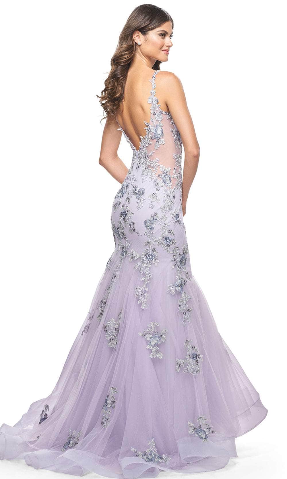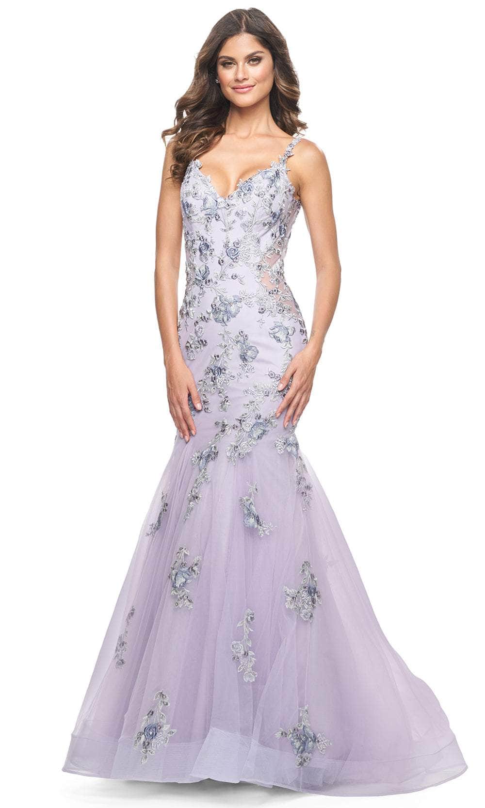 Make a statement in La Femme 32091, a mesmerizing mermaid prom gown embellished with lively multi-color lace applique. The chic V neckline and sheer illusion sides of the sleeveless fitted bodice exude sophistication, while the alluring open back adds flair. Complete with a secure back zipper closure, this gown combines style with comfort seamlessly. The floor-length skirt, featuring a horsehair hem and graceful train, adds a touch of drama and elegance, ensuring La Femme 32091 is ideal for any special occasion. Model is wearing Lavender Gray color.