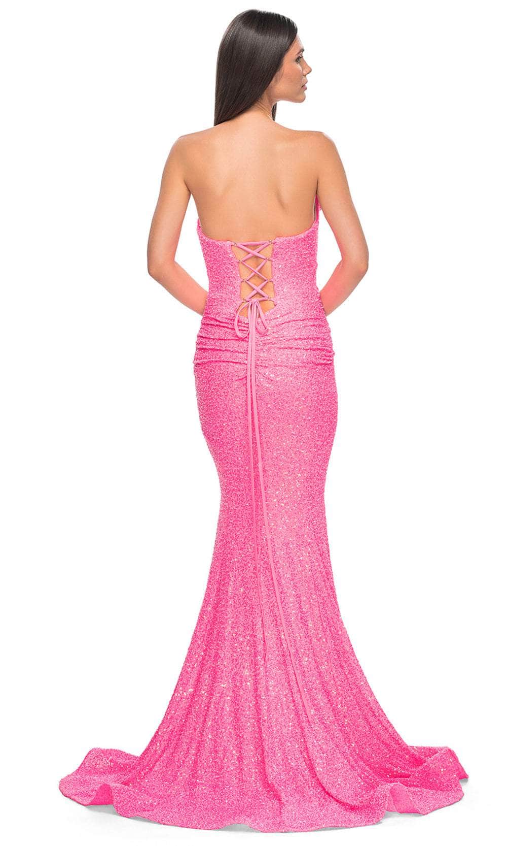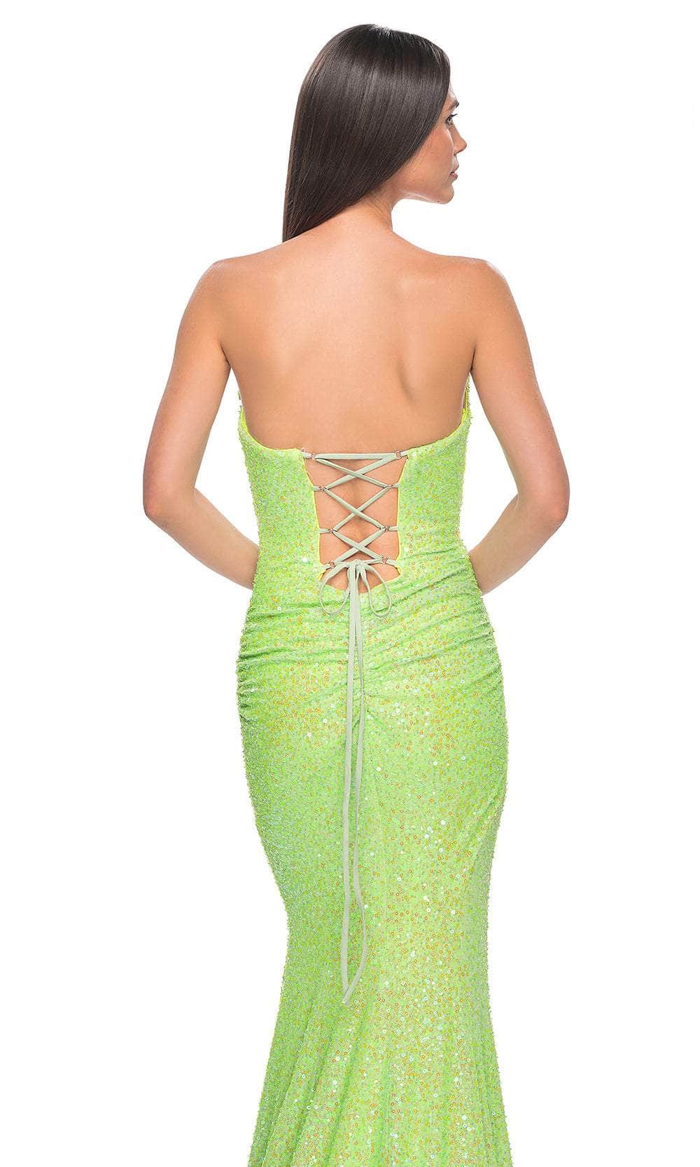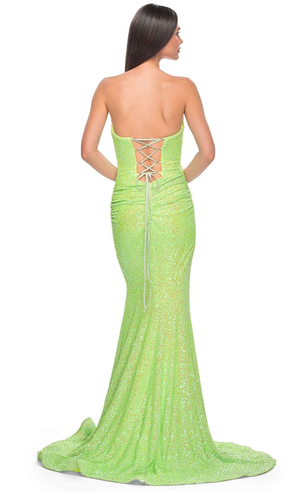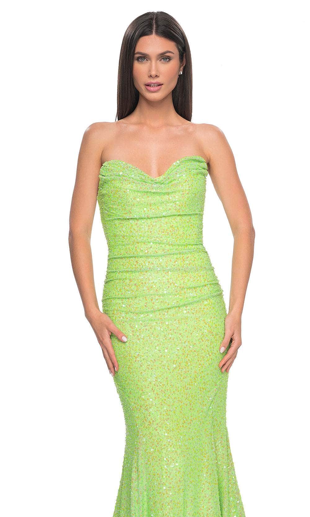 Turn heads all night long in this La Femme 32092 masterpiece. This strapless beauty catches the light beautifully with its all-over shimmering sequins adornment. The ruched design showcases your hourglass curves. It includes a sweetheart neckline and corset lace-up back for a custom fit. The skirt glides to the full-length mermaid silhouette, ending with a horsehair hem and sweep train that exudes glamour. Show off your elegant style when you wear this La Femme 32092 gown. Models are wearing Light Aqua, Neon Green, and Neon Pink colors.
