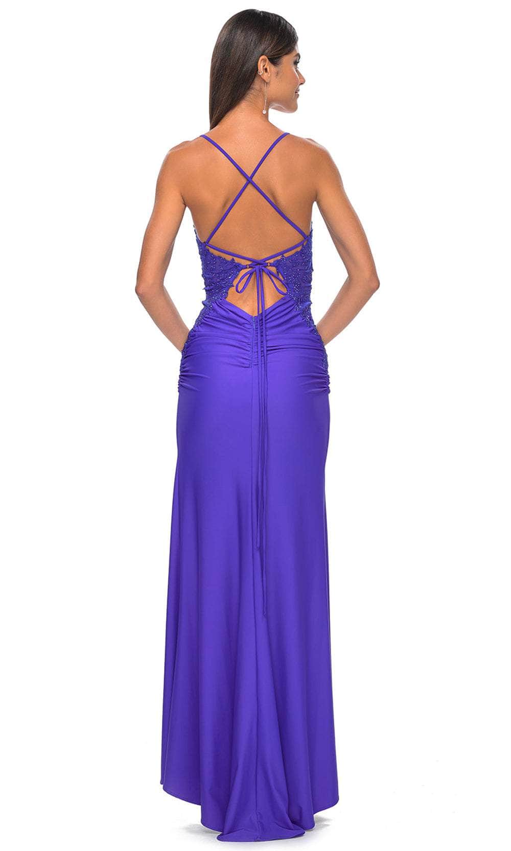 Embrace sophistication with our enchanting La Femme 32139 creation, a fusion of modern elegance and timeless allure. Crafted from luxurious jersey fabric adorned with delicate lace details, this gown boasts an allover design with tailored lines that enhance the feminine silhouette. The bodice features delicate spaghetti straps and a flattering v-neckline, complemented by corset boning for a structured fit. Overlayed with shimmering floral embellishments, the waist is accentuated with a nipped design and sheer sides. The back reveals an open design with a crisscross bandeau detail, infusing the gown with a hint of romance. Completing the look is a sleek sheath silhouette with a daring high slit and a sweeping train, ensuring a captivating entrance at any event. Experience sheer sophistication with our exquisite La Femme 32139 masterpiece. Models are wearing the Dark Berry, Dark Emerald, Light Periwinkle, and Royal Blue colors.