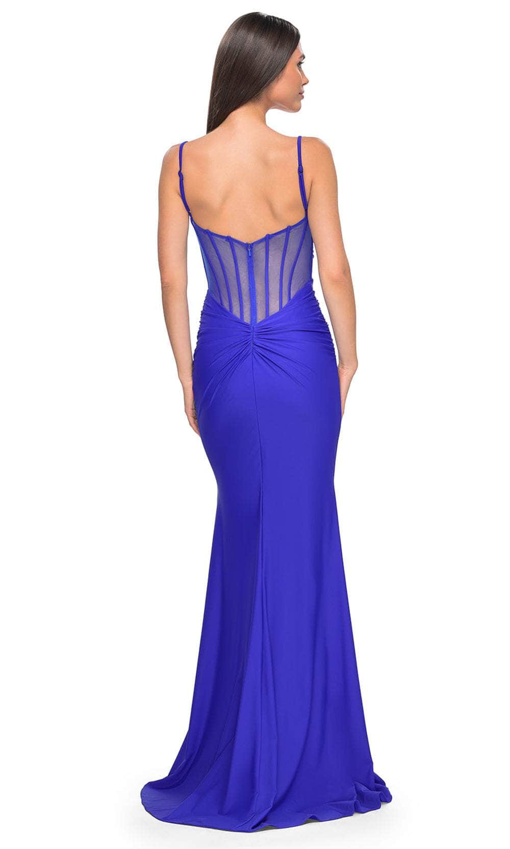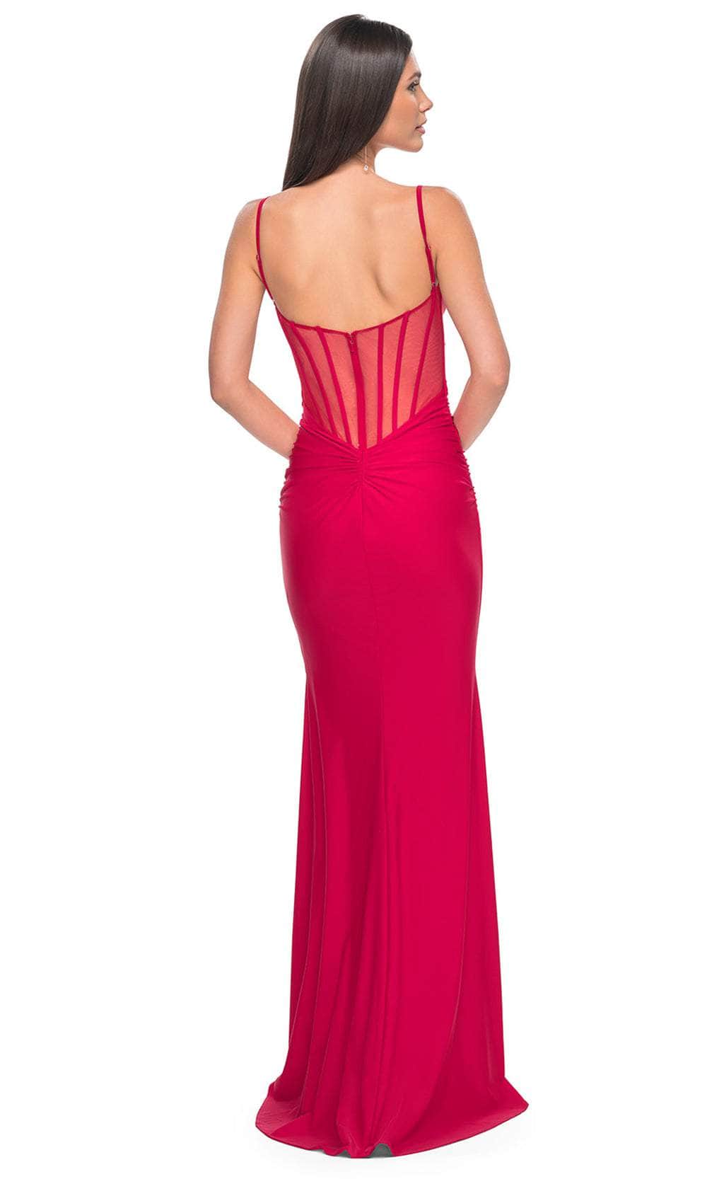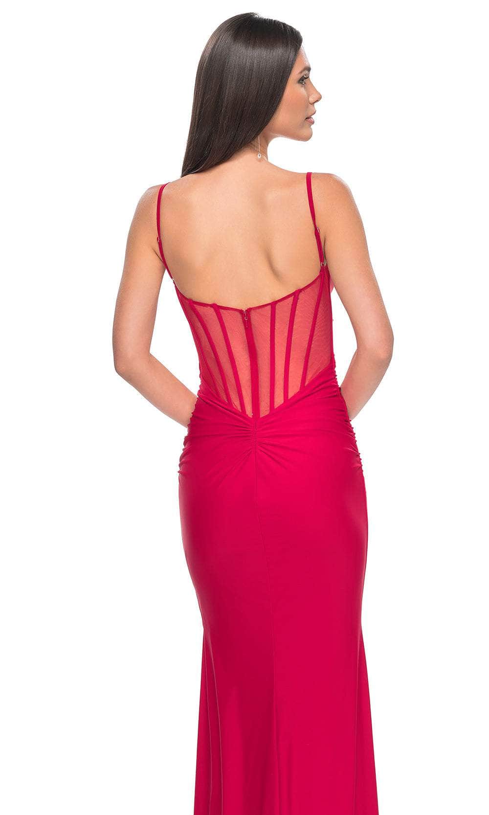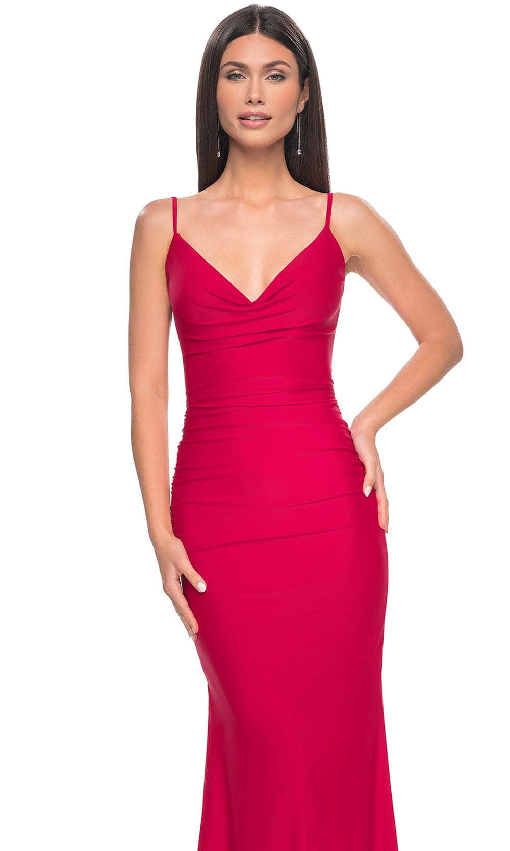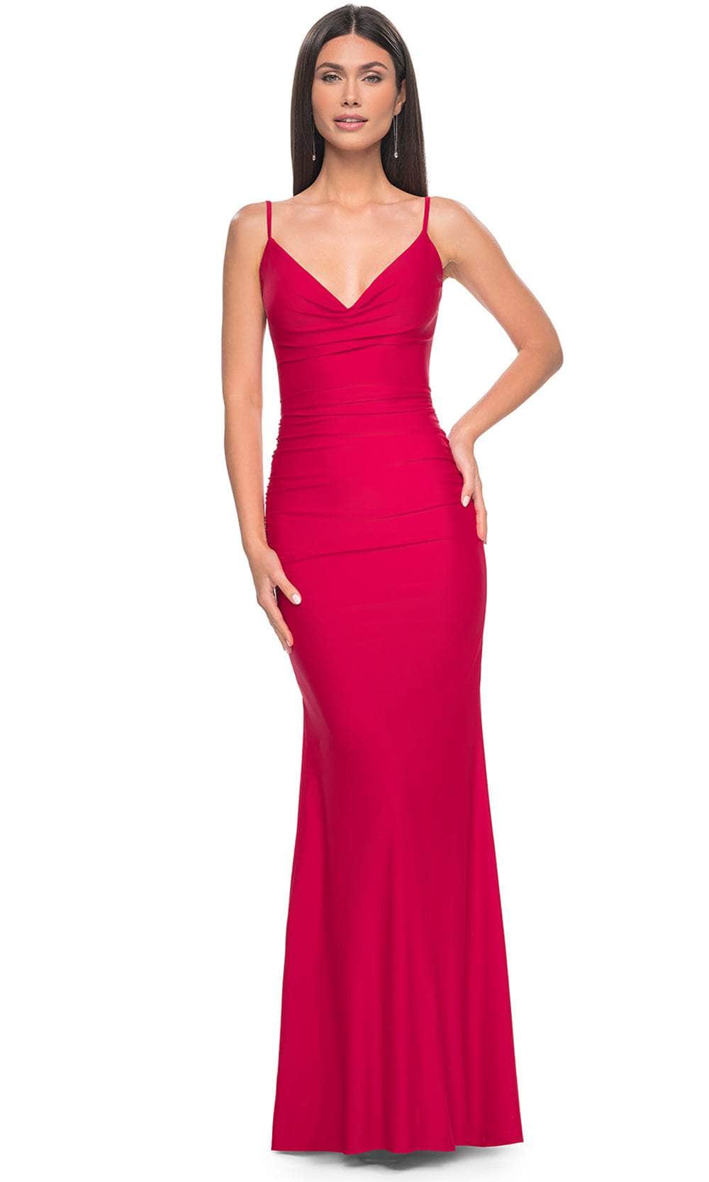 Make a lasting impression with the unmatched beauty of this La Femme 32153 creation. Glamorously crafted with tailoring lines and accented with draping along the bodice, this gown flourishes spaghetti straps trailing into a v-neckline. Crafted with a midrise back accented with corset boning and nipped with a concealed zipper closure, the gown featured a natural waist emphasizes the ensembles narrowest point, while a mermaid silhouette hugs curves and flares out at the knees, culminating in a brush train for added elegance. Elevate your style with the unparalleled sophistication La Femme 32153 creation. Models are wearing the Black, Dark Teal, Red, and Royal Blue colors.