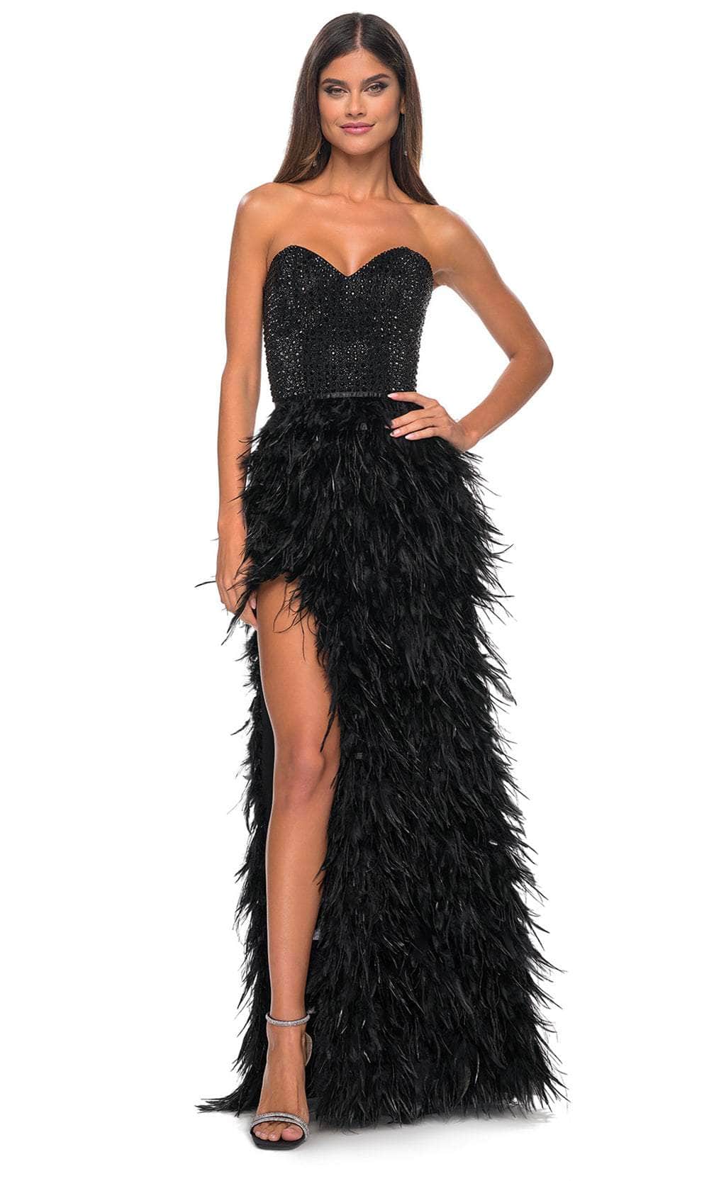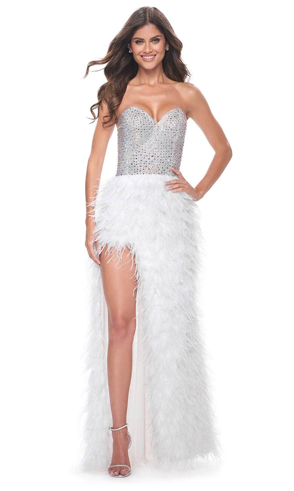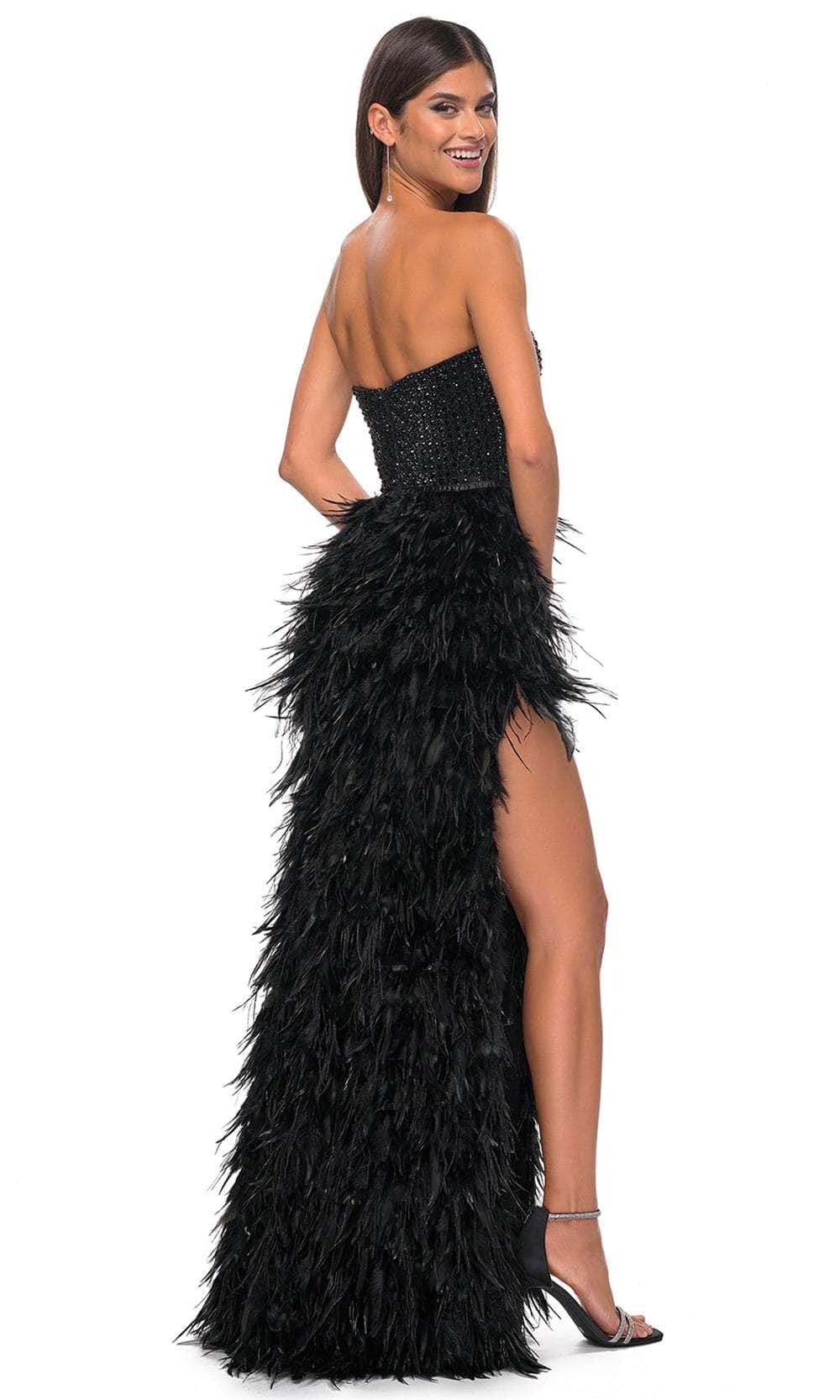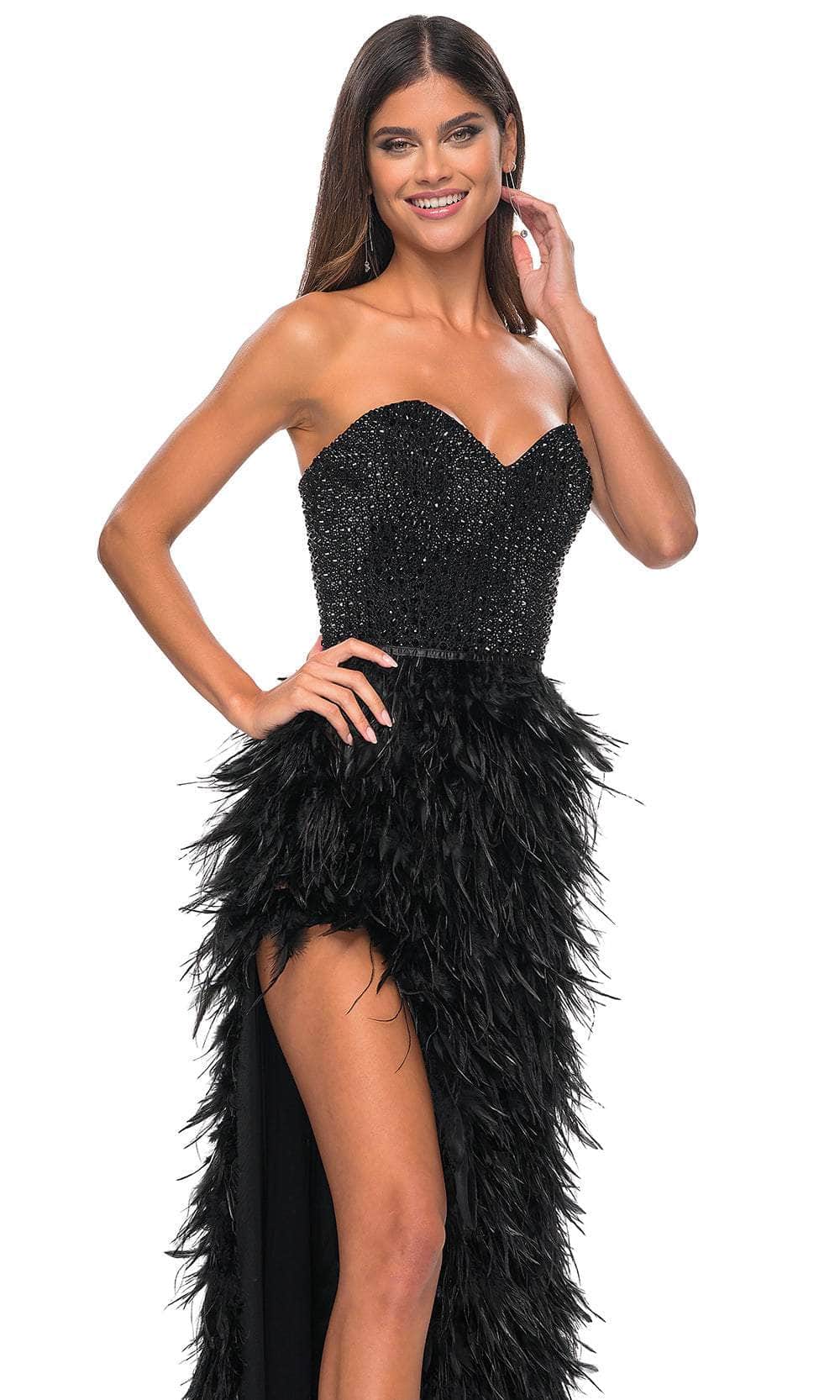 Make a timeless impression in this jaw-dropping La Femme 32165 creation. This gown has beaded rhinestone detailing on the top bodice that adds just a right amount of sparkle. It shows off a beautiful sweetheart neckline, and mid-open back with zipper closure for easy wearing. Soft feathers bring a dramatic touch to the full-length sheath skirt. A seductive thigh-high leg slit finishes this ensemble. This prom gown by La Femme 32165 is a red carpet knockout! Models are wearing Black, and White colors.