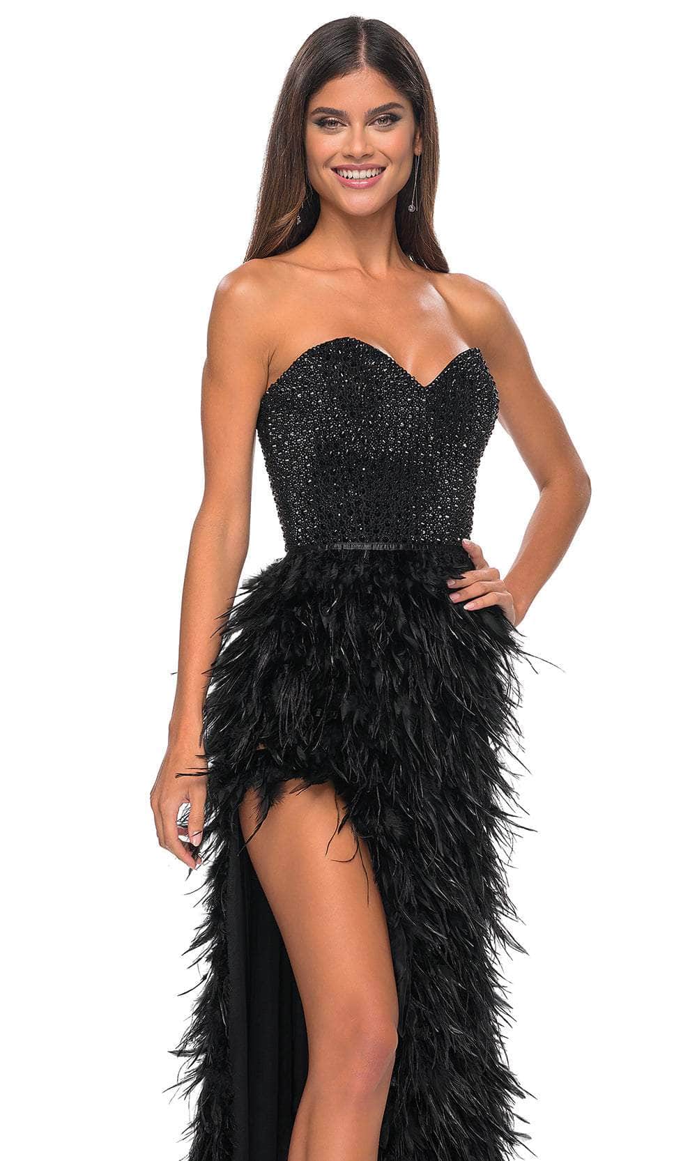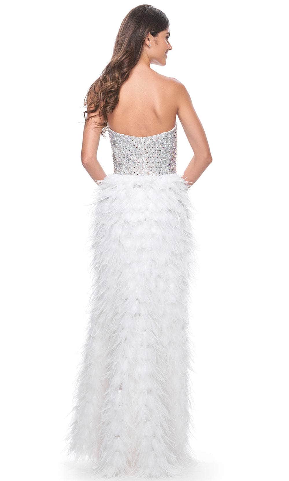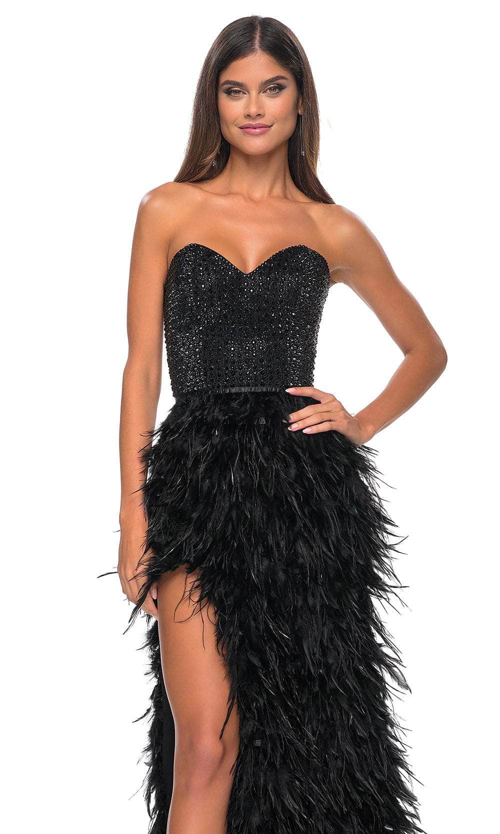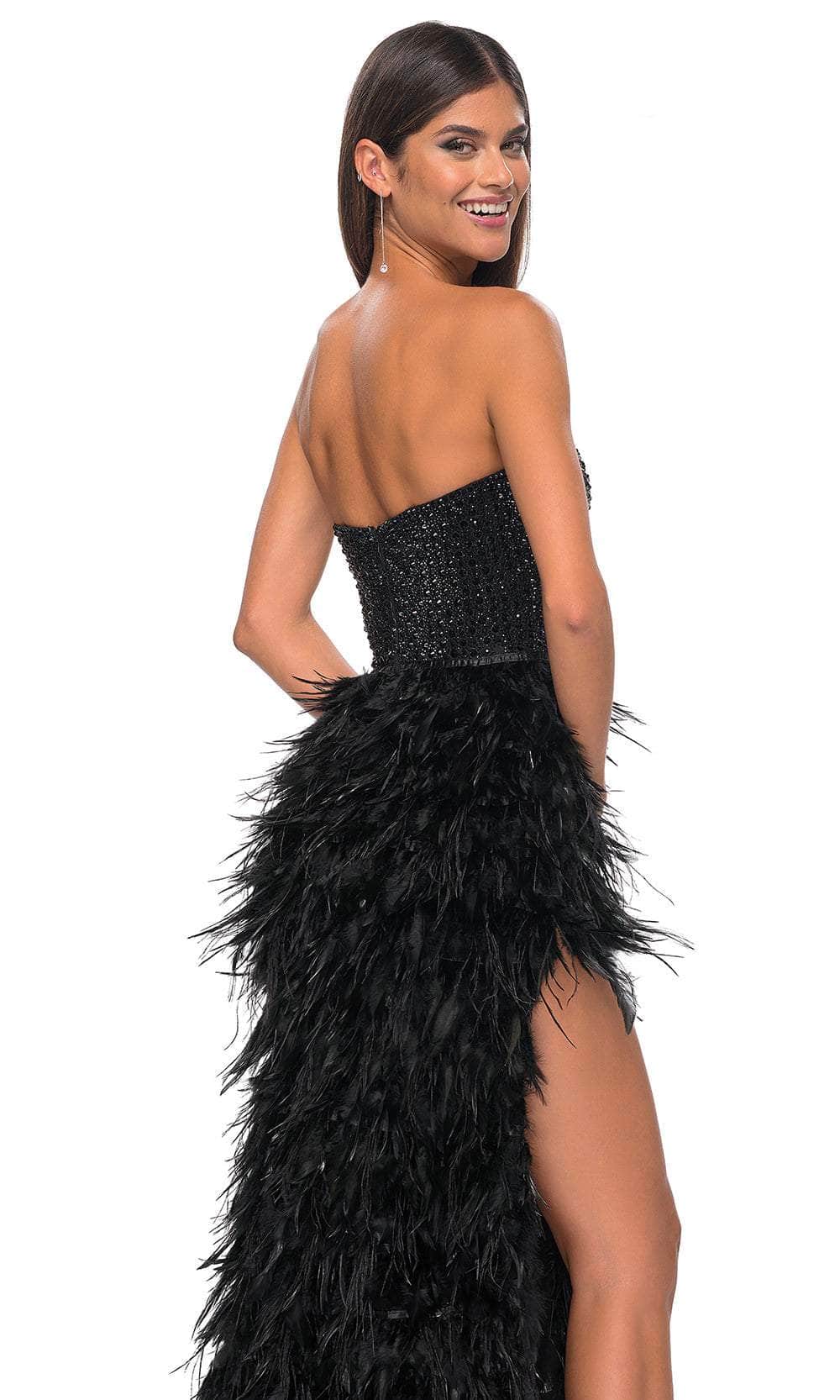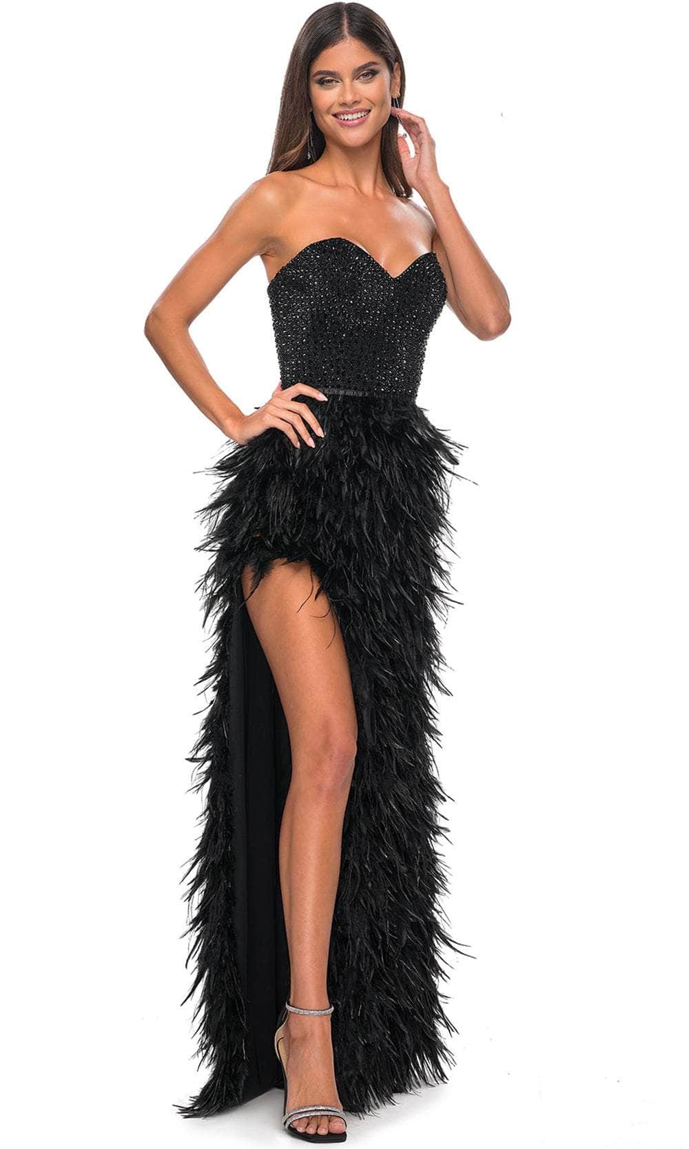Make a timeless impression in this jaw-dropping La Femme 32165 creation. This gown has beaded rhinestone detailing on the top bodice that adds just a right amount of sparkle. It shows off a beautiful sweetheart neckline, and mid-open back with zipper closure for easy wearing. Soft feathers bring a dramatic touch to the full-length sheath skirt. A seductive thigh-high leg slit finishes this ensemble. This prom gown by La Femme 32165 is a red carpet knockout! Models are wearing Black, and White colors.