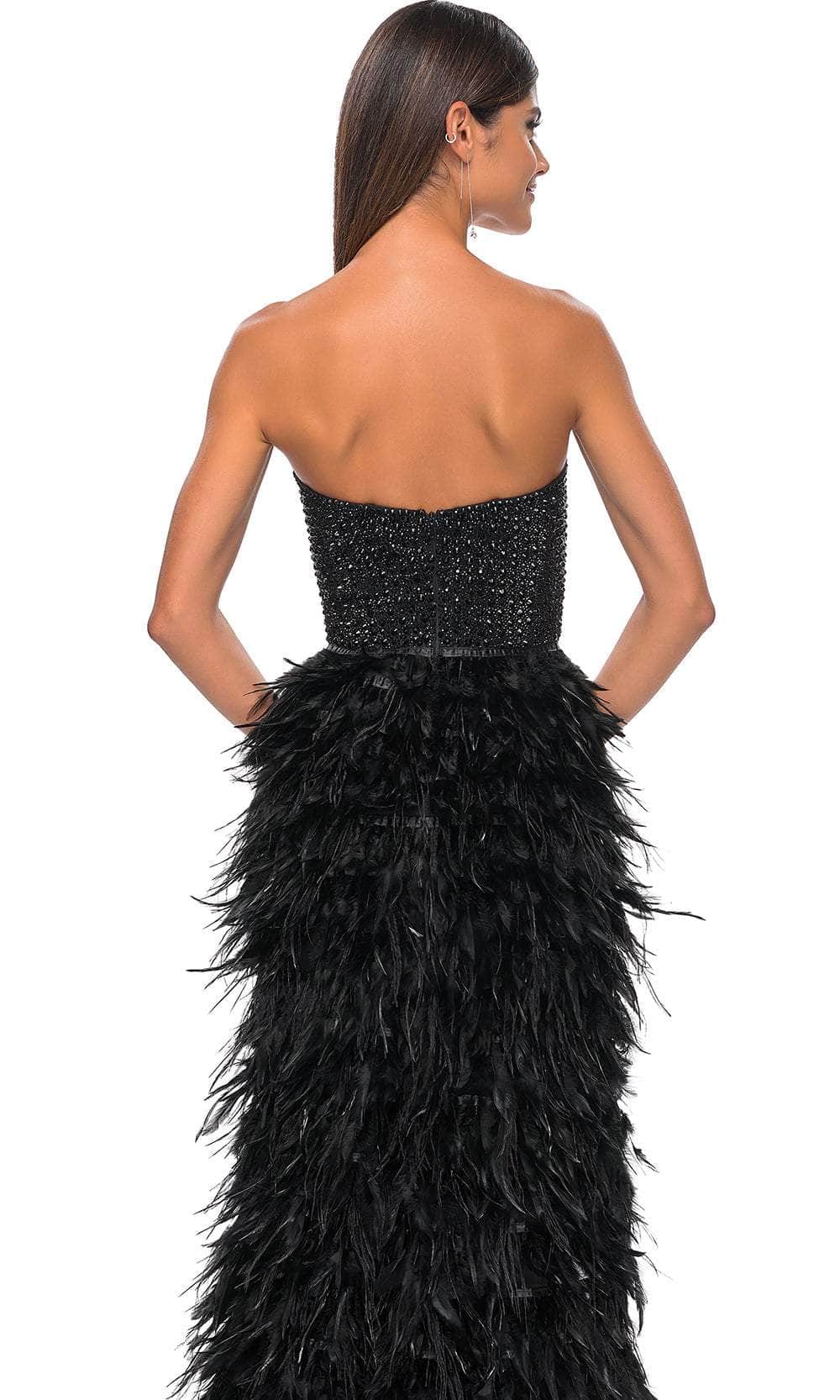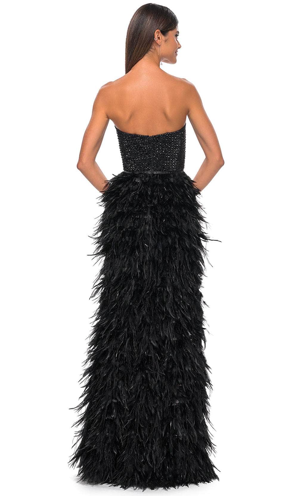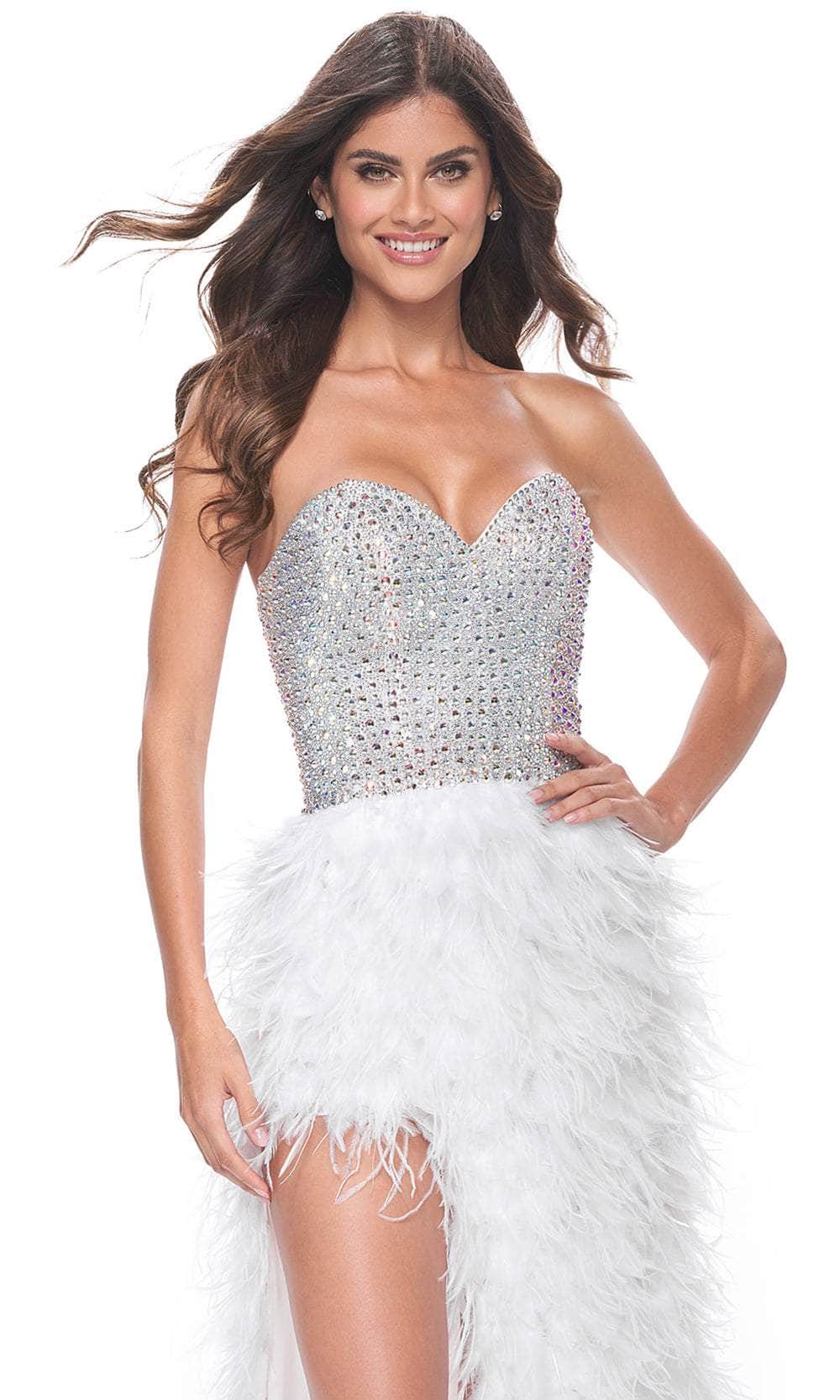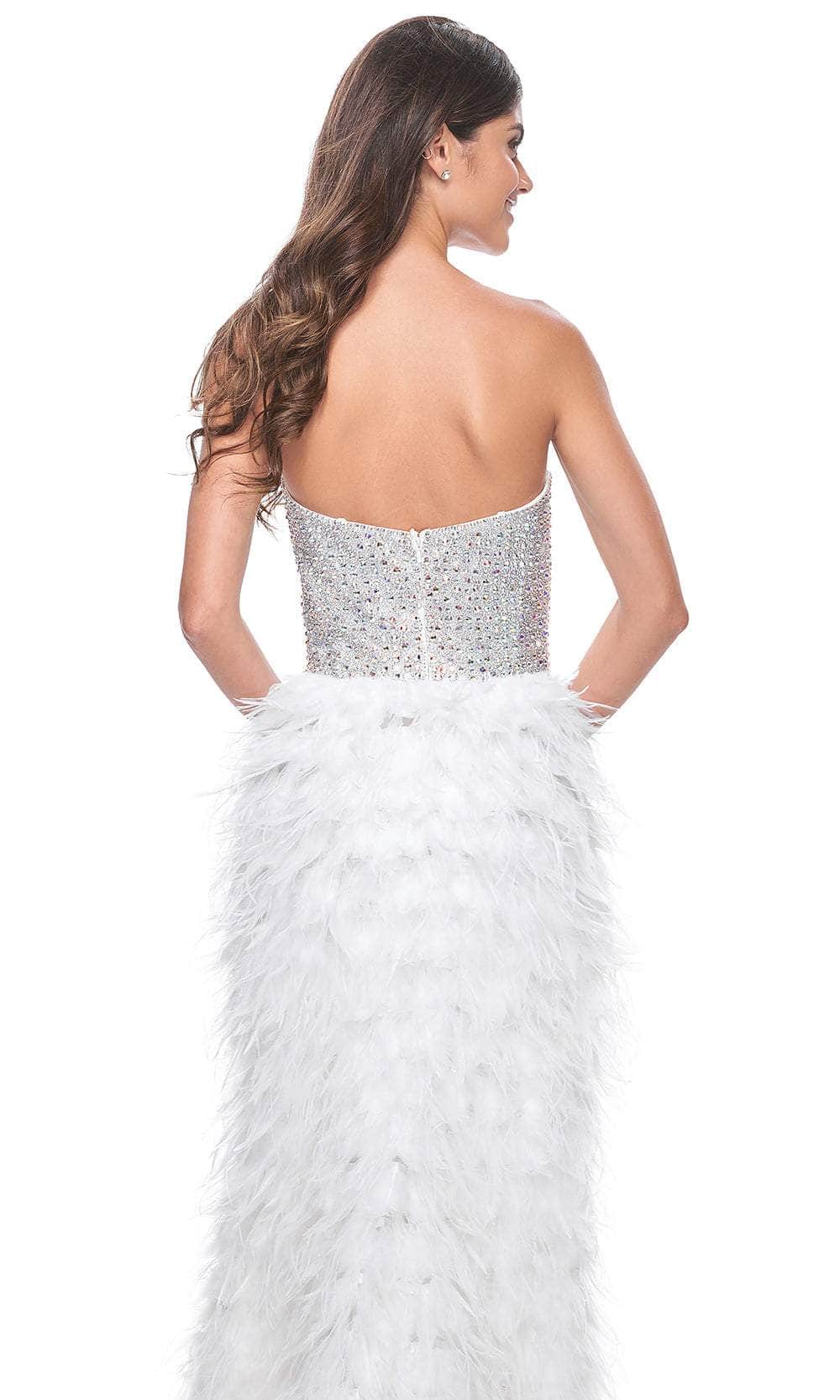 Make a timeless impression in this jaw-dropping La Femme 32165 creation. This gown has beaded rhinestone detailing on the top bodice that adds just a right amount of sparkle. It shows off a beautiful sweetheart neckline, and mid-open back with zipper closure for easy wearing. Soft feathers bring a dramatic touch to the full-length sheath skirt. A seductive thigh-high leg slit finishes this ensemble. This prom gown by La Femme 32165 is a red carpet knockout! Models are wearing Black, and White colors.