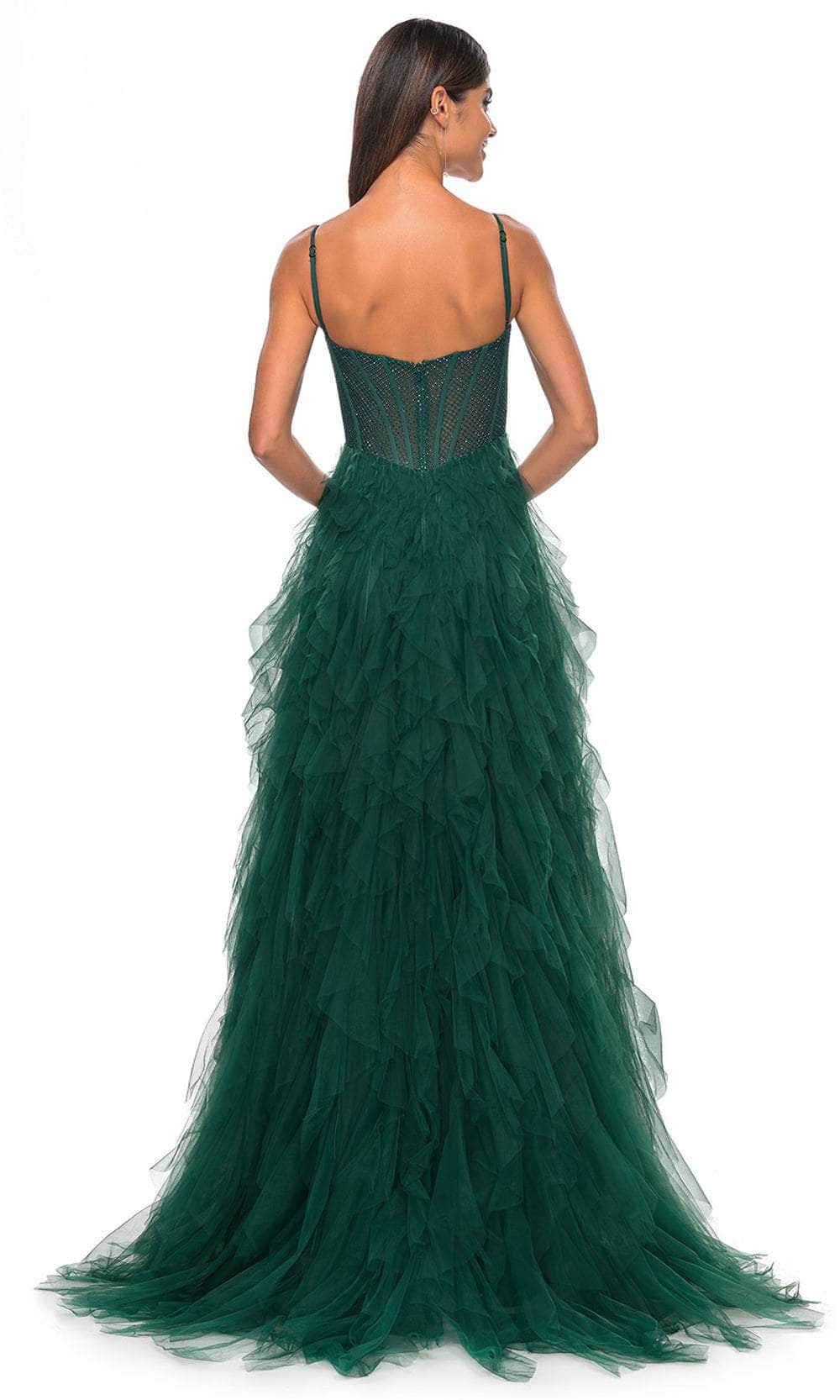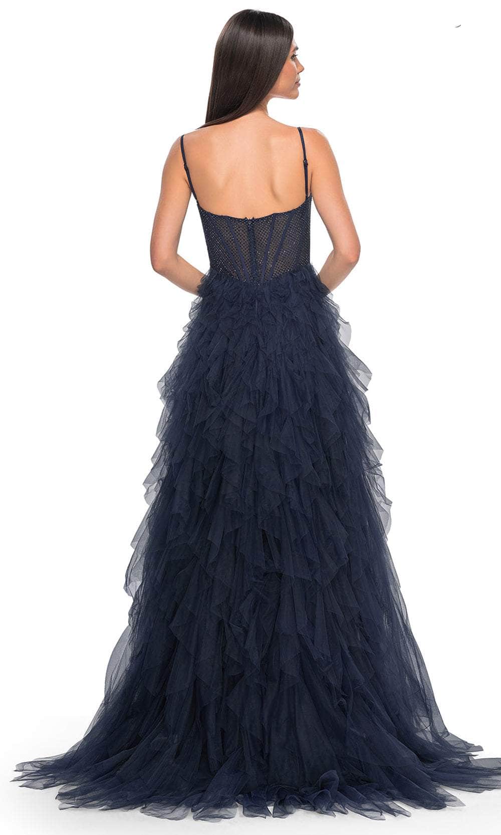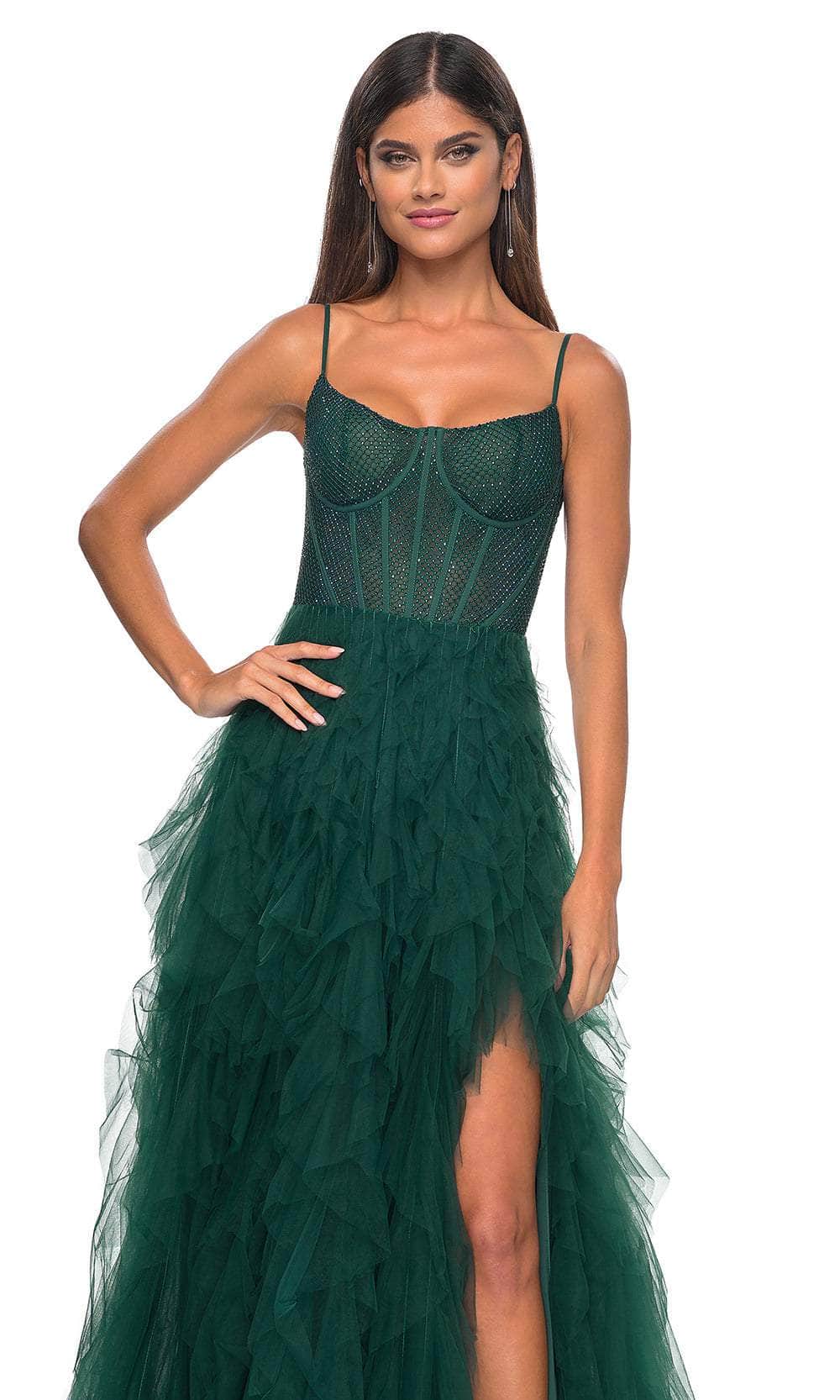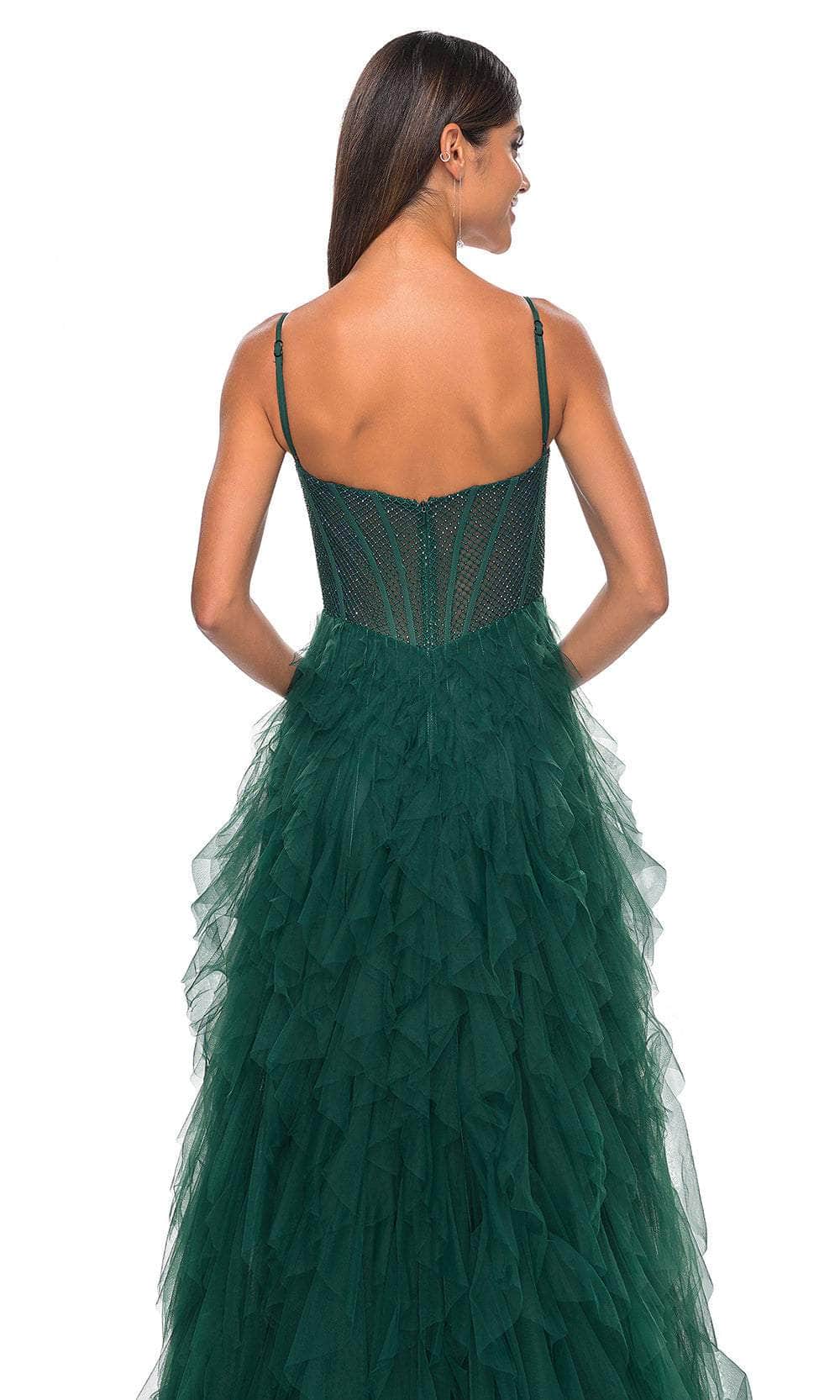 Grace the night with the celestial charm of the La Femme 32233 creation. This exquisite gown showcases tailored lines crafted from delicate tulle, forming a captivating silhouette. The bodice features spaghetti straps and a flattering scoop neckline, while fishnet overlay with corset boning enhances its allure. The waist is gracefully cinched, accentuating your natural curves, and the sheer midrise back is adorned with corset boning and a concealed zipper closure for a seamless finish. The skirt mesmerizes with tiers of ruffles in an A-line silhouette, complemented by a daring high slit and a sweeping train, ensuring an unforgettable entrance. Immerse yourself in the epitome of sophistication with our exquisite La Femme 32233 masterpiece. Models are wearing the Black, Dark Emerald, Navy, and Red colors.