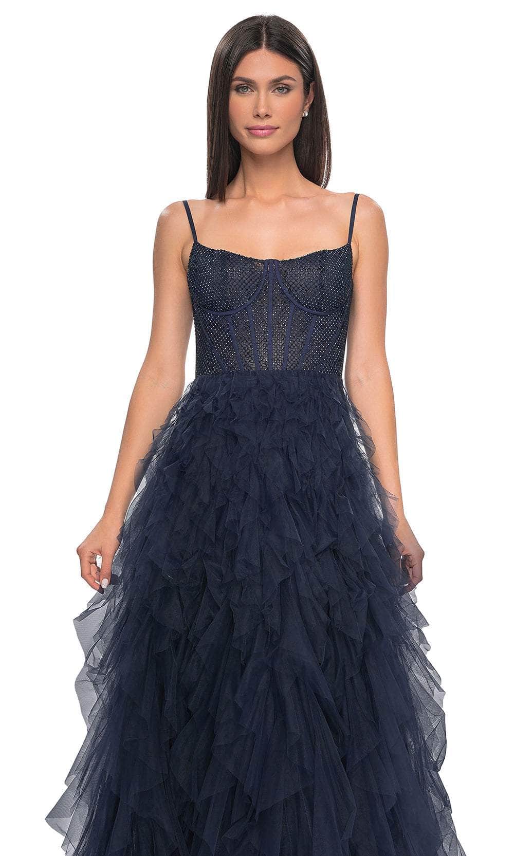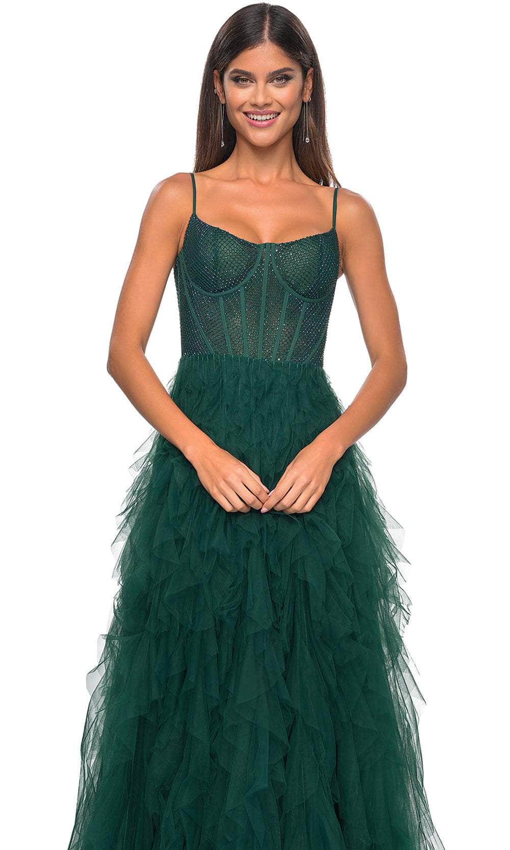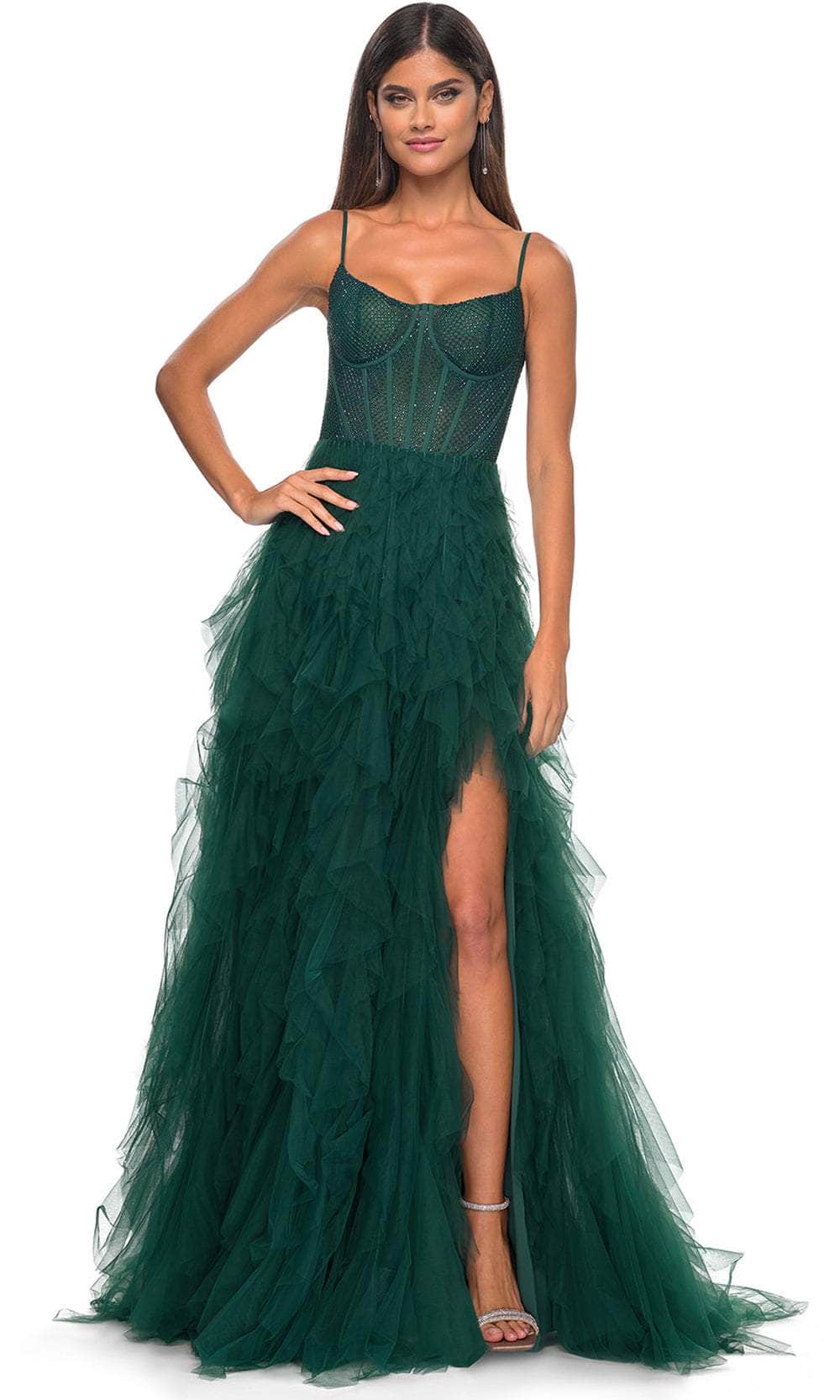 Grace the night with the celestial charm of the La Femme 32233 creation. This exquisite gown showcases tailored lines crafted from delicate tulle, forming a captivating silhouette. The bodice features spaghetti straps and a flattering scoop neckline, while fishnet overlay with corset boning enhances its allure. The waist is gracefully cinched, accentuating your natural curves, and the sheer midrise back is adorned with corset boning and a concealed zipper closure for a seamless finish. The skirt mesmerizes with tiers of ruffles in an A-line silhouette, complemented by a daring high slit and a sweeping train, ensuring an unforgettable entrance. Immerse yourself in the epitome of sophistication with our exquisite La Femme 32233 masterpiece. Models are wearing the Black, Dark Emerald, Navy, and Red colors.