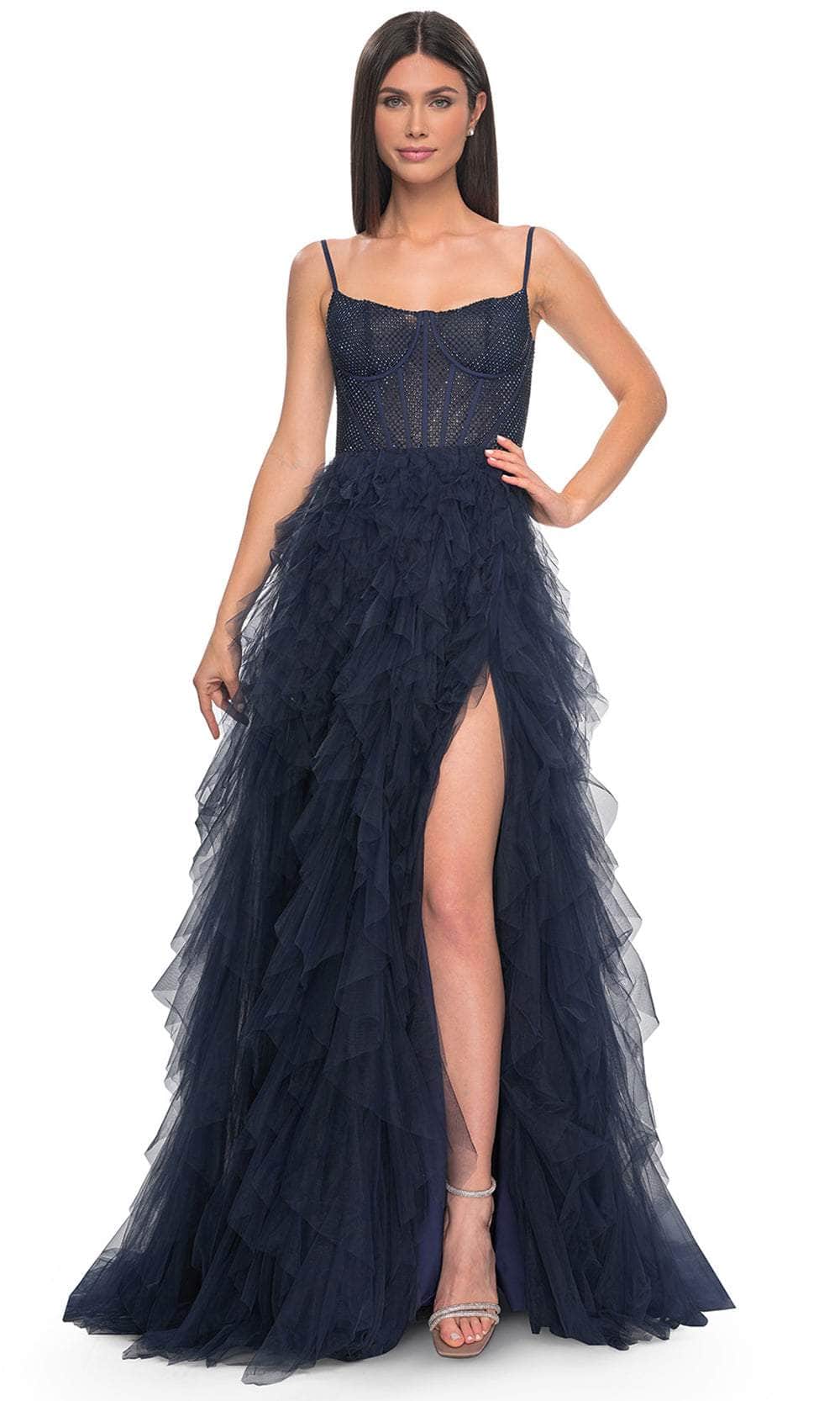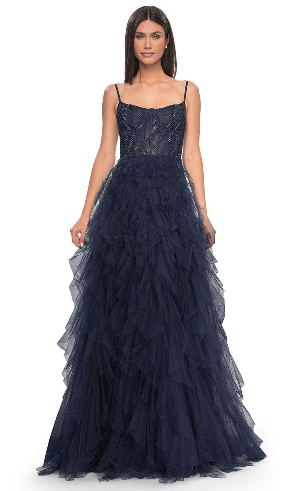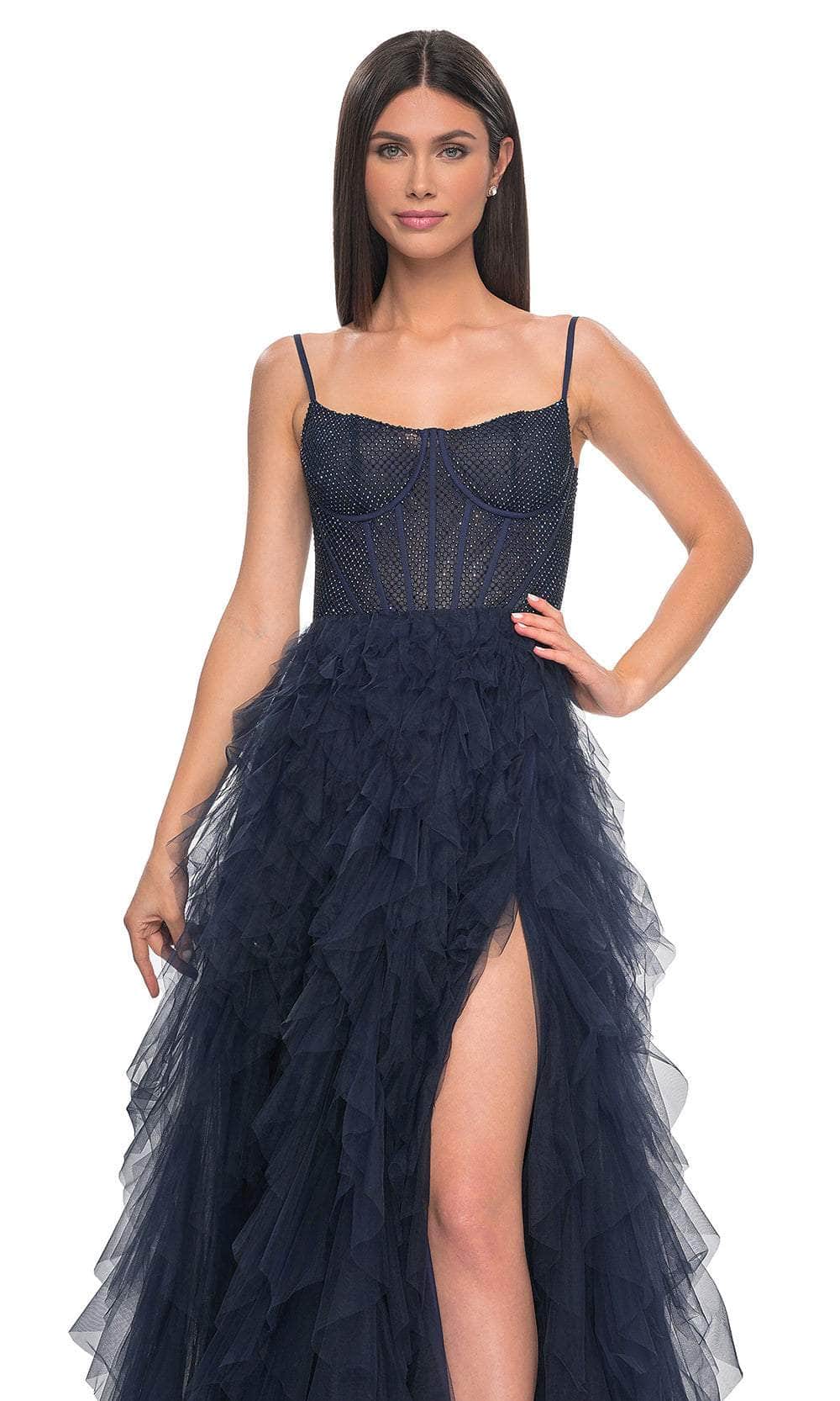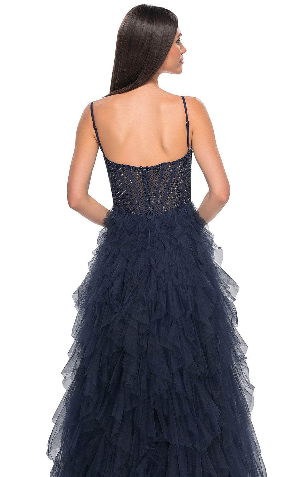 Grace the night with the celestial charm of the La Femme 32233 creation. This exquisite gown showcases tailored lines crafted from delicate tulle, forming a captivating silhouette. The bodice features spaghetti straps and a flattering scoop neckline, while fishnet overlay with corset boning enhances its allure. The waist is gracefully cinched, accentuating your natural curves, and the sheer midrise back is adorned with corset boning and a concealed zipper closure for a seamless finish. The skirt mesmerizes with tiers of ruffles in an A-line silhouette, complemented by a daring high slit and a sweeping train, ensuring an unforgettable entrance. Immerse yourself in the epitome of sophistication with our exquisite La Femme 32233 masterpiece. Models are wearing the Black, Dark Emerald, Navy, and Red colors.