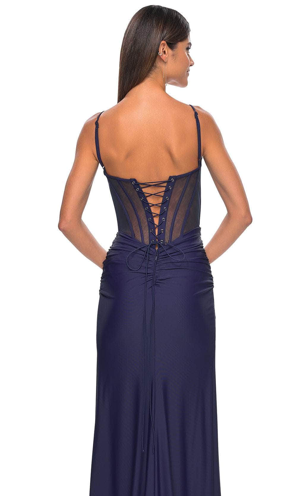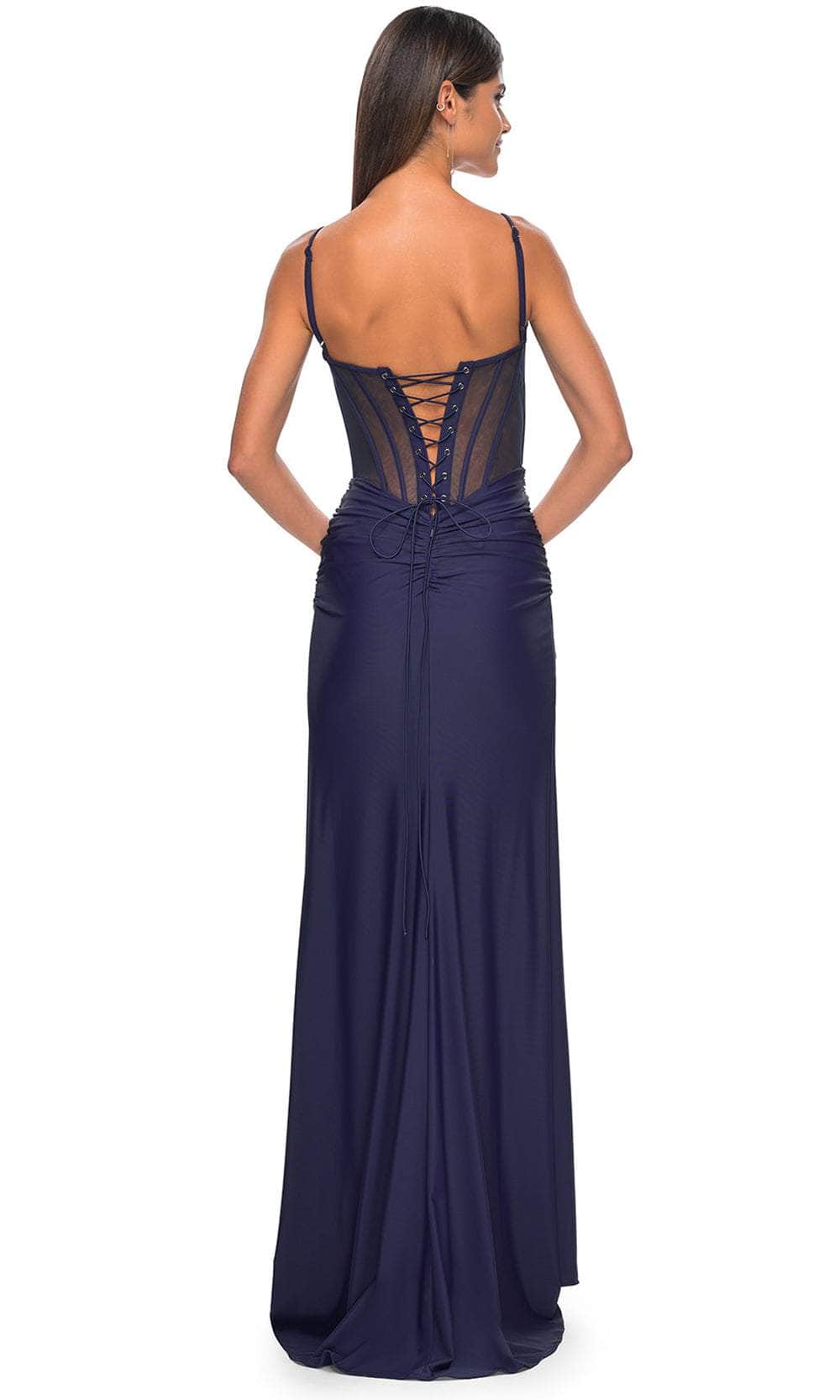 Exude timeless beauty in this creation from La Femme 32238. This sleeveless gown is plain yet glamorous, featuring a corset boning bodice that offers a perfect amount of support and a flattering fit. The ruched detailing adds a modern touch, while the v-neckline is coupled with the sheer mid-open lace-up back. The skirt flows effortlessly to the full length hem in a sheath silhouette. As a dramatic finishing touch, it breaks a thigh-high slit and spills into a sweeping train. Glam up your wardrobe in a hit gown from La Femme 32238. Models are wearing Dark Emerald, and Navy colors.