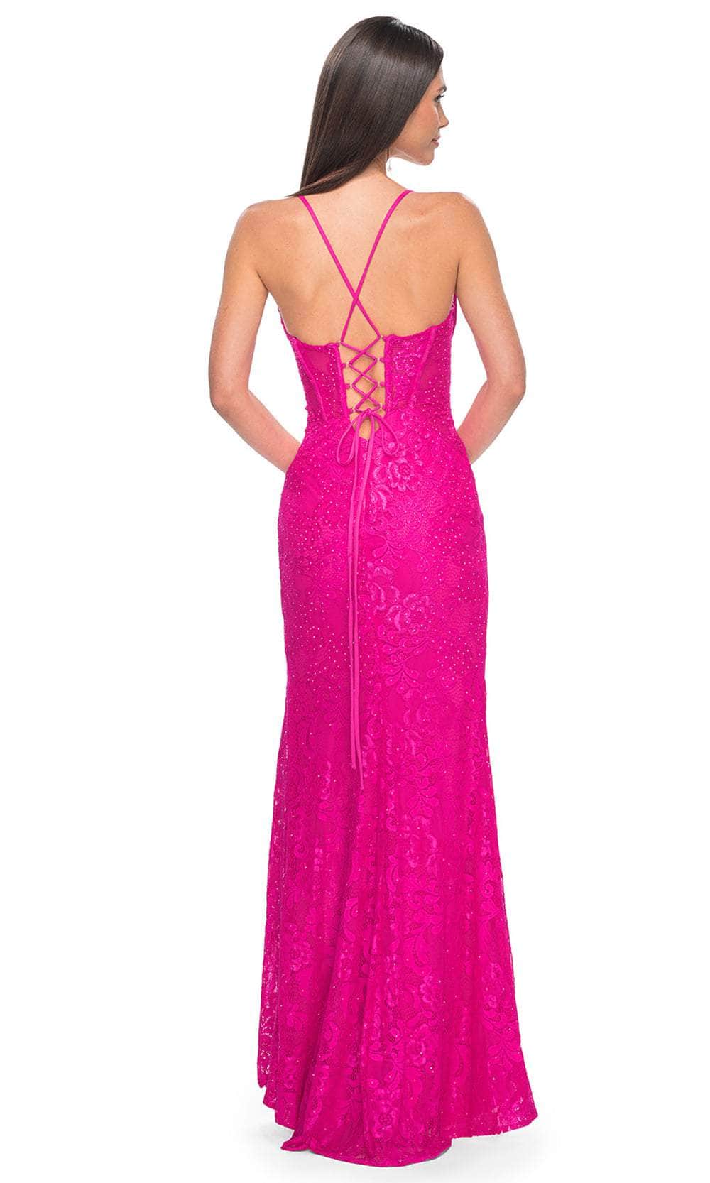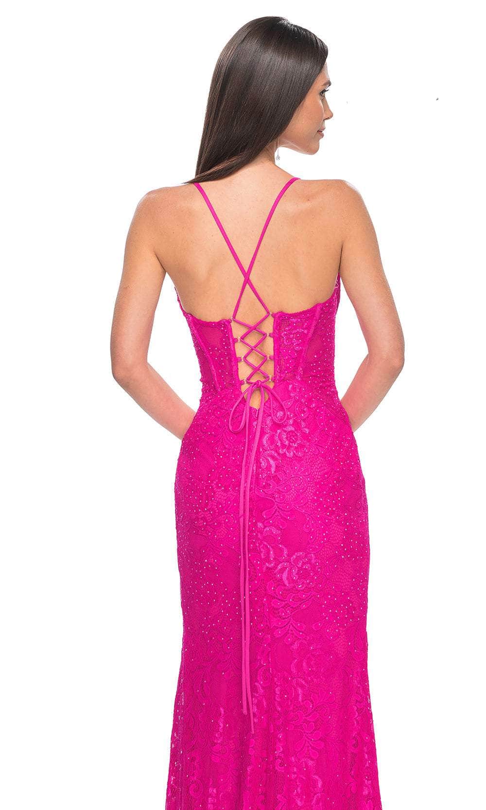 Hypnotize with sophistication in the La Femme 32248 gown, a masterpiece of refined elegance and effortless charm. Adorned with a fascinating overlay of floral lace and a sprinkle of rhinestones, this tantalizing gown reveals a bustier bodice while showing a sweetheart neckline. Strung with spaghetti straps and matched with a midrise back nipped with a lace up design, a high slit sculpts the sheath skirt as it navigates into a sweep of train. Captivate all with your grace donning the mesmerizing La Femme 32248 masterpiece. Models are wearing the Hot Fuchsia, Jade, and Royal Blue colors.