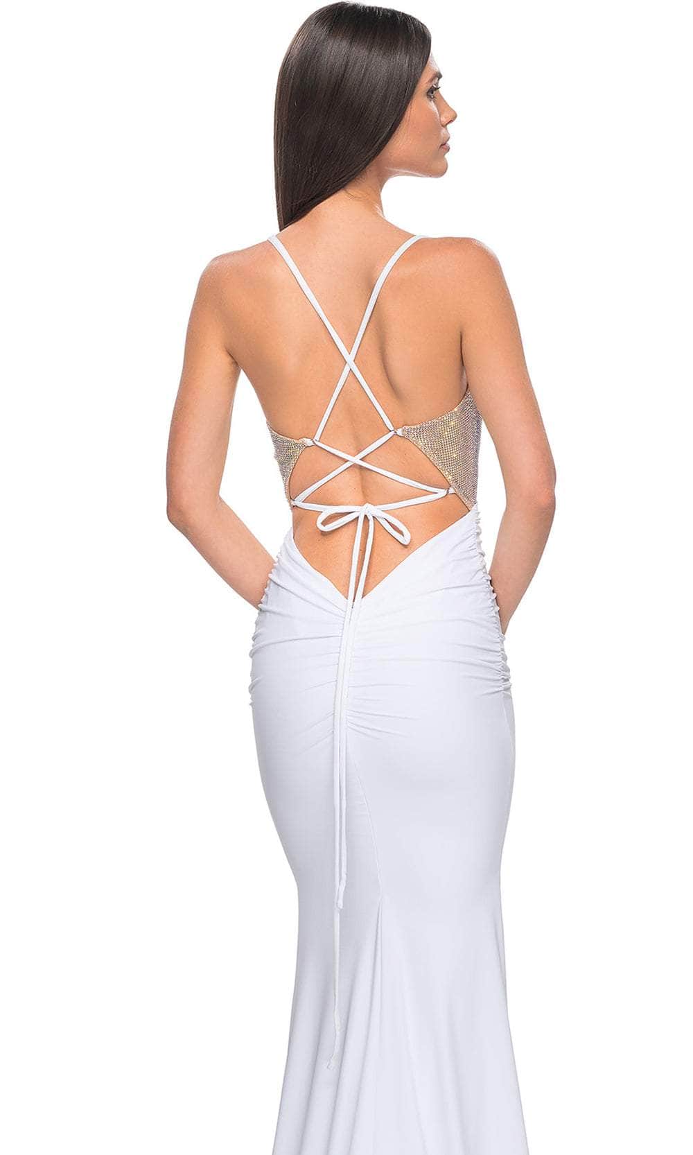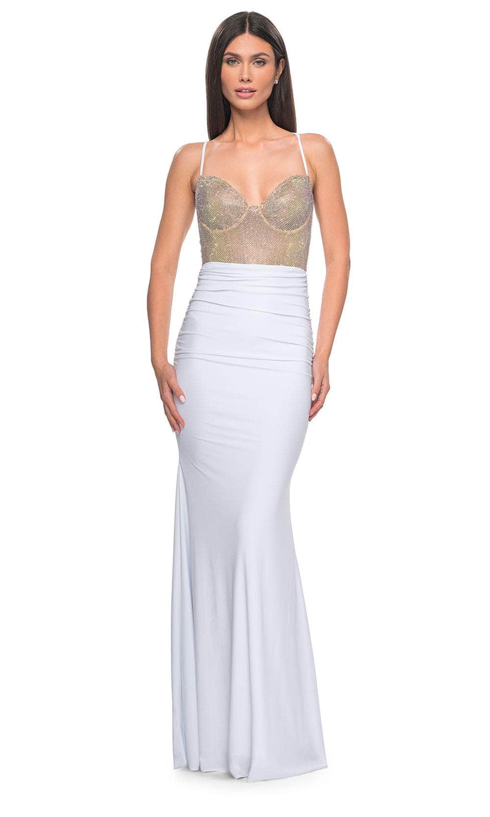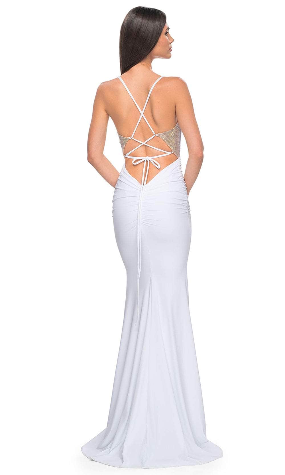 Turn heads all night long in this creation from La Femme 32260. This figure-flattering gown has beaded rhinestone embellishments on the upper bodice that give sparkle and a touch of luxury. It showcases a sweetheart neckline, spaghetti straps, and flirty open back with a strappy lace-up tie closure. The ruched design on the bodice adds a hint of elegance. To finish it off, the skirt flawlessly forms a sheath silhouette that runs to the full length hem and sweep train. Look immaculately gorgeous in this La Femme 32260 gown. Models are wearing Black, Royal Blue, and White colors.