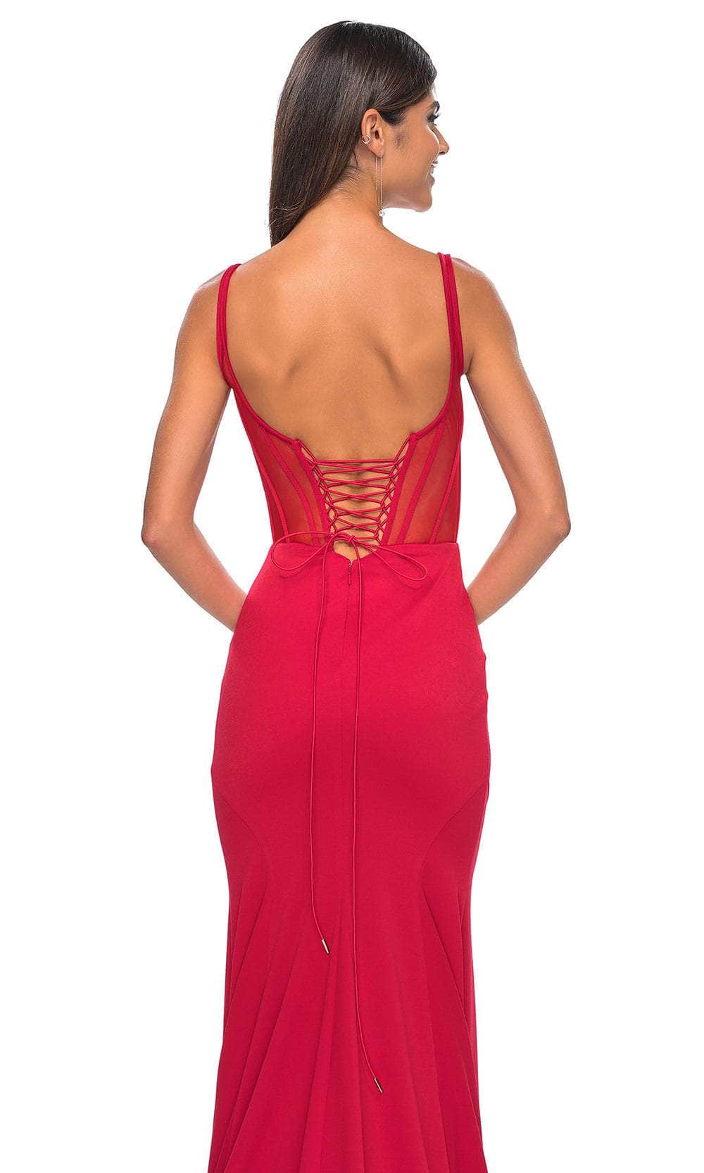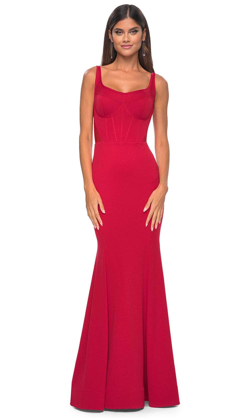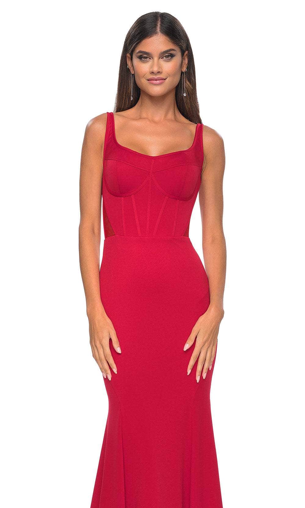 Dazzle onlookers with this elegant piece from La Femme 32268. This sleeveless gown boasts a corset boning bodice that sculpts and shapes your body perfectly. It offers a scoop neckline, thin shoulder straps and natural waist. The illusion back is cut in low scoop-shaped and has an adjustable strappy lace-up closure for an undeniable allure. With a luxurious sweep train that trails behind, the skirt embraces your hips and flares at the knees to make a mermaid silhouette. Leave a lasting impression in this La Femme 32268 gown. Models are wearing Black, and Red colors.