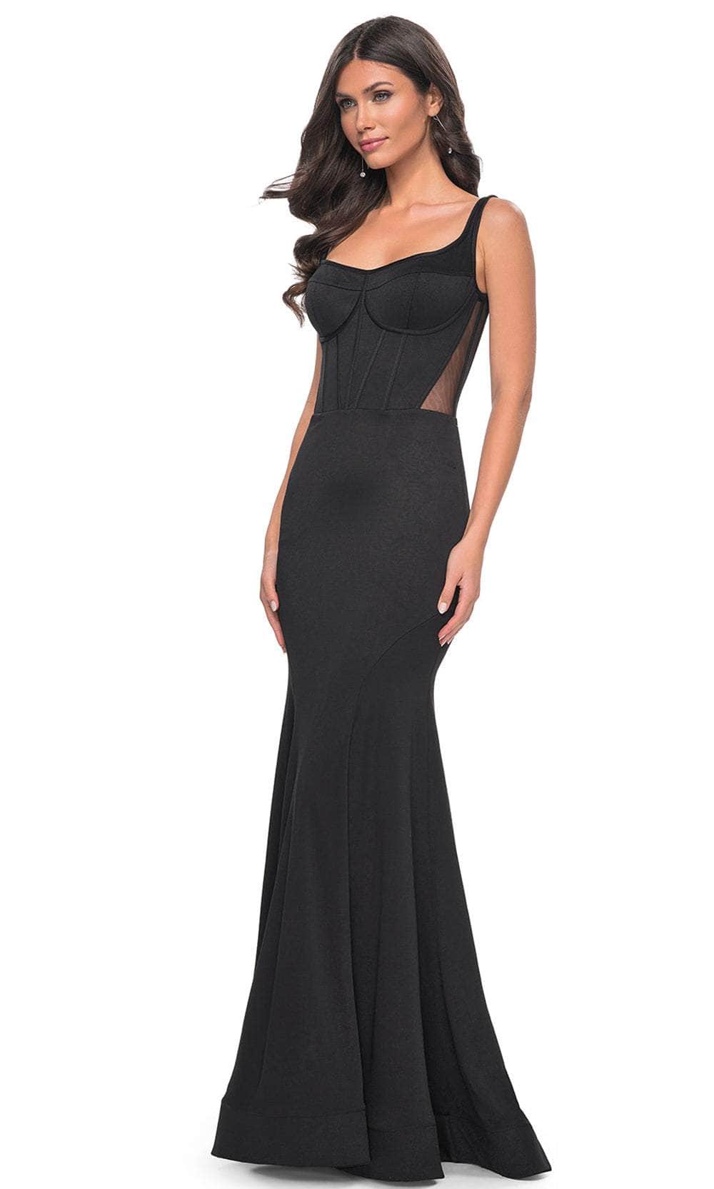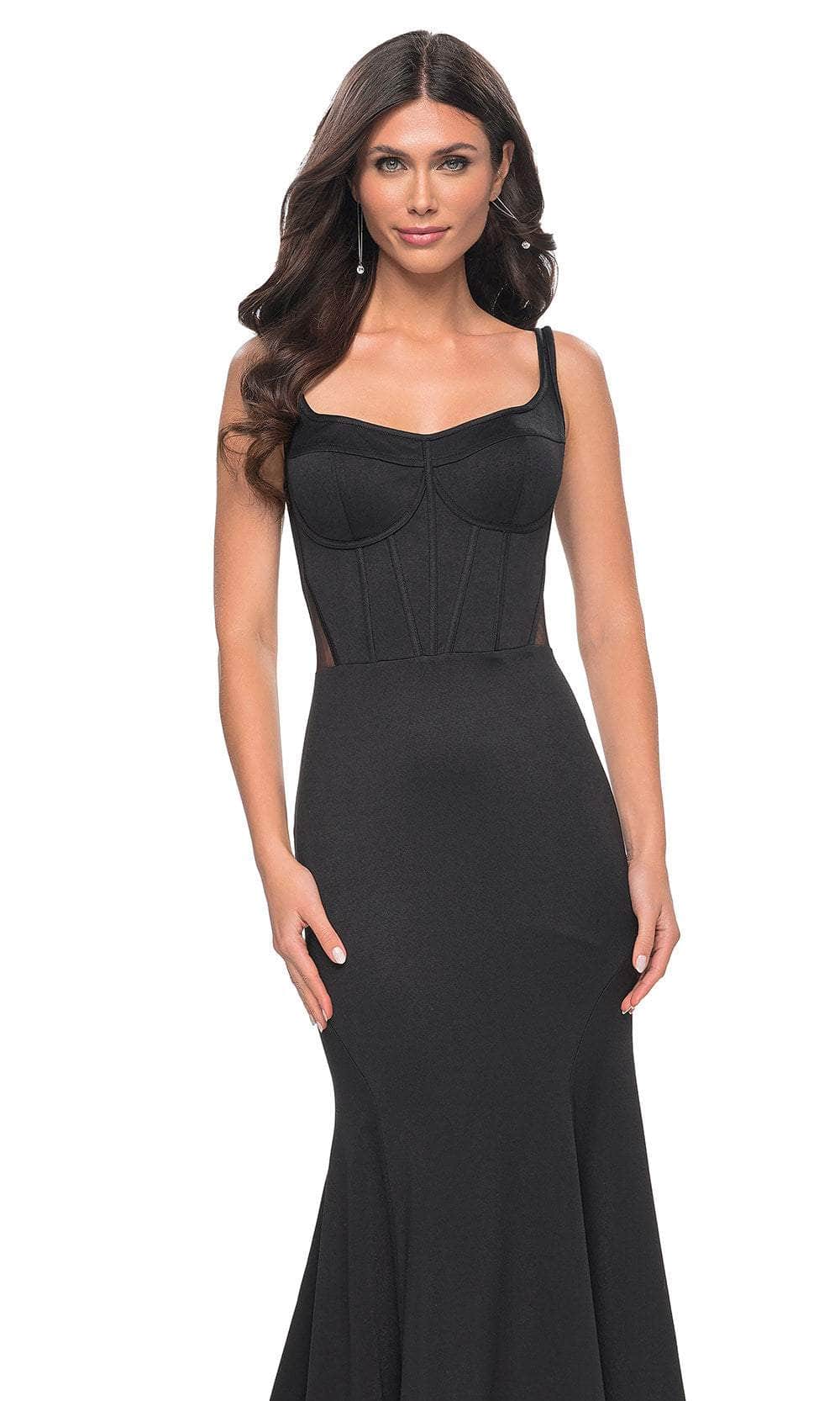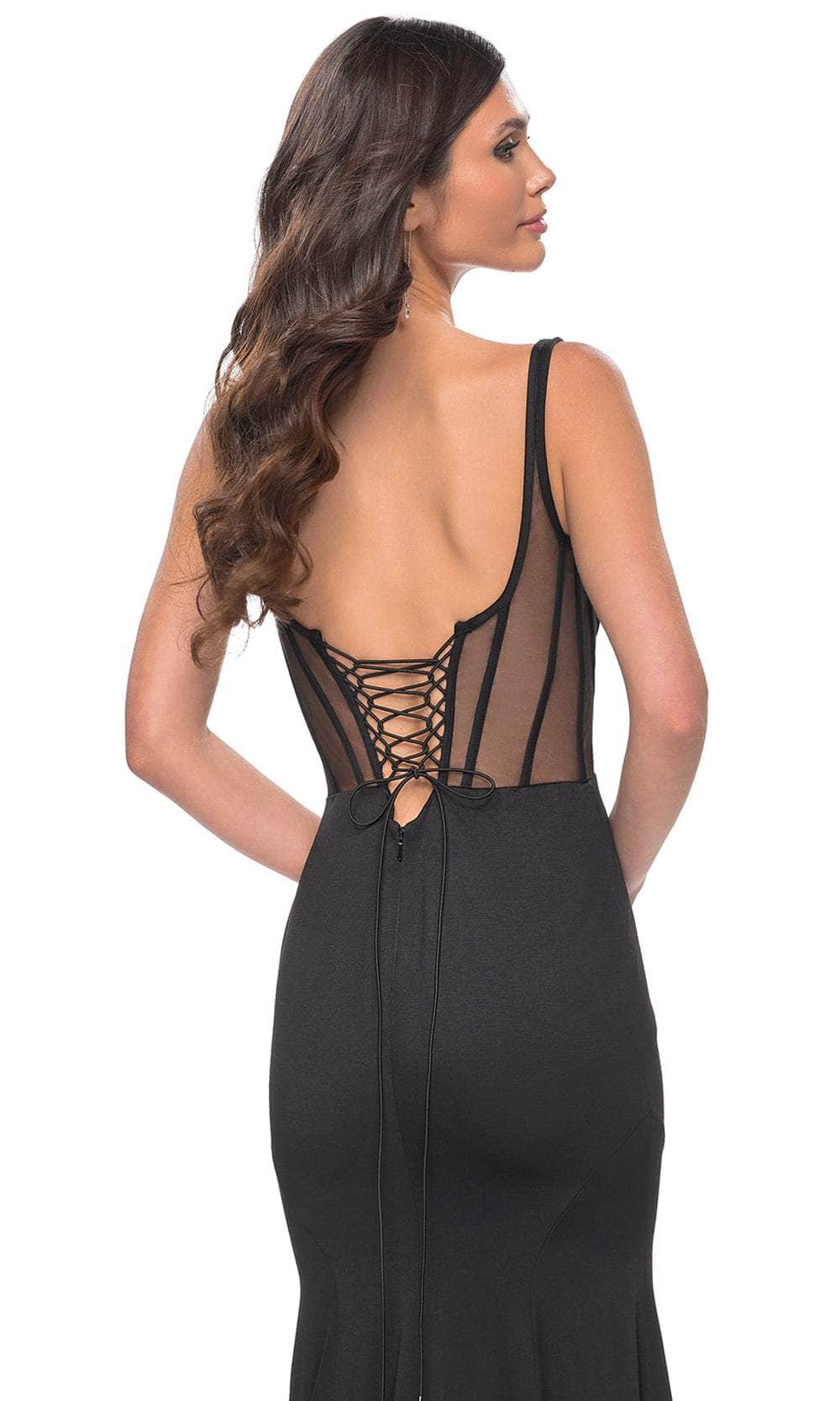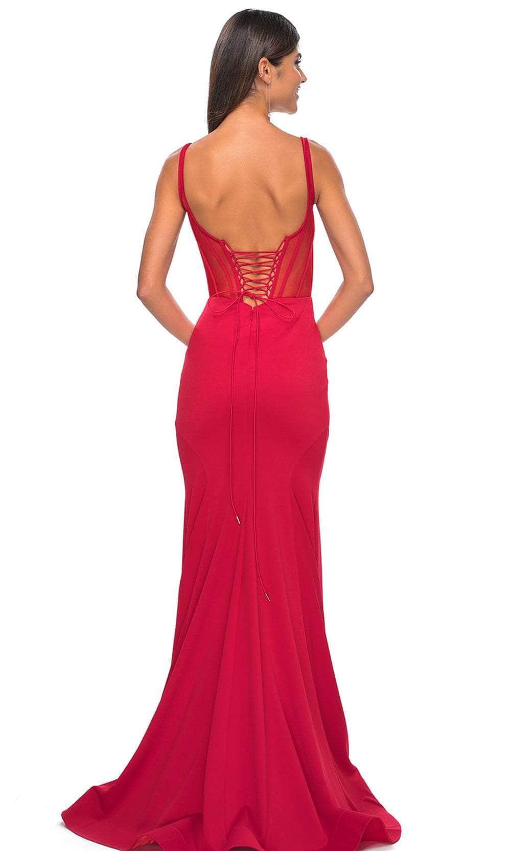 Dazzle onlookers with this elegant piece from La Femme 32268. This sleeveless gown boasts a corset boning bodice that sculpts and shapes your body perfectly. It offers a scoop neckline, thin shoulder straps and natural waist. The illusion back is cut in low scoop-shaped and has an adjustable strappy lace-up closure for an undeniable allure. With a luxurious sweep train that trails behind, the skirt embraces your hips and flares at the knees to make a mermaid silhouette. Leave a lasting impression in this La Femme 32268 gown. Models are wearing Black, and Red colors.