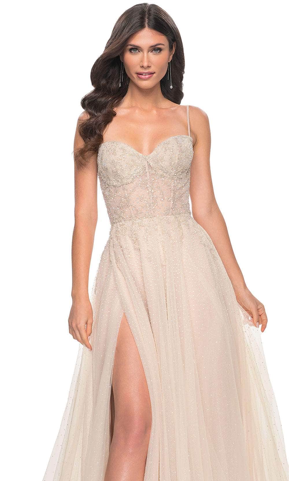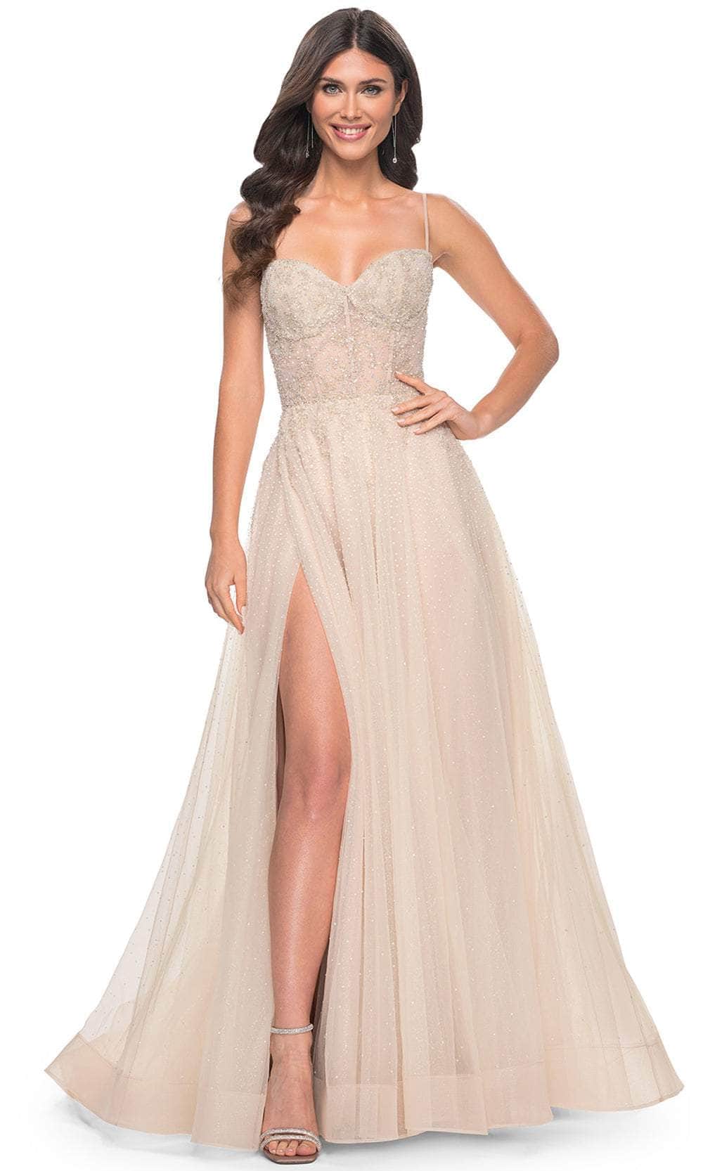 Step into a world of glamour with the La Femme 32271 A-line dress, beautifully adorned with rhinestone embellishments that shimmer under the light. The sweetheart neckline and illusion-bustier top, complete with exposed boning, offer a contemporary twist to this classic design. With a secure back zipper closure, this gown guarantees a perfect fit. The floor-length skirt, featuring a daring high slit, finishes with a dramatic horsehair hem and sweeping train, adding elegance and sophistication. Ideal for any special occasion, this gown will make you feel like royalty. The model is seen in Champagne.table class="table" pdp>