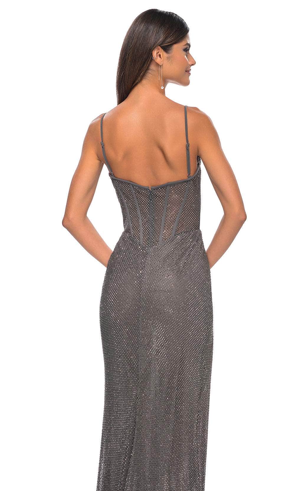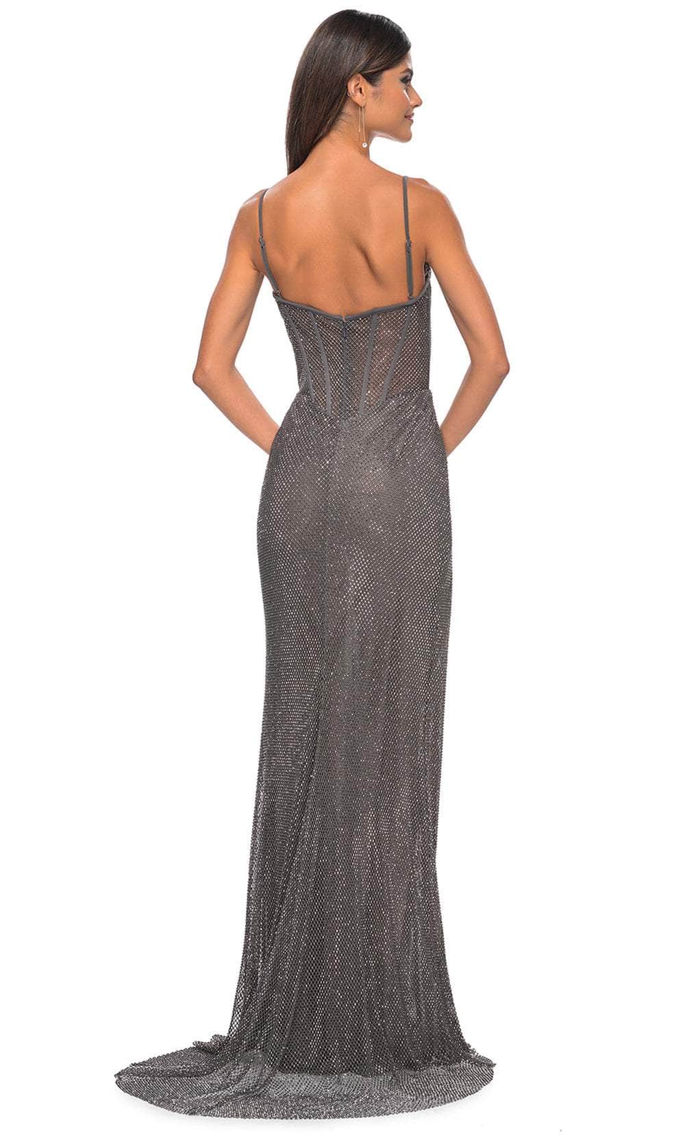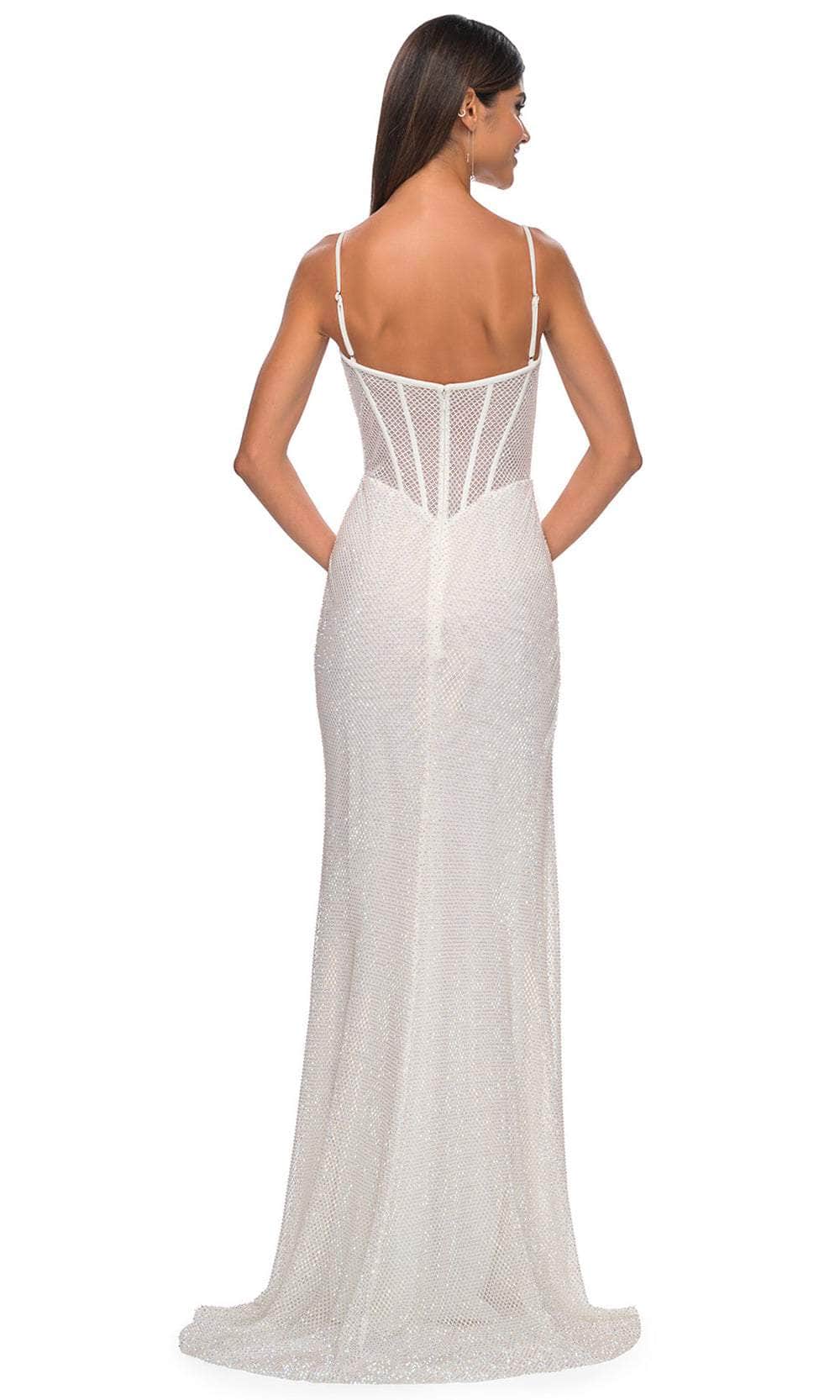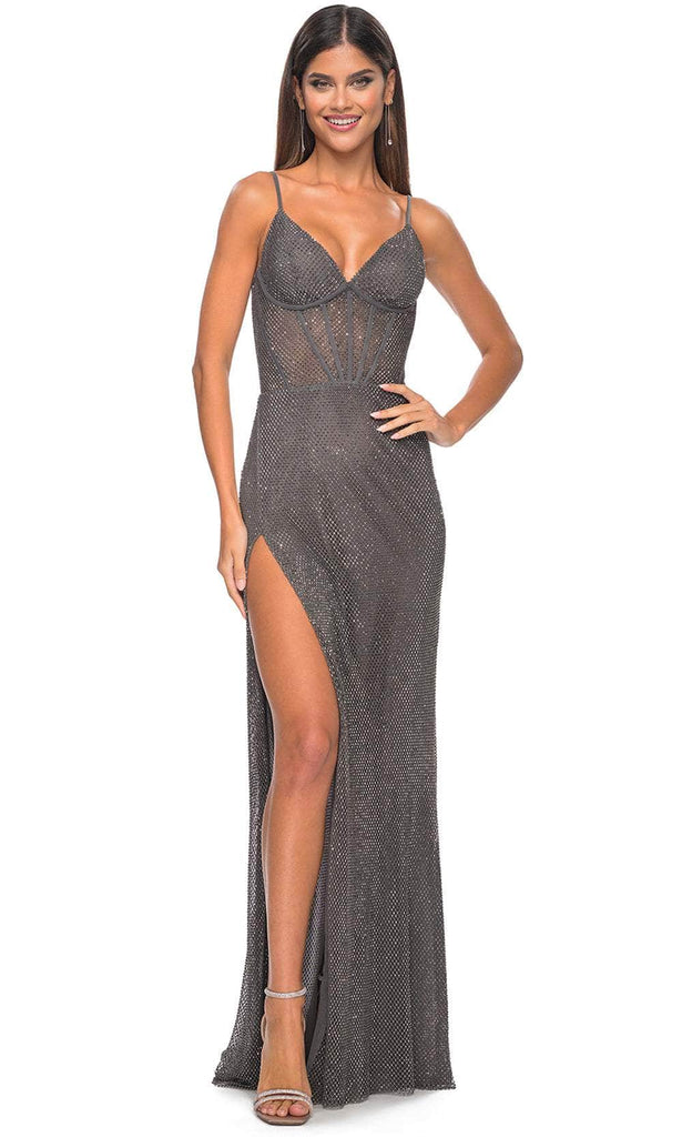 Unleash your inner goddess with this ethereal and enchanting La Femme 32285 creation. Flaunting a sculpted silhouette and graced with seams to enhance the natural curves of the female silhouette, this gown parades delicate spaghetti straps, structured with corset boning to ensure a flattering fit. Its elegant V-neckline accentuates the décolletage. Illusion midrise back creates an elegant silhouette, reinforced with corset boning for structure, while a concealed zipper closure ensures seamless fit. The gown features a natural waistline, accentuating curves, leading to a sleek sheath skirt. A high slit adds allure while maintaining elegance, flowing into a floor-length hem for a stunning silhouette. Flourish pure sophistication in this stunningly made La Femme 32285 masterpiece. Models are wearing the Gunmetal, Navy, and White colors.