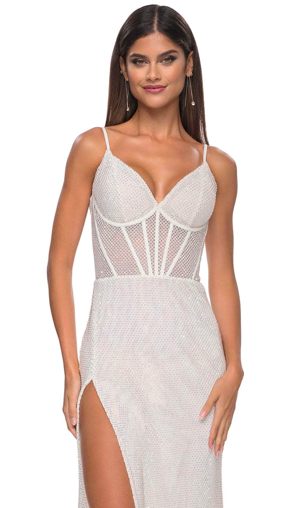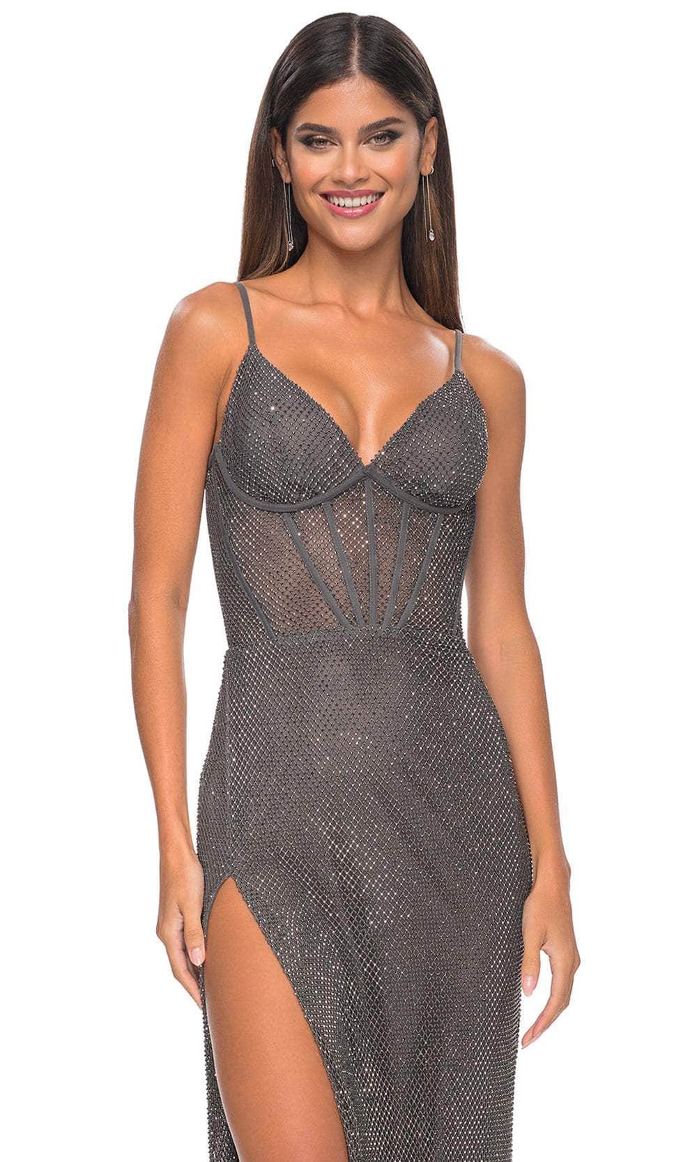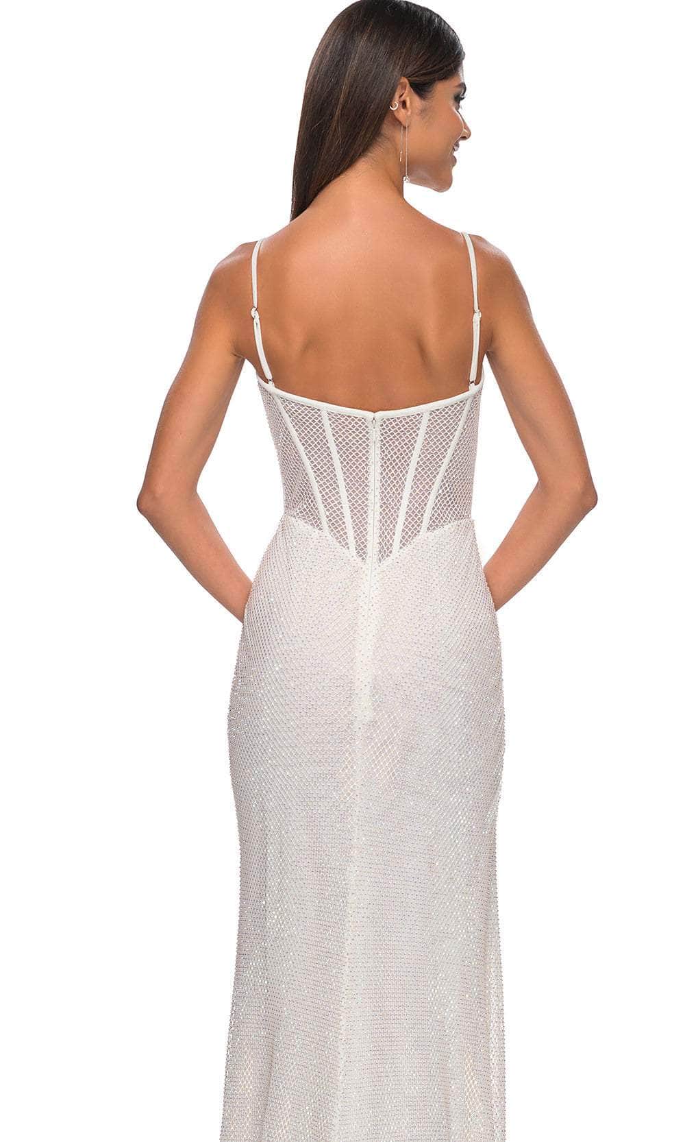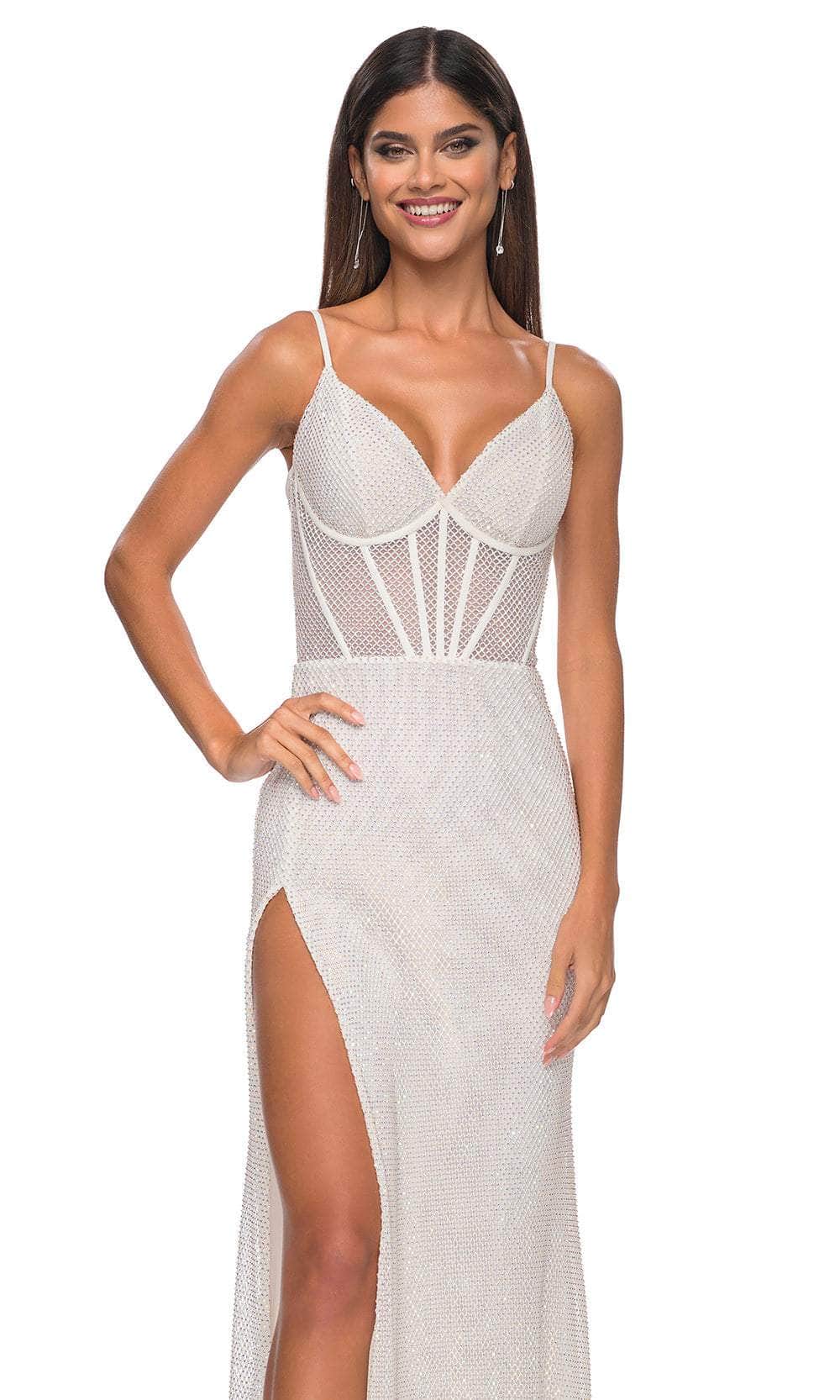 Unleash your inner goddess with this ethereal and enchanting La Femme 32285 creation. Flaunting a sculpted silhouette and graced with seams to enhance the natural curves of the female silhouette, this gown parades delicate spaghetti straps, structured with corset boning to ensure a flattering fit. Its elegant V-neckline accentuates the décolletage. Illusion midrise back creates an elegant silhouette, reinforced with corset boning for structure, while a concealed zipper closure ensures seamless fit. The gown features a natural waistline, accentuating curves, leading to a sleek sheath skirt. A high slit adds allure while maintaining elegance, flowing into a floor-length hem for a stunning silhouette. Flourish pure sophistication in this stunningly made La Femme 32285 masterpiece. Models are wearing the Gunmetal, Navy, and White colors.