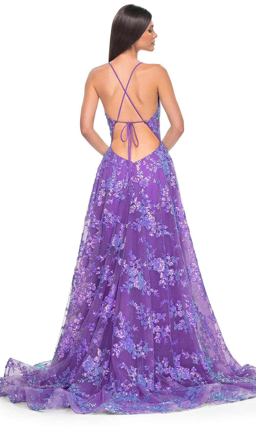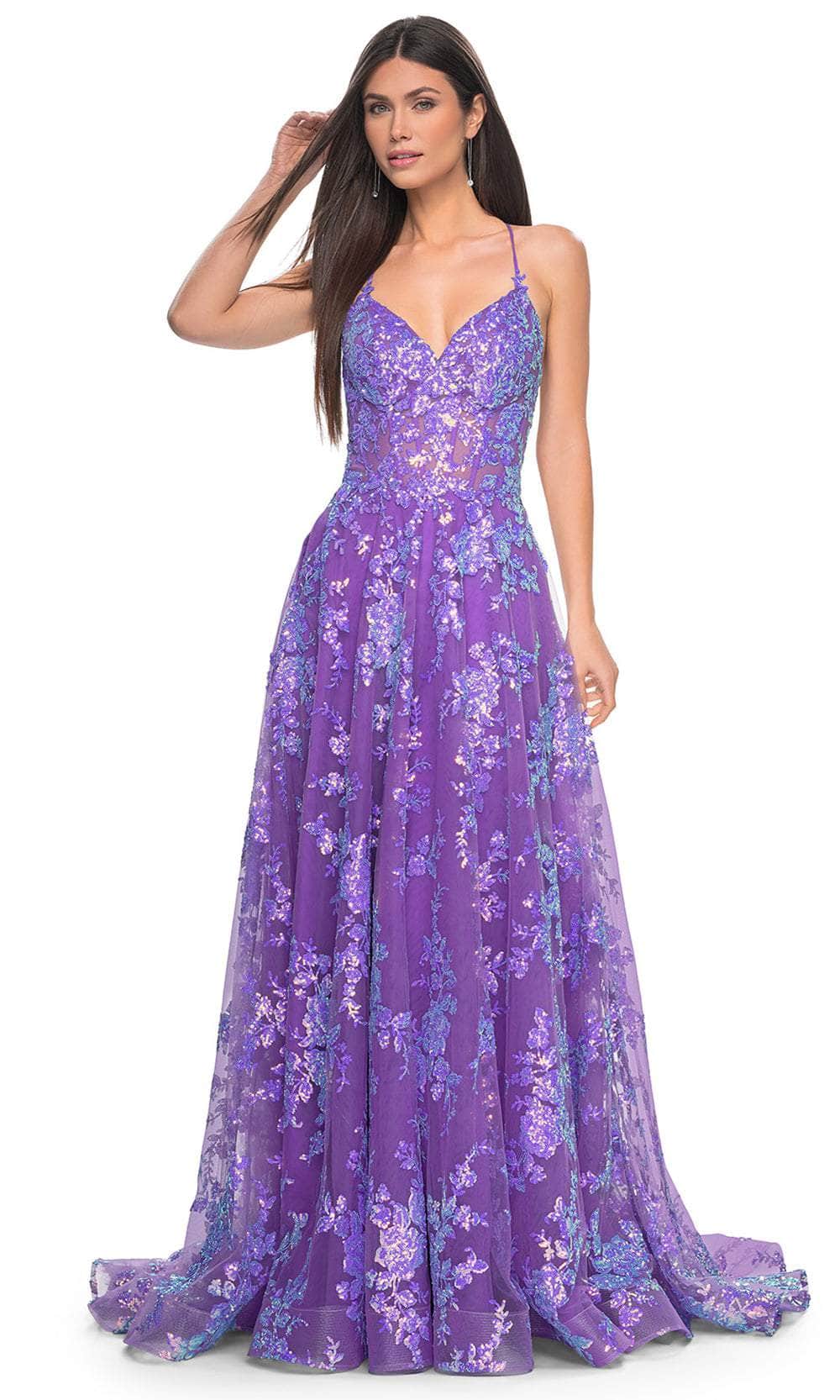 Everyone will pause and stare when you don this La Femme 32291 masterpiece. Dazzling sequins and lace appliques decorate the entire sleeveless bodice. It showcases a tantalizing deep v-neckline, see-through corset boning bodice and spaghetti straps. Adjusting the fit is rendered with the lace-up open back, which also gives a contemporary edge. The A-line skirt flows attractively to the full length hem, and splits on the side to elongate your legs. Glow all night in this fabulous La Femme 32291 gown. Model is wearing Purple color.