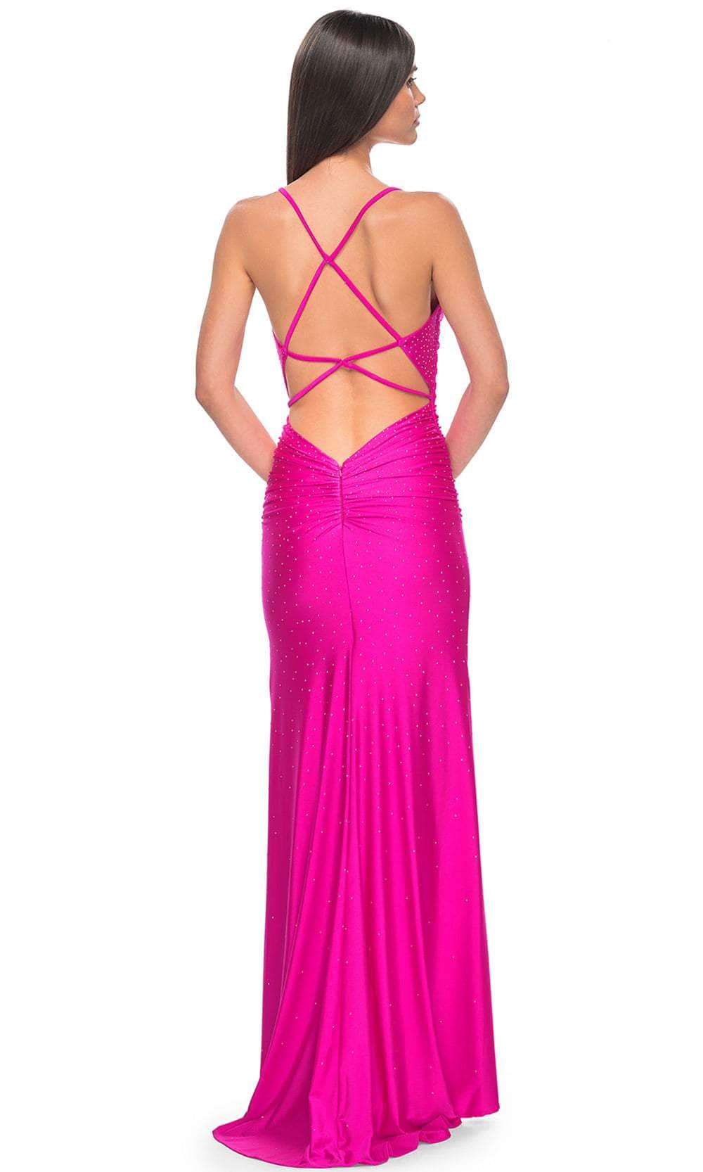 Fill the hall with warmth and light in this La Femme 32317 masterpiece. This irresistibly feminine gown is sleeveless and presents beaded rhinestone details for a touch of sparkle. To showcase your curves, the bodice has beautiful ruching. The deep v-neckline is supported by spaghetti straps, complemented by the open lace-up back that adds an unexpected twist. The skirt fashions a sheath silhouette that tapers to the full length hem and train. A thigh-high slit on the side reveals your seductive legs. Look like a celebrity in this La Femme 32317. Models are wearing Hot Fuchsia, Jade, and Royal Purple colors.