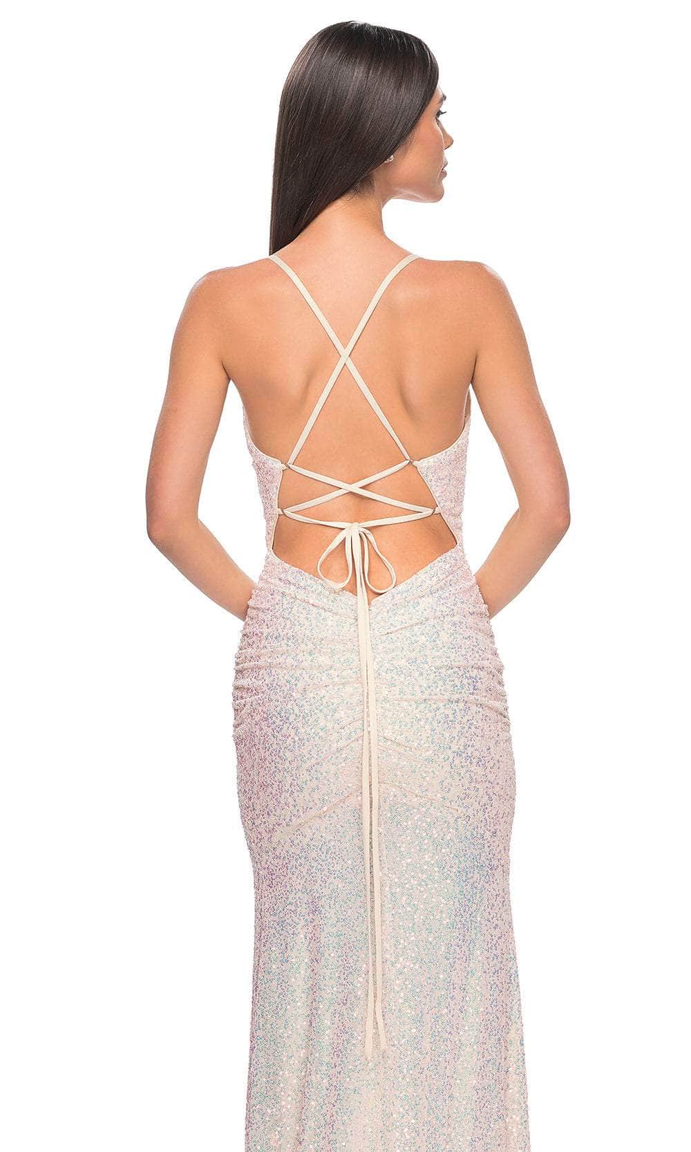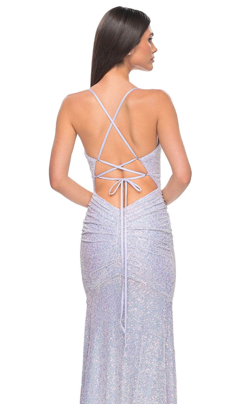 Radiate like a star in this La Femme 32331 masterpiece. This show-stopping dress is festooned with shimmery sequins all over its length, while the ruched detailing adds a touch of elegance and enhances your curves. The spaghetti straps outline the shoulders and make a strappy lace-up design at the open back. It also reveals an enticing v-neckline and thigh-high leg slit. Moulded in a flattering sheath silhouette, the skirt glides to the floor and exits with a small train for added drama. Display your best features as you enthrall the crowd in this La Femme 32331 creation. Models are wearing Lavender, Light Blush, and Nude colors.