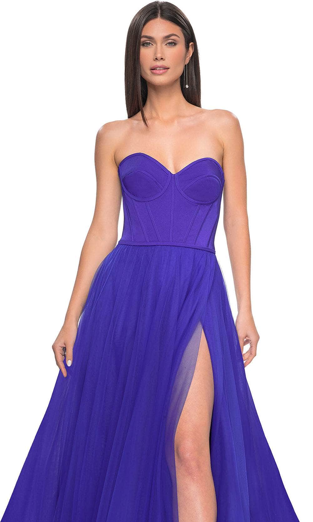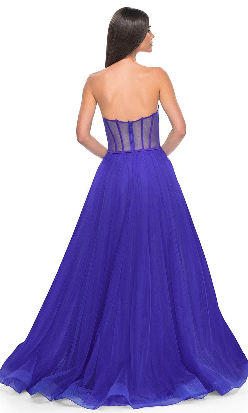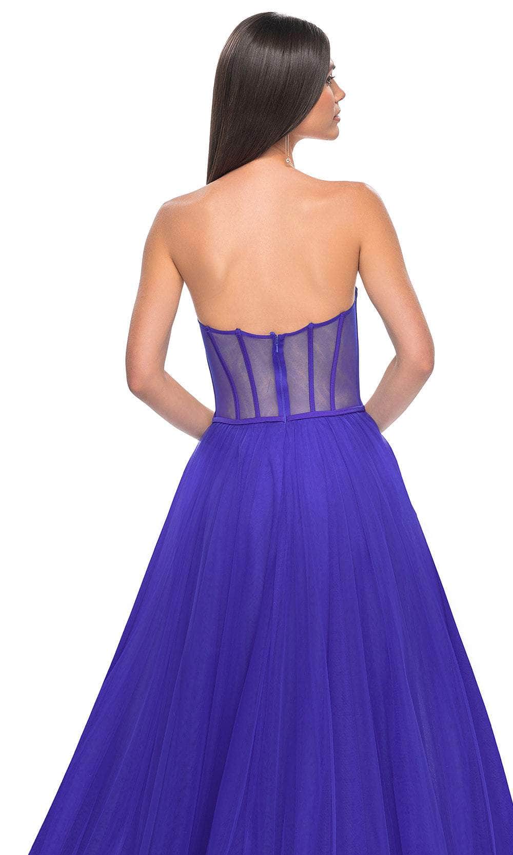 Walk into the ballroom in a fascinating classiness in this creation by La Femme 32424. This outfit presents a sweetheart neckline and satin corset bodice with exposed boning for a structured fit. The low sheer open back adds enticement as it reveals a hint of your skin. It also includes a back zipper closure for easy wearing and a thin waistband. A daring high slit brings a graceful movement, and the tulle skirt streams down to the floor in an A-line shape. Fall in love when you wear with this La Femme 32424 masterpiece. Models are wearing Red, and Royal Blue colors.