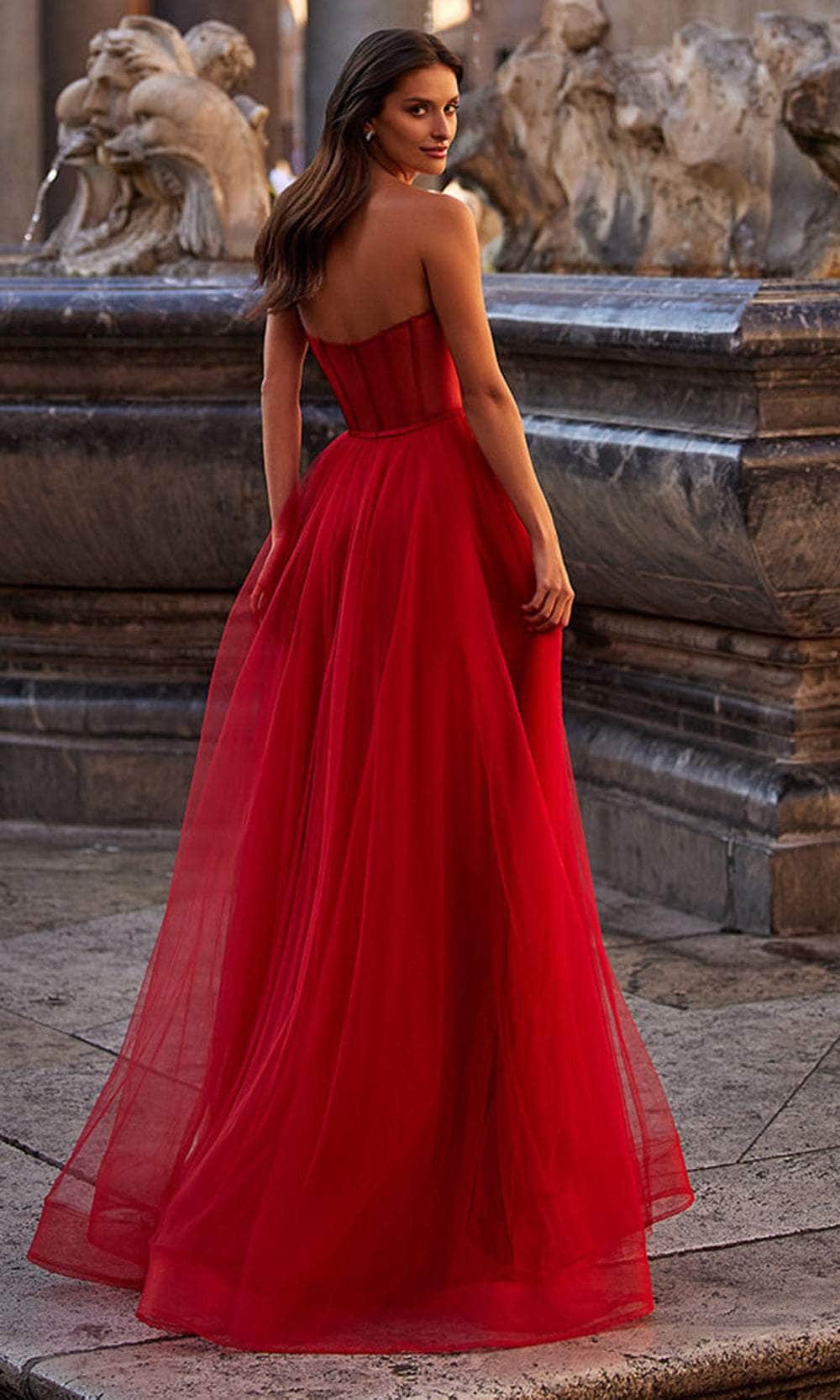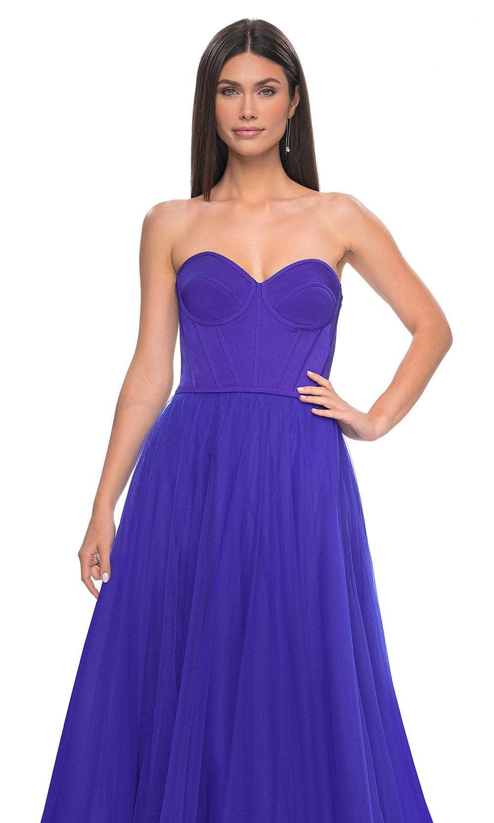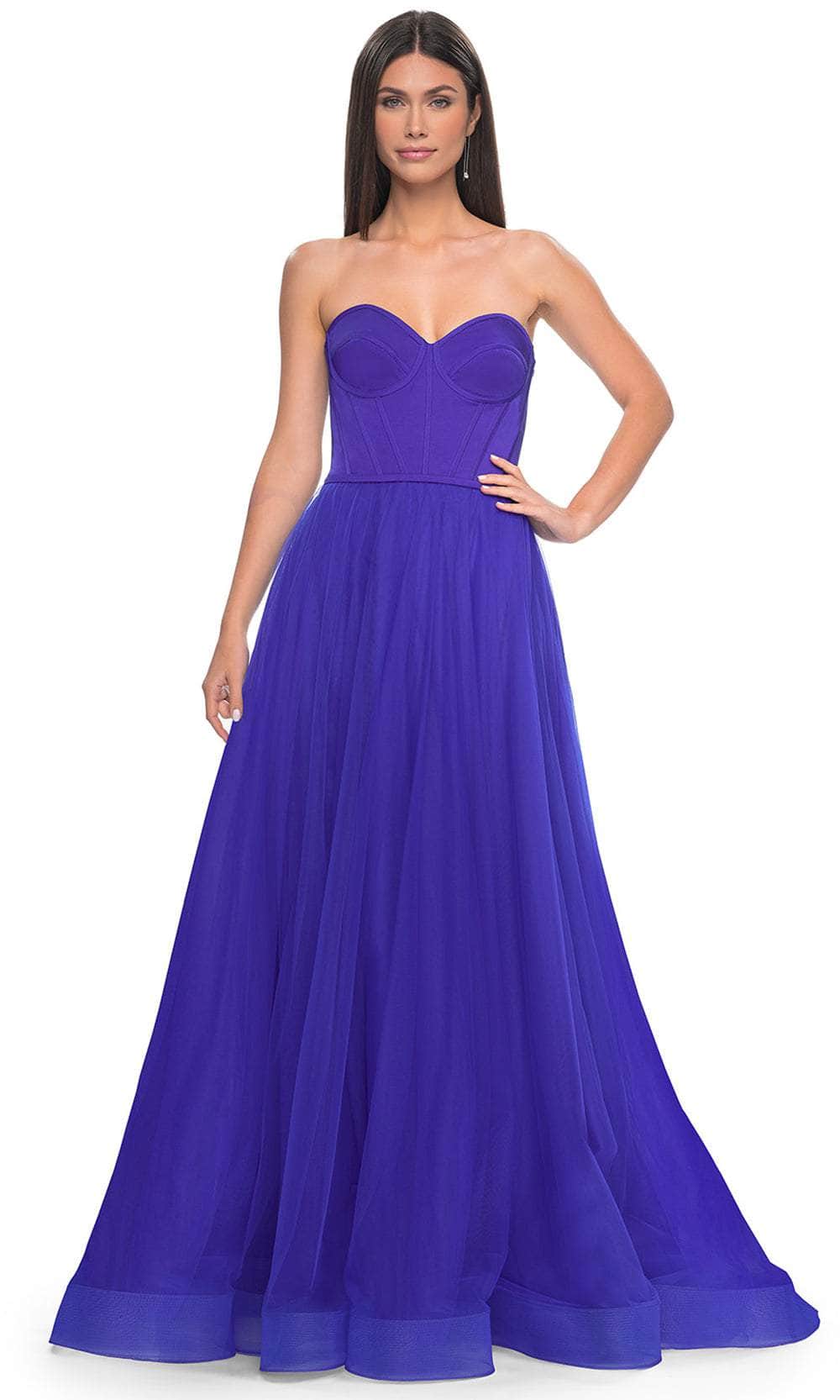 Walk into the ballroom in a fascinating classiness in this creation by La Femme 32424. This outfit presents a sweetheart neckline and satin corset bodice with exposed boning for a structured fit. The low sheer open back adds enticement as it reveals a hint of your skin. It also includes a back zipper closure for easy wearing and a thin waistband. A daring high slit brings a graceful movement, and the tulle skirt streams down to the floor in an A-line shape. Fall in love when you wear with this La Femme 32424 masterpiece. Models are wearing Red, and Royal Blue colors.