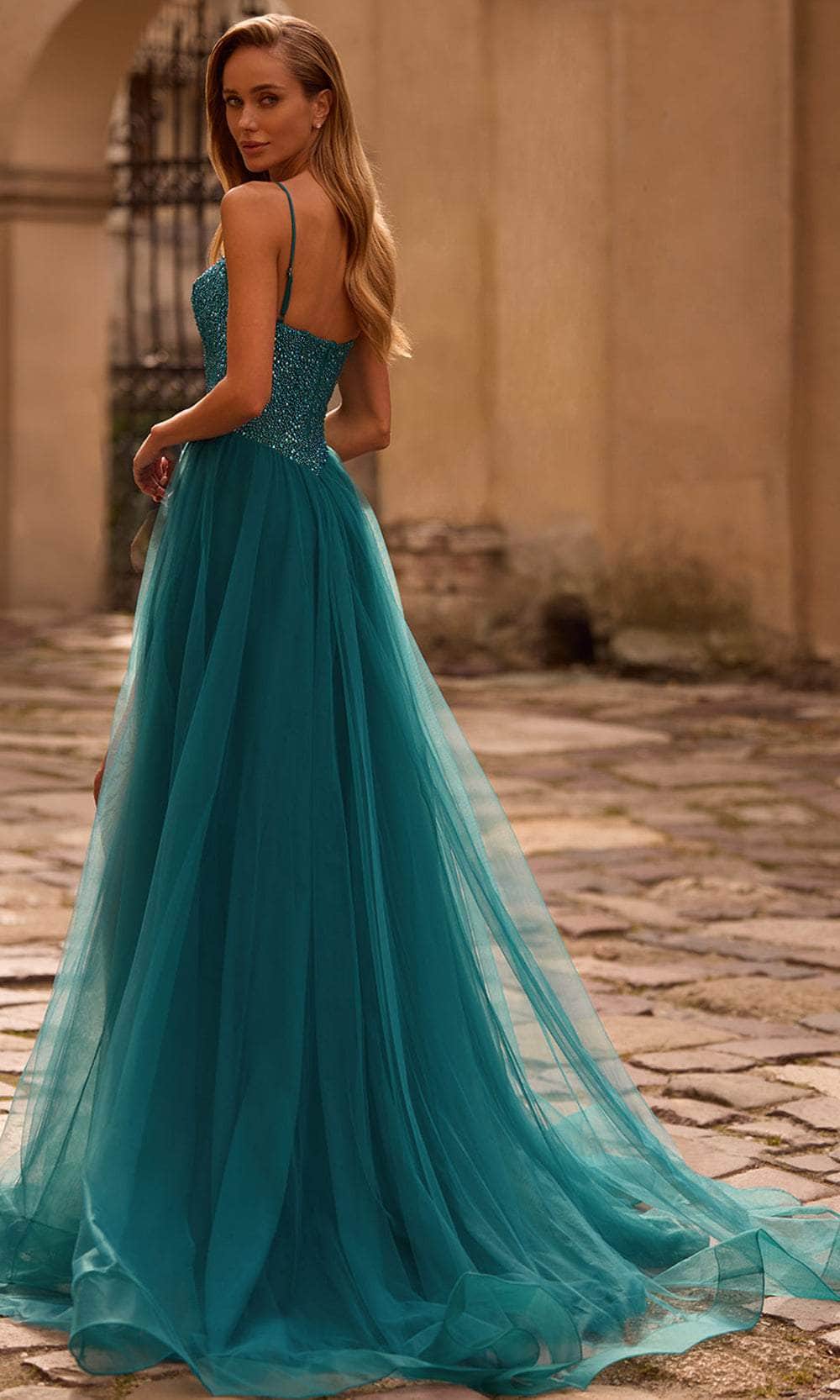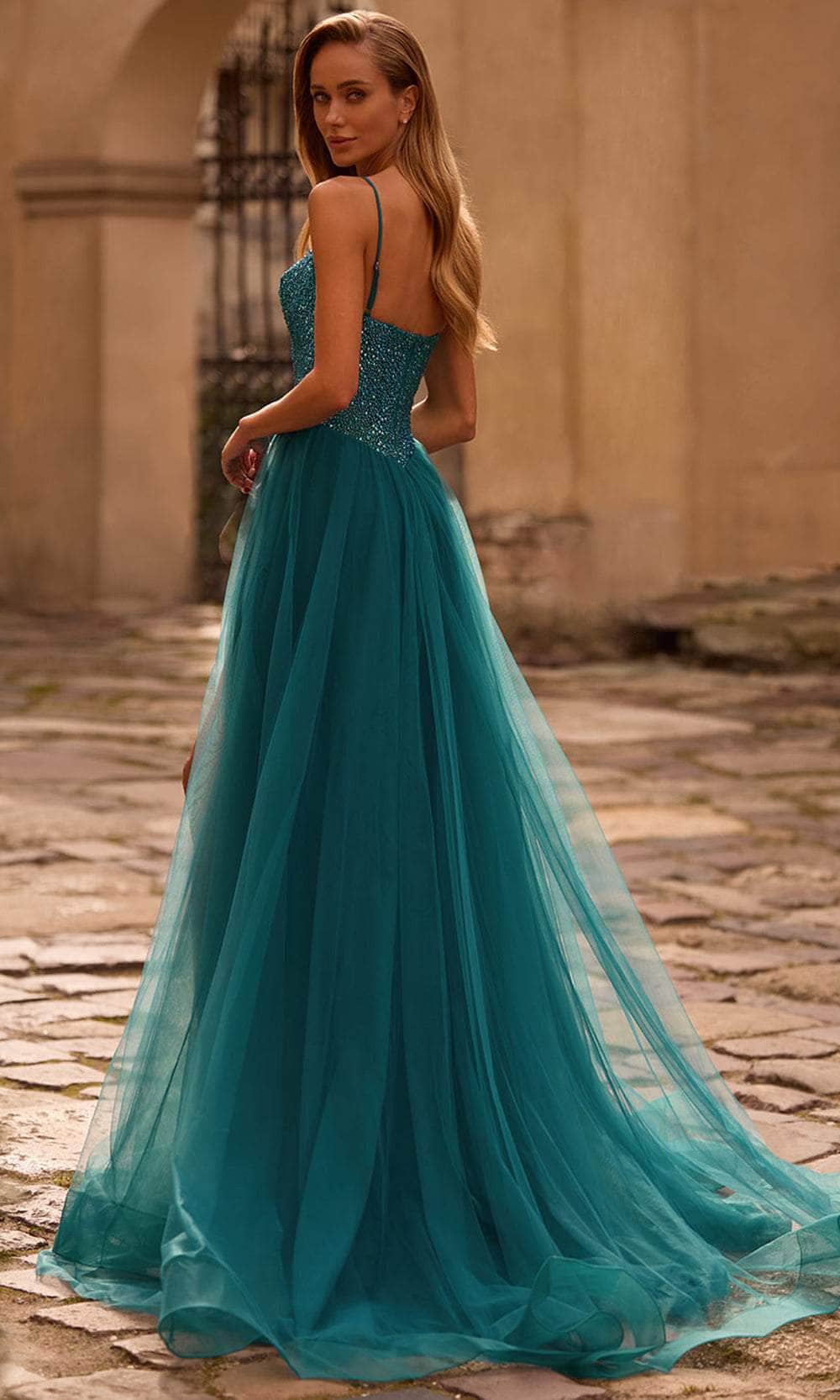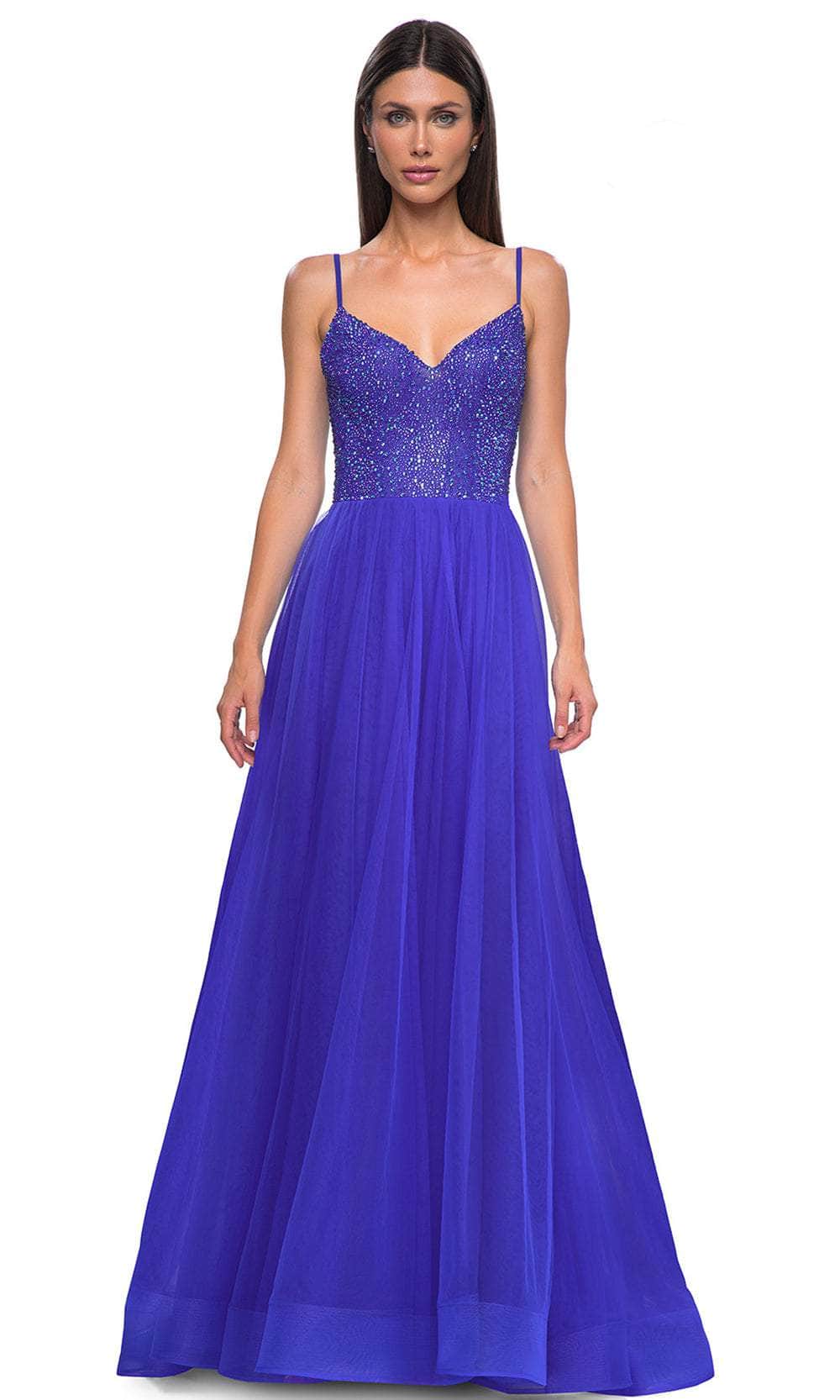 Look chic and seductive in this marvelous La Femme 32668 prom dress, a stunning choice for any formal event. This beautiful dress features a rhinestone embellished sleeveless fitted bodice adorned with thin spaghetti straps, offering a touch of sparkle and sophistication. The full A-line tulle skirt is designed with a high slit and convenient pockets, providing both style and functionality. The skirt gracefully ends with a train, adding a dramatic and enchanting element to the gown. The back zipper closure ensures a secure and comfortable fit. Be the highlight of the evening with this La Femme 32668. Models are wearing Dark Teal and Royal Blue colors.