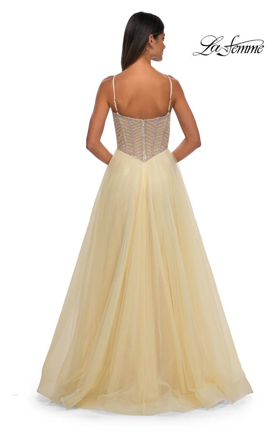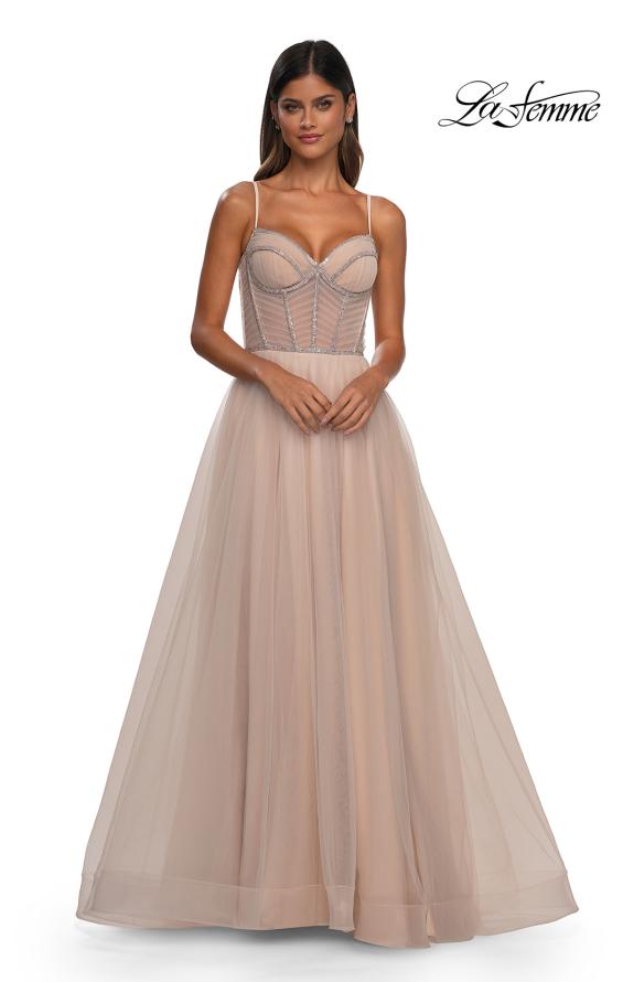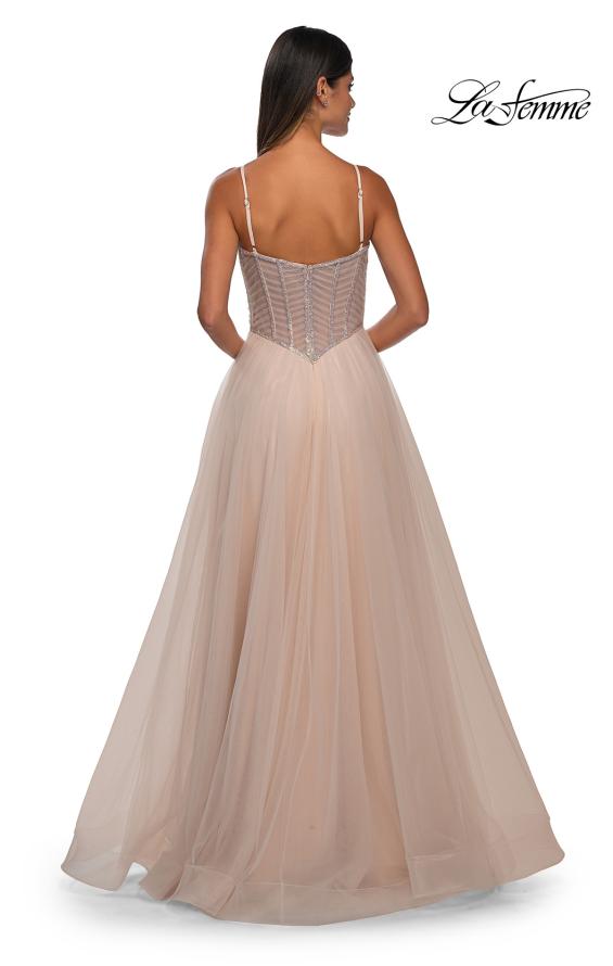 Make a striking entrance with the La Femme 32675 gown, a unique A-line tulle dress perfect for any formal event. This enchanting gown features a high slit and convenient pockets, adding both allure and functionality to its design. The bodice showcases an intricate ruched design, beautifully outlined with sparkling rhinestone details that accentuate the corset top. The back zipper closure ensures a secure and comfortable fit. Combining elegance with modern sophistication, this La Femme 32675 promises to make you the center of attention, exuding grace and style with every step. Models are wearing Light Periwinkle and Black colors.