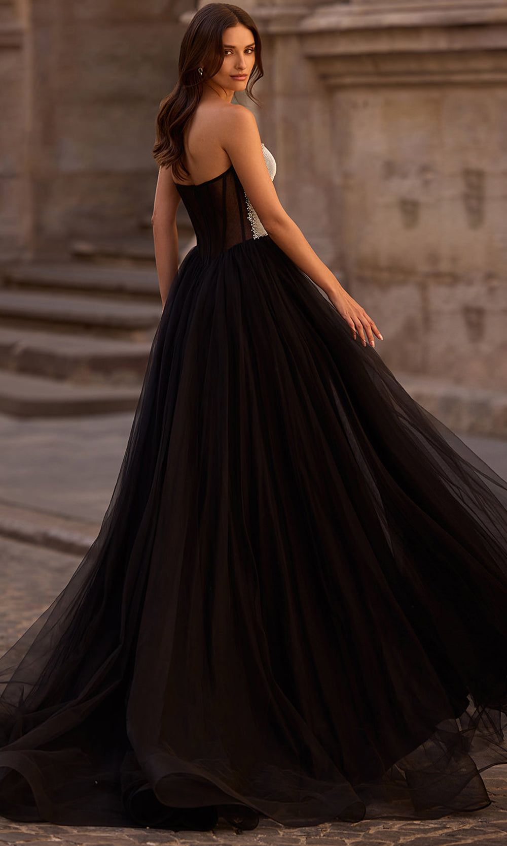 | Details: | Embellished Bodice, Strapless, Fitted Bodice, Exposed Boning, Back Zipper Closure, Slit, Train, Horsehair Hem |