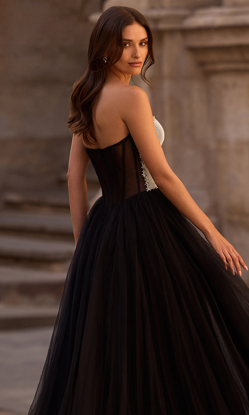 Display your glamour with the La Femme 32704 gown. This exquisite A-line tulle dress features a voluminous skirt complete with pockets, making it both stylish and functional. The gorgeous top is fully adorned with rhinestones, and the cups are accented with larger stones for added brilliance. The back design includes a sheer corset style with exposed boning, offering a modern and alluring look. Secured with a back zipper closure, this floor-length dress ensures a flawless fit. Ideal for any formal event, the La Femme 32704 dress combines classic beauty with contemporary flair, making it an unforgettable choice for your special night. Model is wearing Black color.